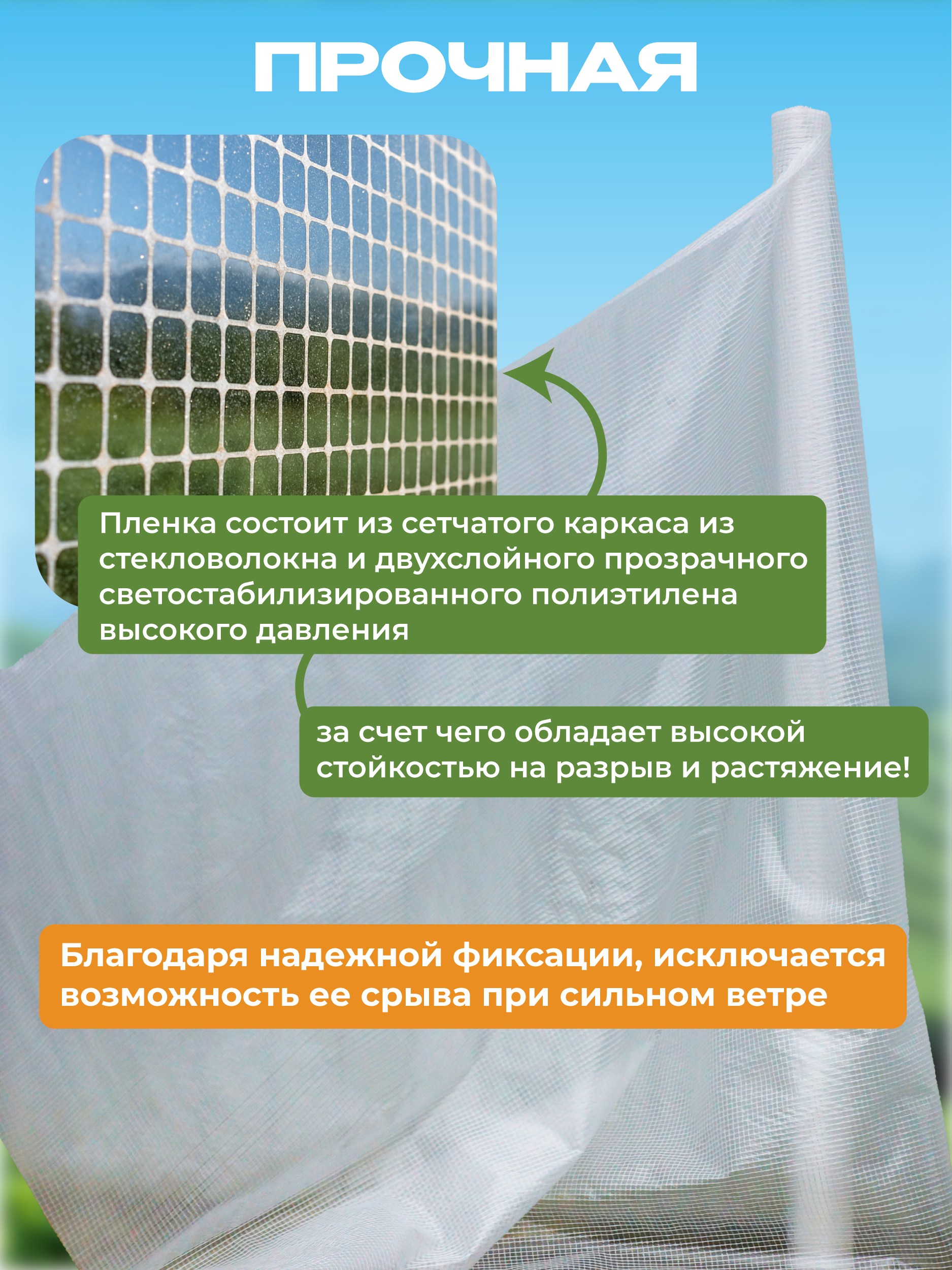 Армированная пленка 120 гр/м2 размером 2х50 м используется при проведении ремонтных работ, в строительстве и сельском хозяйстве для обеспечения тепло и гидроизоляции за счет особой структуры материала. Пленка состоит из сетчатого каркаса из стекловолокна и двухслойного прозрачного светостабилизированного полиэтилена высокого давления, за счет чего обладает высокой стойкостью на разрыв и растяжение. Выдерживает перепады температур от — 40 до + 90 С. Устойчива к ультрафиолету. Безопасна, не выделяет вредных веществ.