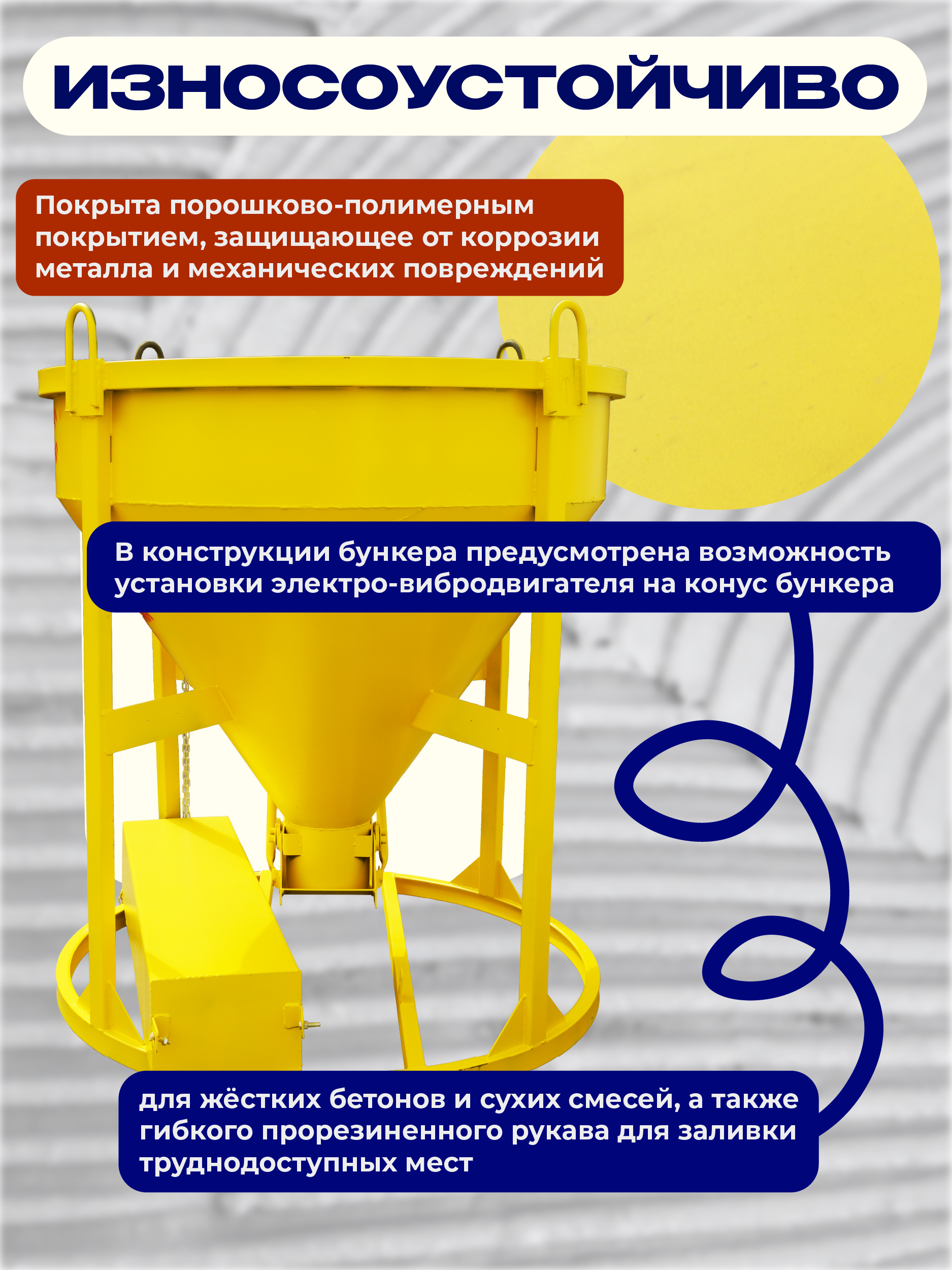 В конструкции бункера предусмотрена возможность установки электро-вибродвигателя на конус бункера для жёстких бетонов и сухих смесей, а также гибкого прорезиненного рукава для заливки труднодоступных мест.