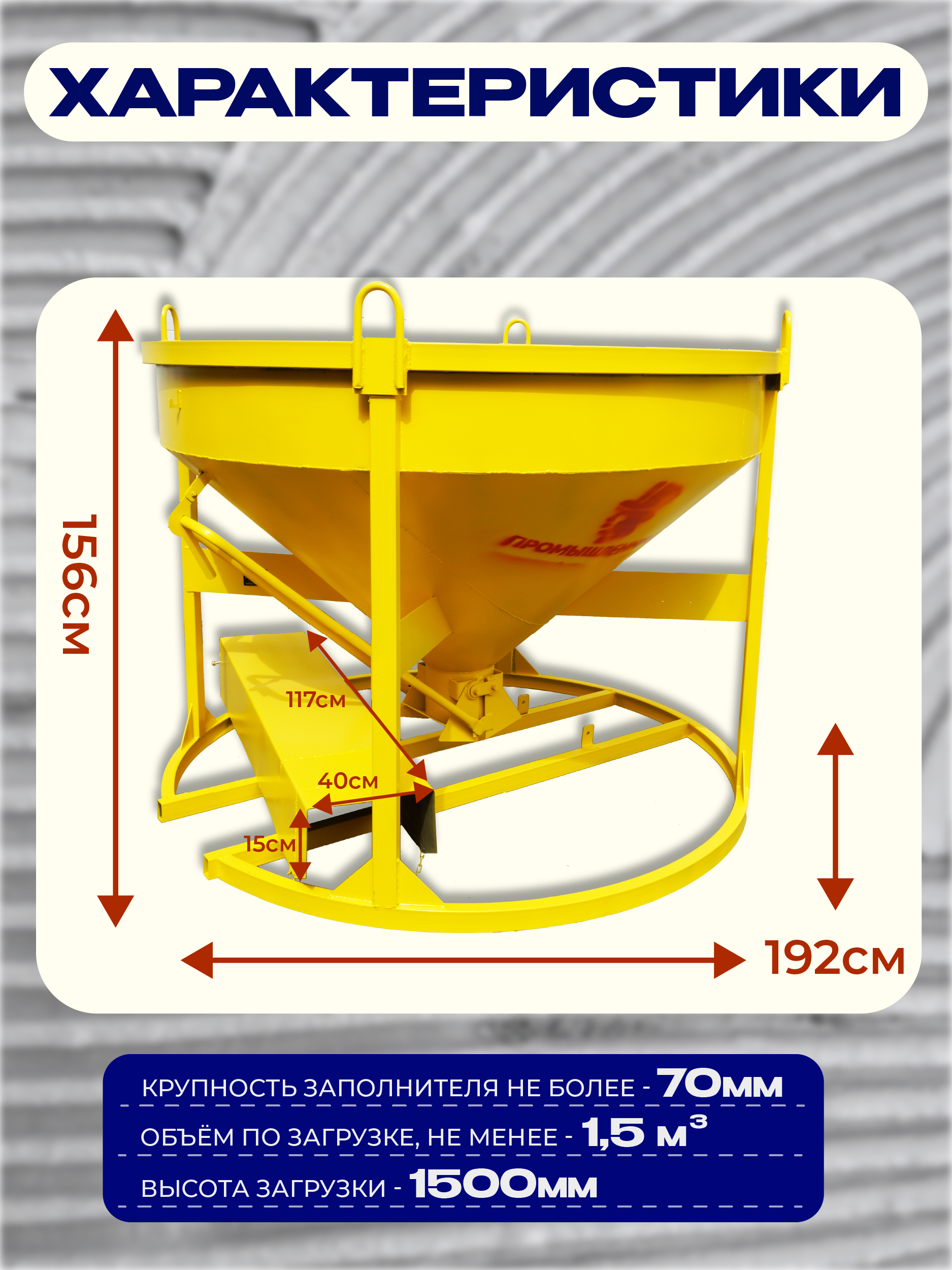 Бункер бетонной массы БН используется для транспортировки и выгрузки бетонов, а также для удобной заливки как бетонных перекрытий, так и колонн монолитно-каркасных конструкций.