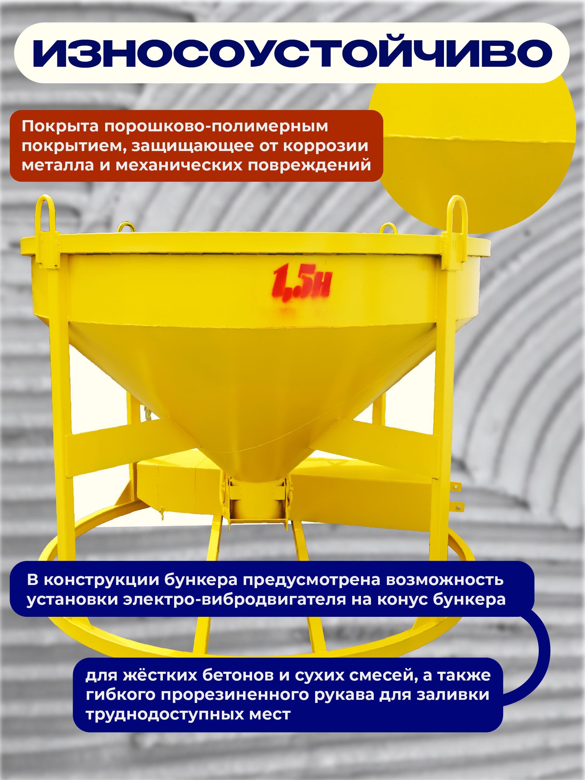В конструкции бункера предусмотрена возможность установки электро-вибродвигателя на конус бункера для жёстких бетонов и сухих смесей, а также гибкого прорезиненного рукава для заливки труднодоступных мест.