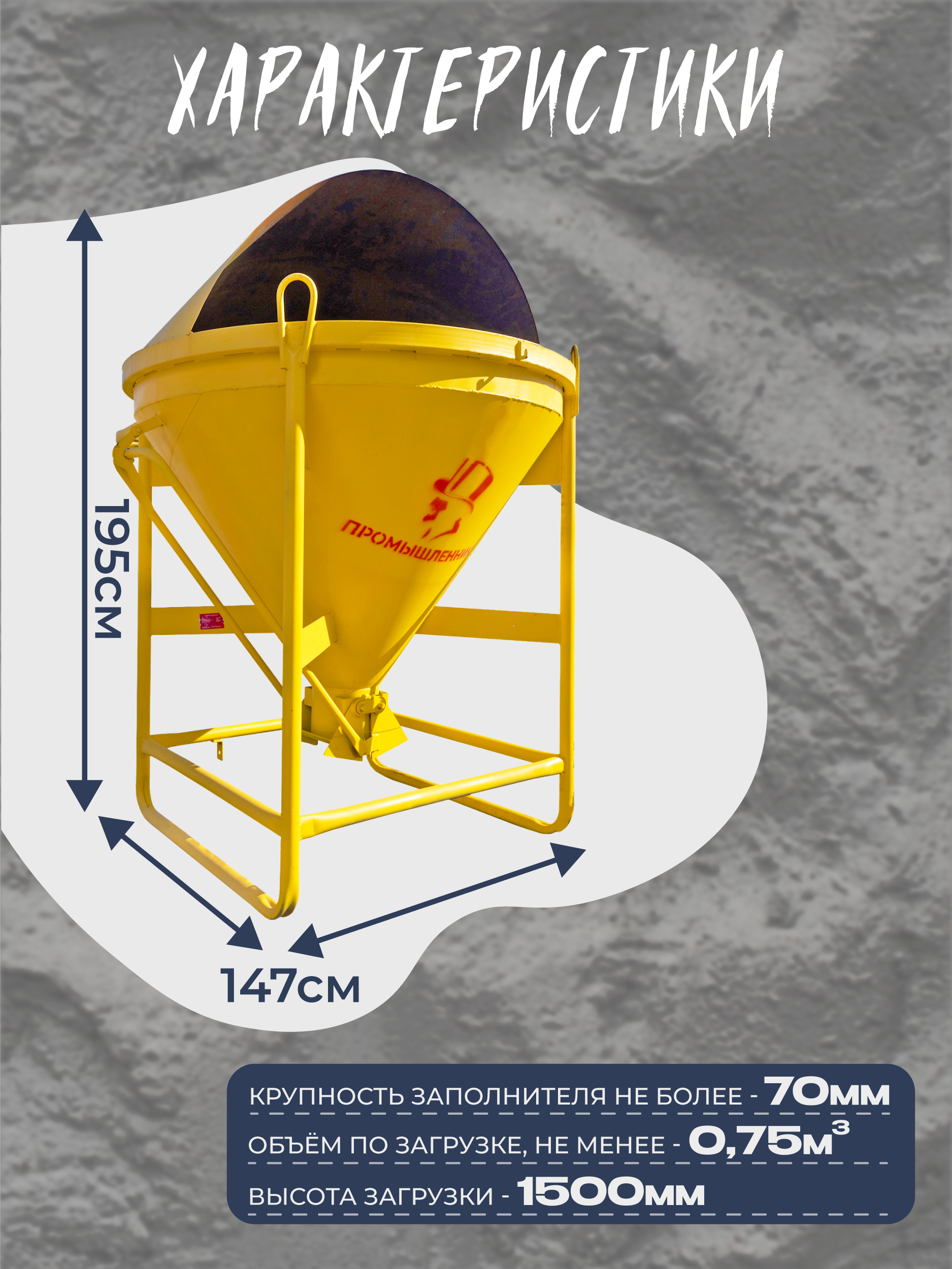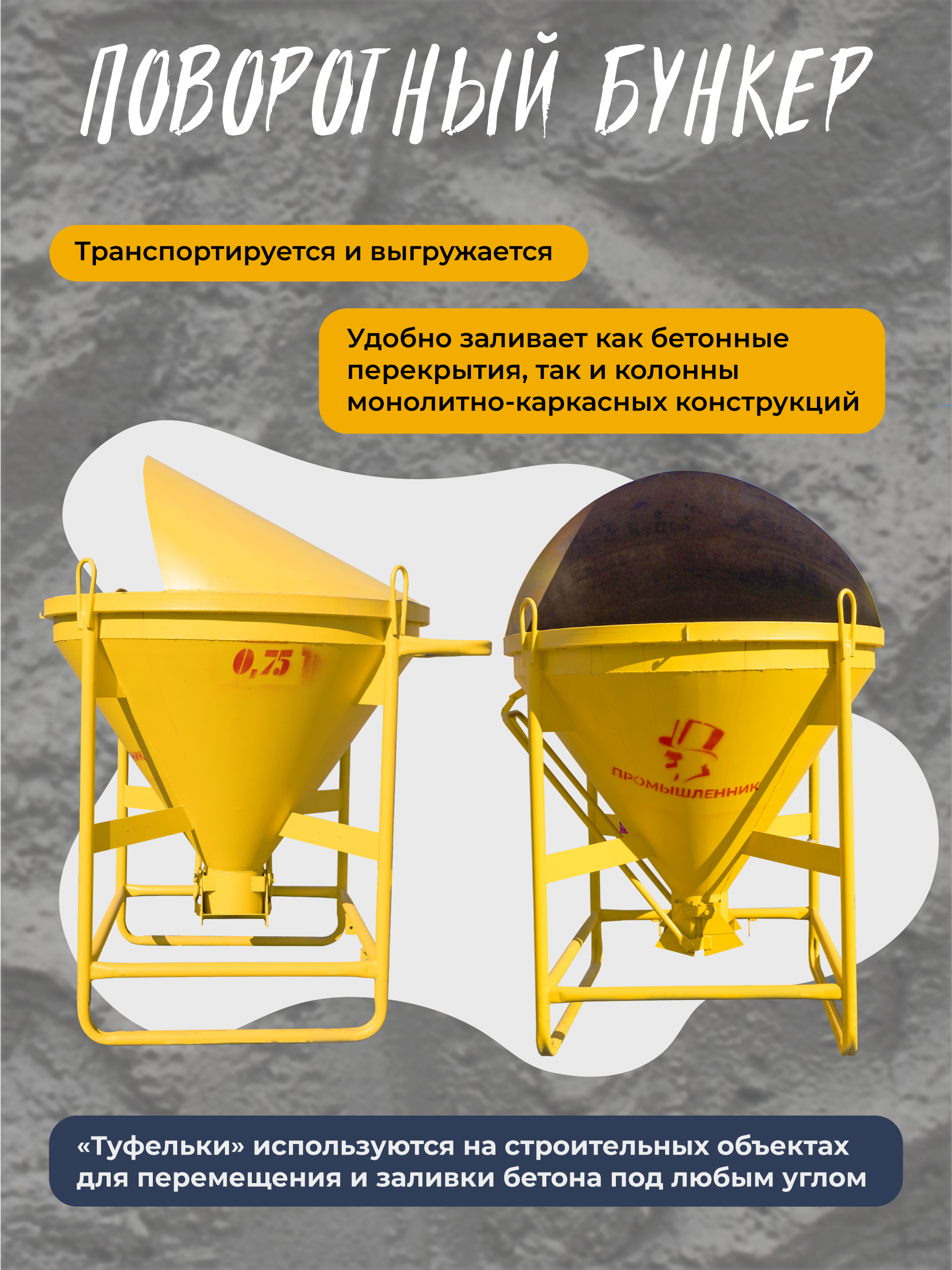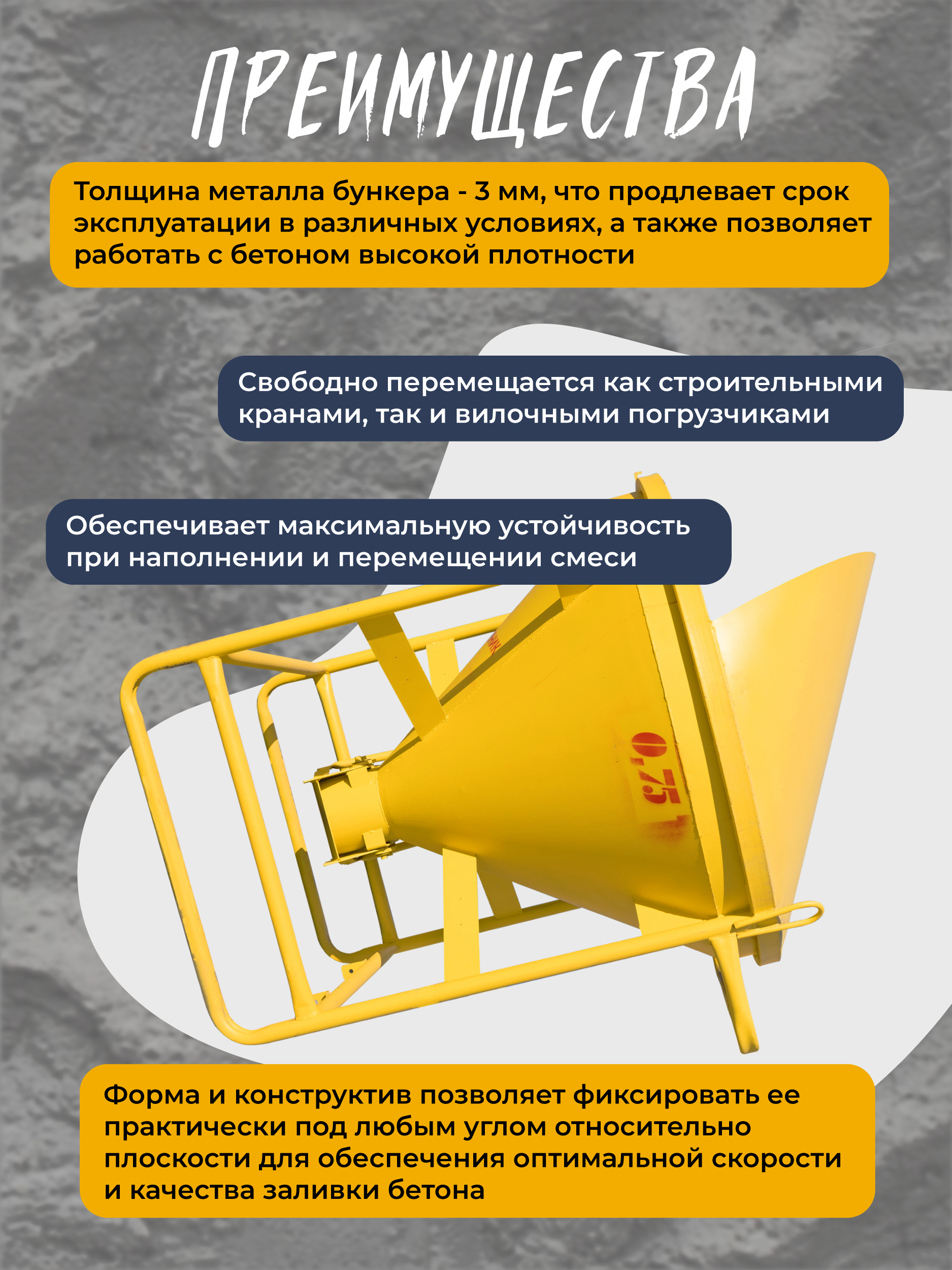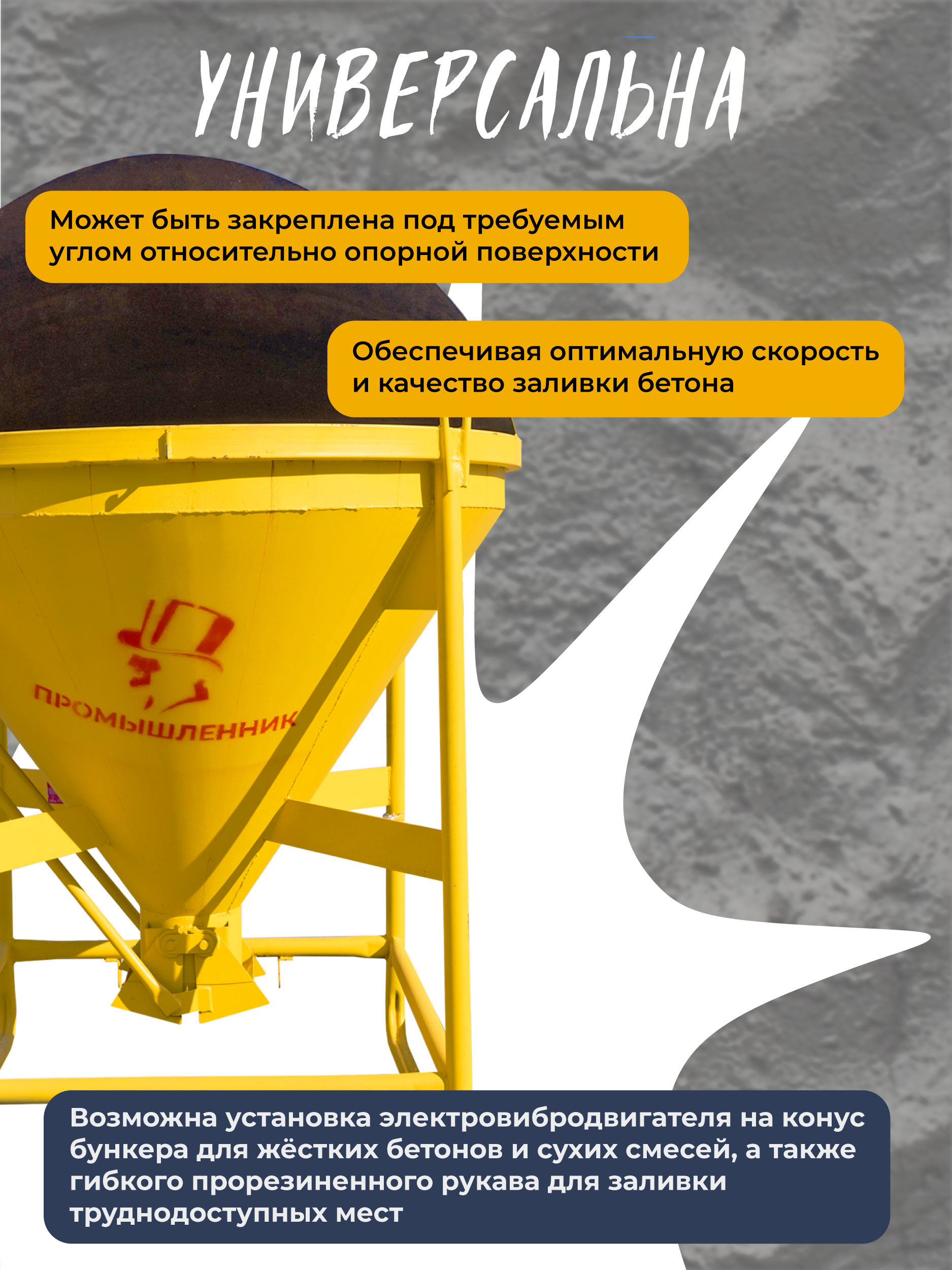 В конструкции бункера предусмотрена возможность установки электровибродвигателя на конус бункера для жёстких бетонов и сухих смесей, а также гибкого прорезиненного рукава для заливки труднодоступных мест.