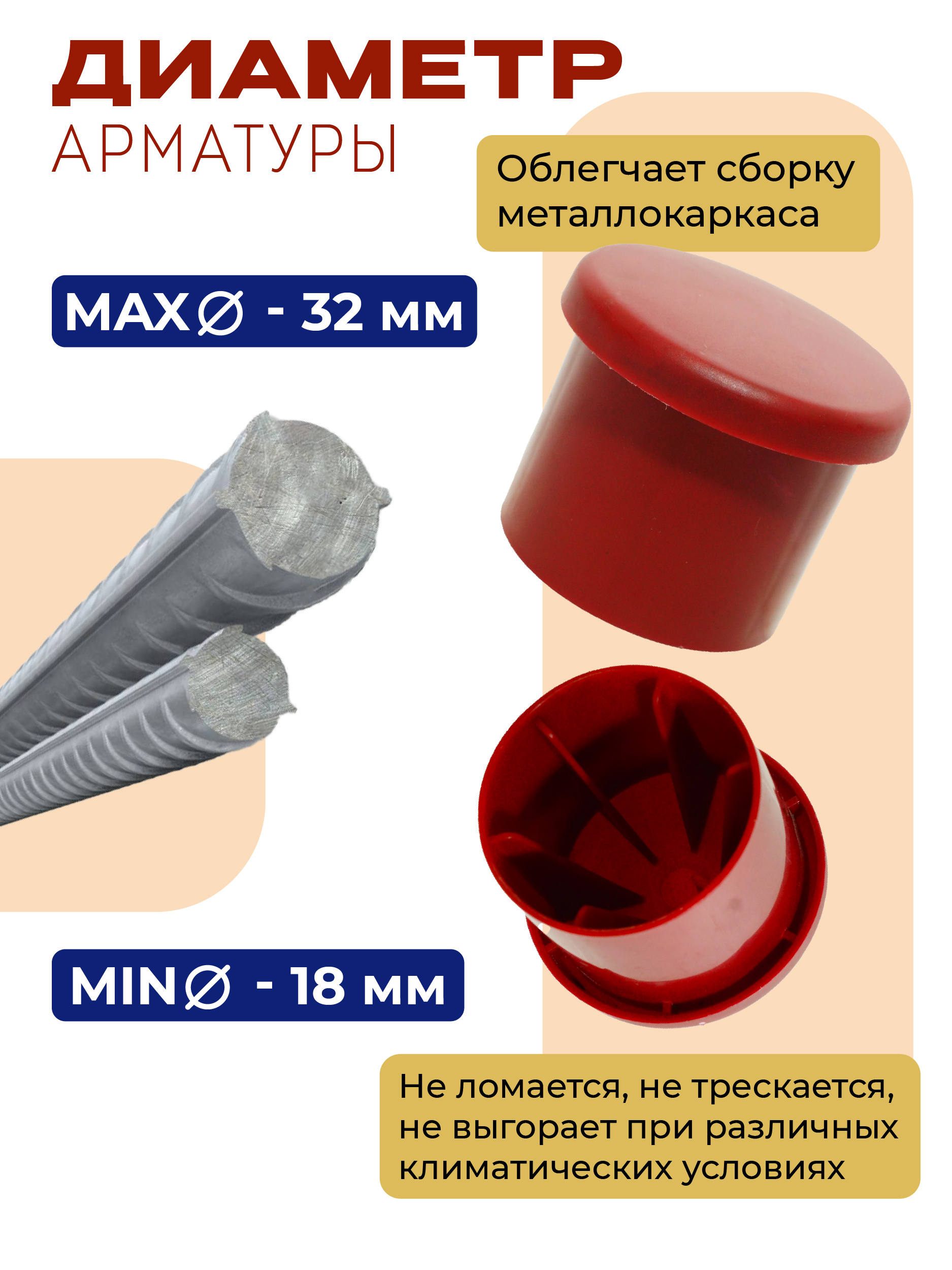 Защитный колпачок 18-32 изготовлен из прочного цветного пластика, позволяя разглядеть его даже в темное время суток. Одевается на концы арматуры: защищает людей от проколов, царапин, ран, а также арматуру от коррозии металла. Расход колпачков из расчета 1 шт. на 1 край арматуры. Изготовлен из прочного морозостойкого пластика, благодаря чему может использоваться при проведении монолитных работ даже в зимнее время года.