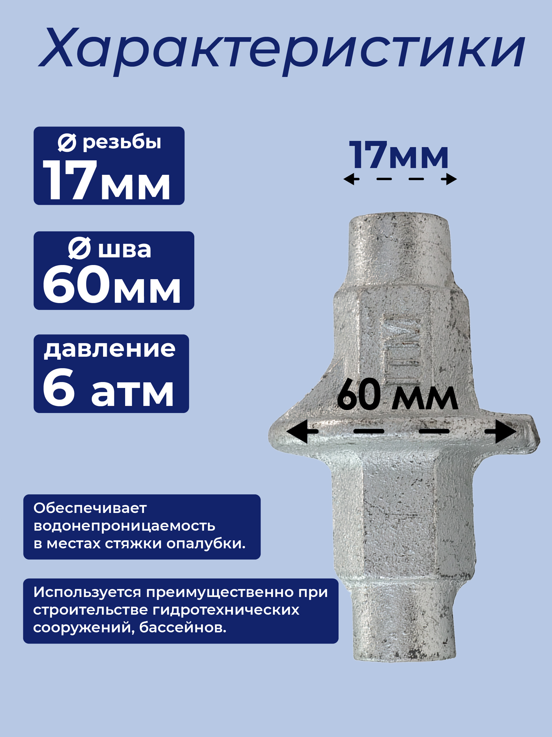 Гайка-ватерстоп используется при монолитном строительстве. Выдерживает нагрузку водяного столбба до 6 атмосфер. Проста в установке — изготовлена в виде шестигранной головки диаметром 30 мм. Внутренняя резьба — 17 мм.