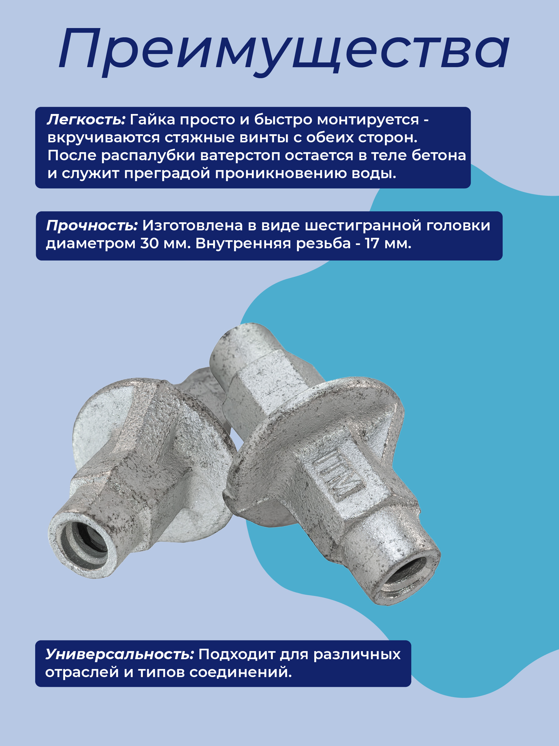 Гайка-ватерстоп используется при монолитном строительстве. Выдерживает нагрузку водяного столба до 6 атмосфер. Проста в установке — изготовлена в виде шестигранной головки диаметром 30 мм. Внутренняя резьба — 17 мм.