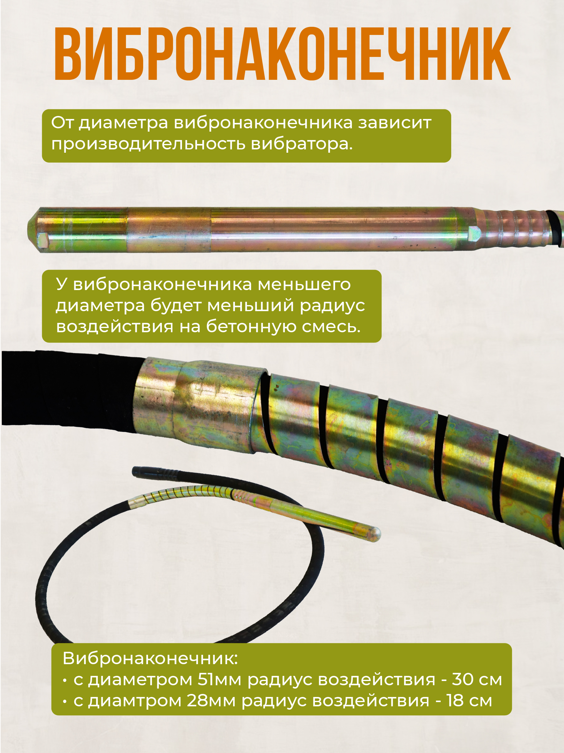 Совместим с глубинными вибраторами ЭП-1400 и ЭП-2200 и вибронаконечниками диаметром 28 мм.