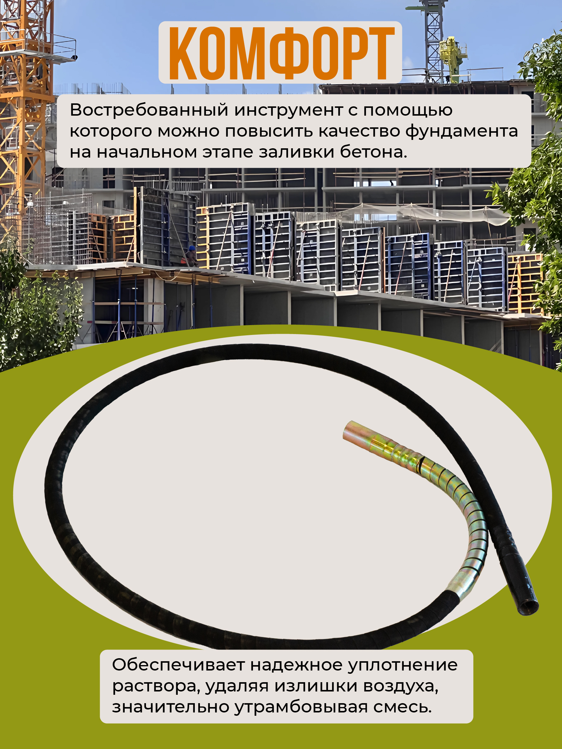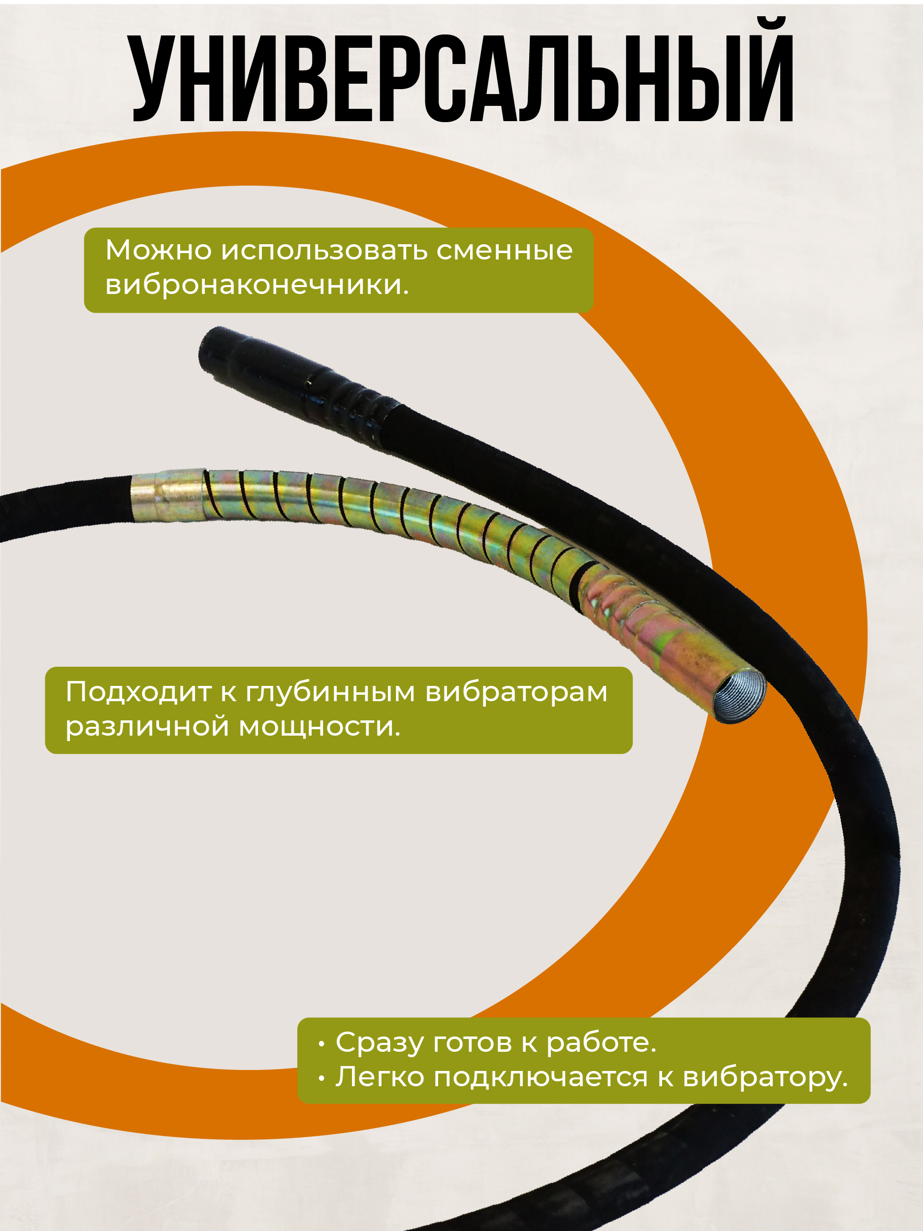 Гибкий вал совместим с наконечниками диаметром 38 мм. Является составной частью глубинного вибратора. Передает колебательные движения от двигателя наконечнику.