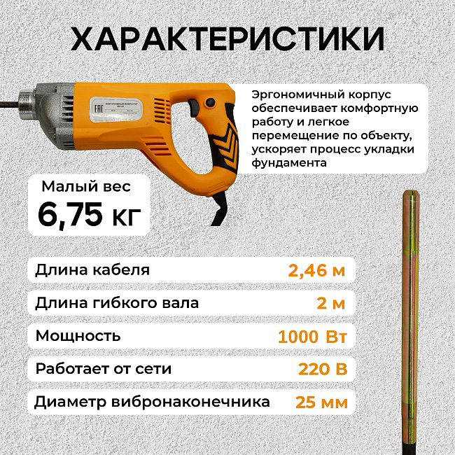 Глубинный вибратор для бетона ВЭ-25 с УЗО кабель 3м, 1000Вт, 220В гибкий вал 2м наконечник в комплекте используют практически на всех объектах строительства. С помощью электроприводного глубинного вибратора уплотняют бетонные смеси во время заливки железобетонных изделий и конструкций. Электрический ручной вибратор используется при установке монолитных плит, основы для бордюров, садовой плитки, тротуарной плитки, площадки, перекрытий, стен, заборов, балок, бассейнов, лестниц, несущих колонн. При производстве изделий на заводе их устанавливают на специальном вибростоле, который и утрясает бетон, плотно укладывая его.