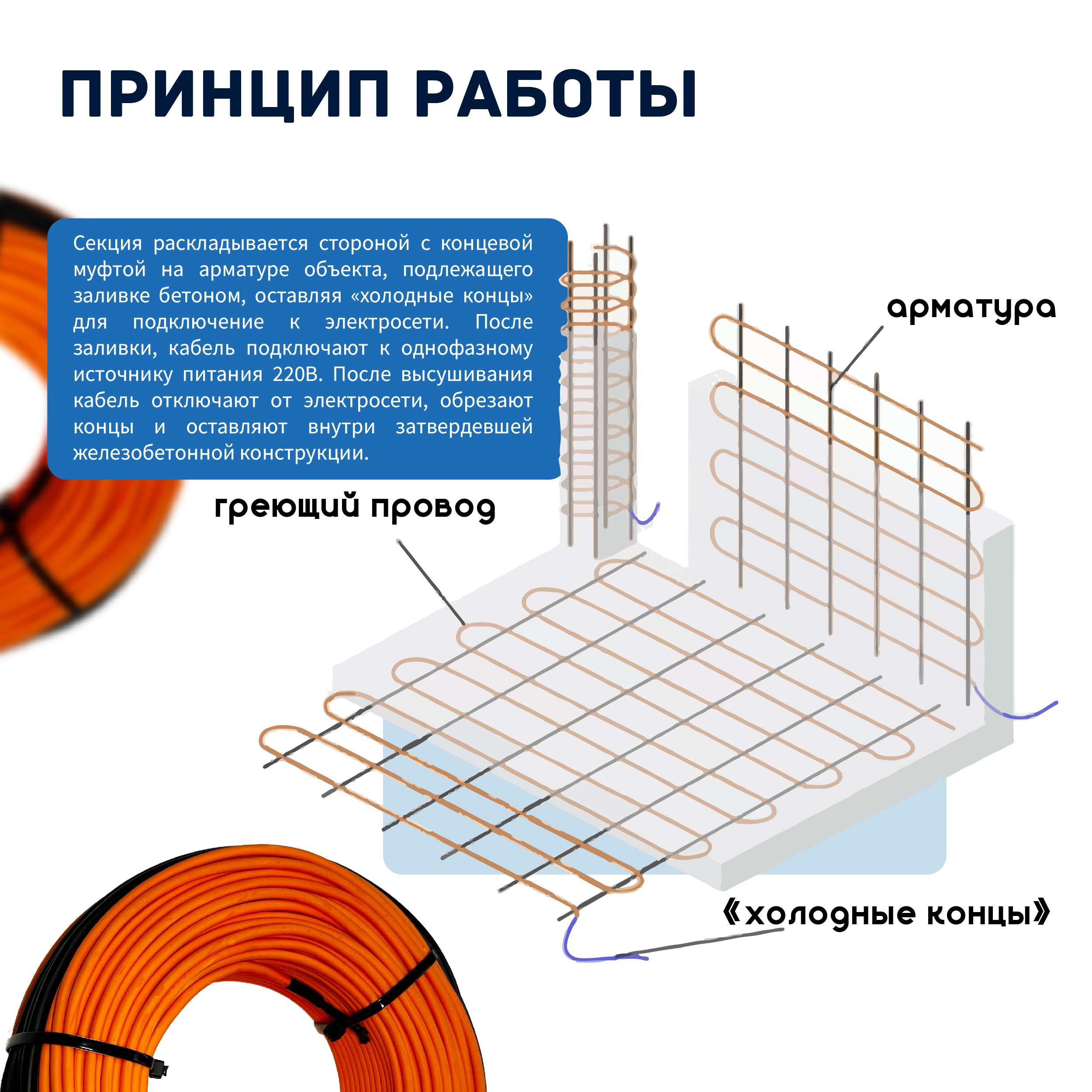 Секция раскладывается стороной с концевой муфтой на арматуре объекта, подлежащего заливке бетоном, оставляя свободными концы для подключение к электросети. После заливки, кабель подключают к однофазному источнику питания 220 В. После высушивания кабель отключают от электросети, обрезают концы и оставляют внутри затвердевшей железобетонной конструкции.