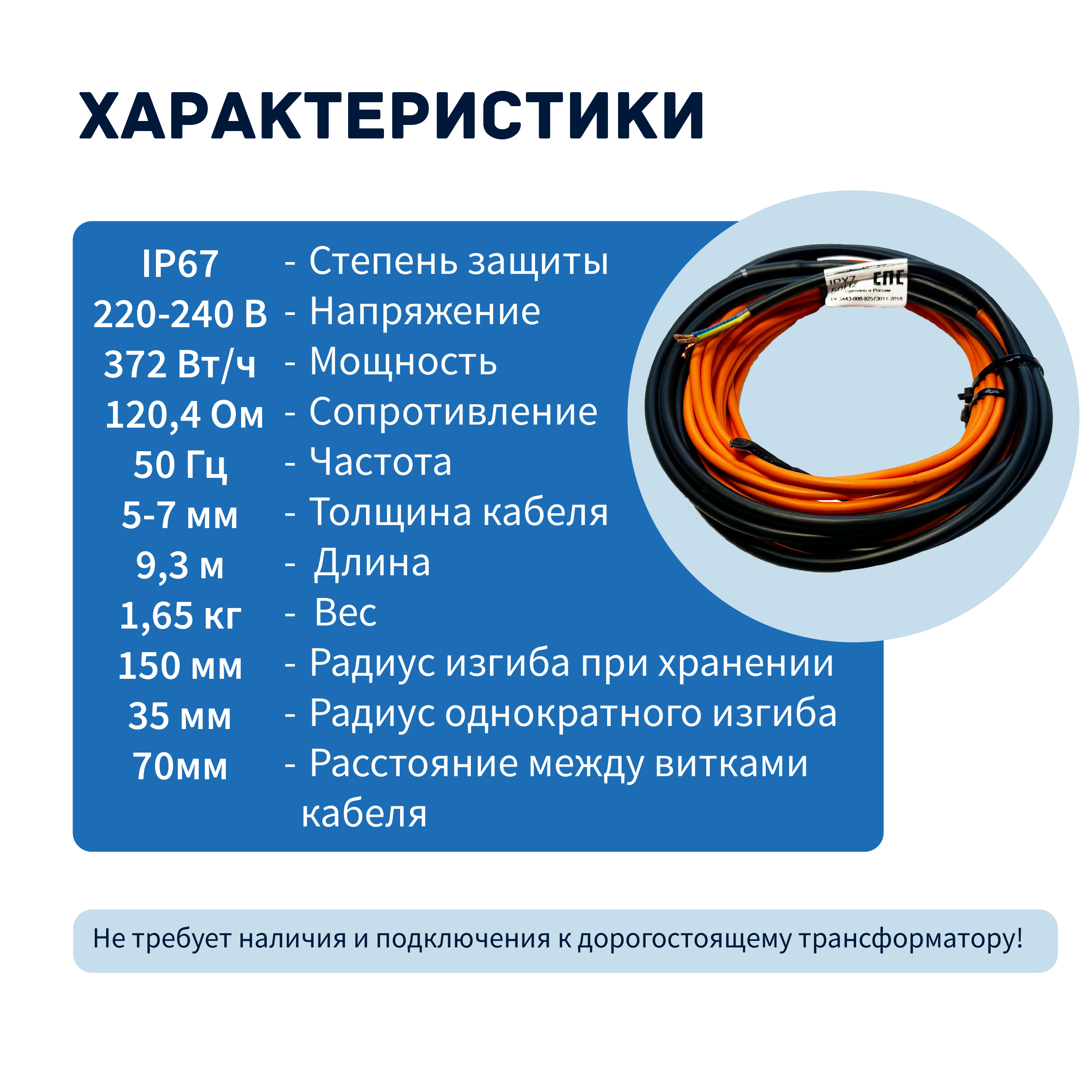 Кабель для прогрева бетона 40КС-9 используется для ускорения застывания бетонной смеси и обогрева железобетона в холодное время года. Состоит из двухжильного резистивного провода с концевой муфтой с одной стороны и установочной части с соединительной муфтой с другой стороны, уложенных в виде нагревательной секции длиной 9 м. Работает от обычной сети 220-240 В, не требует наличия и подключения к дорогостоящему трансформатору. Степень защиты IP67. Суммарная мощность обогрева секции 372 Вт/ч.