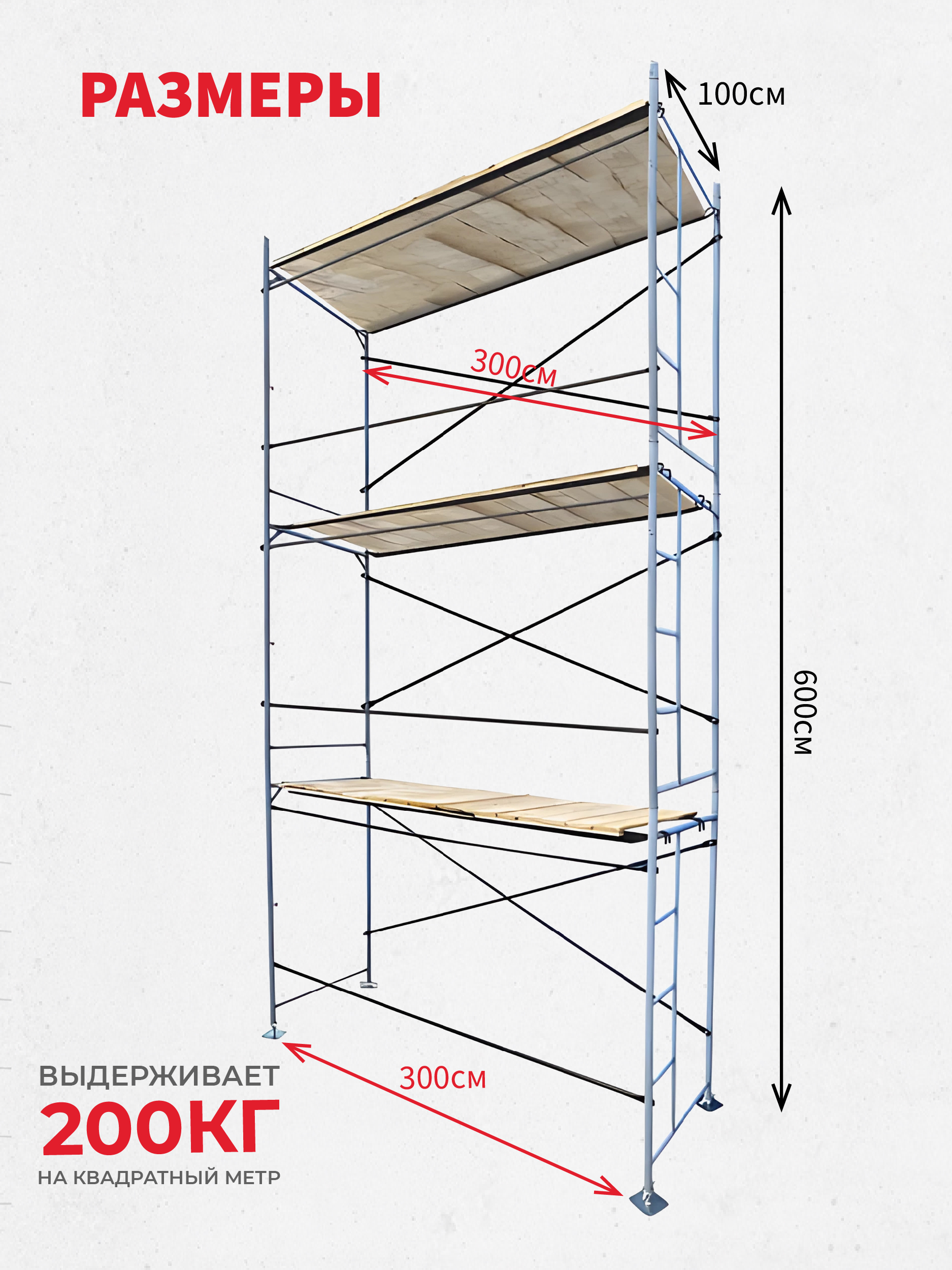Горизонтали, установленные в соответствующие места, в комбинации с диагоналями являются ограждением рабочей зоны. Материал — сталь, защита от коррозии – полимерное порошковое покрытие. Таким образом используя связи различной длины можно устанавливать шаг рам вдоль стены 2 или 3 м. В комплекте предусмотрен настил из дерева.