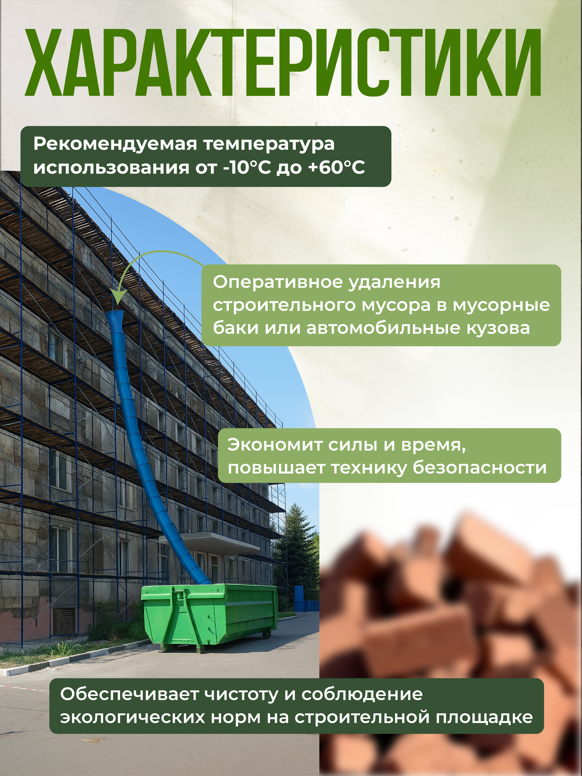 Мусоросброс строительный предназначен для оперативного удаления строительного мусора непосредственно в мусорные баки или автомобильные кузова. Располагается вертикально вдоль оконных проемов строящегося или ремонтируемого здания. Экономит человеческий и временной ресурс, повышает технику безопасности, обеспечивает чистоту и соблюдение экологических норм на строительной площадке.