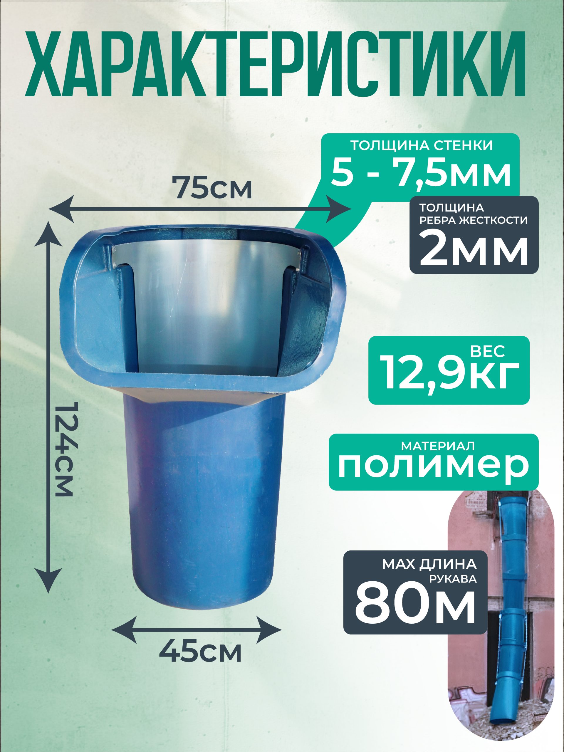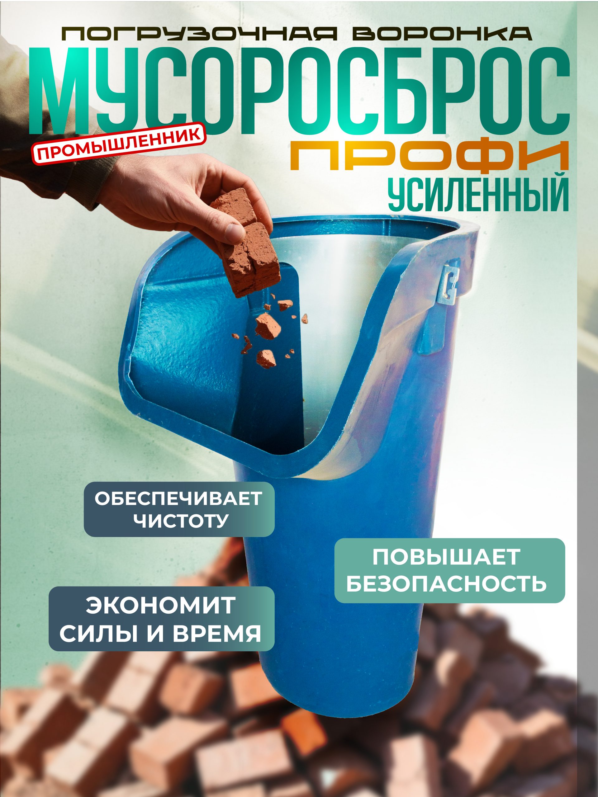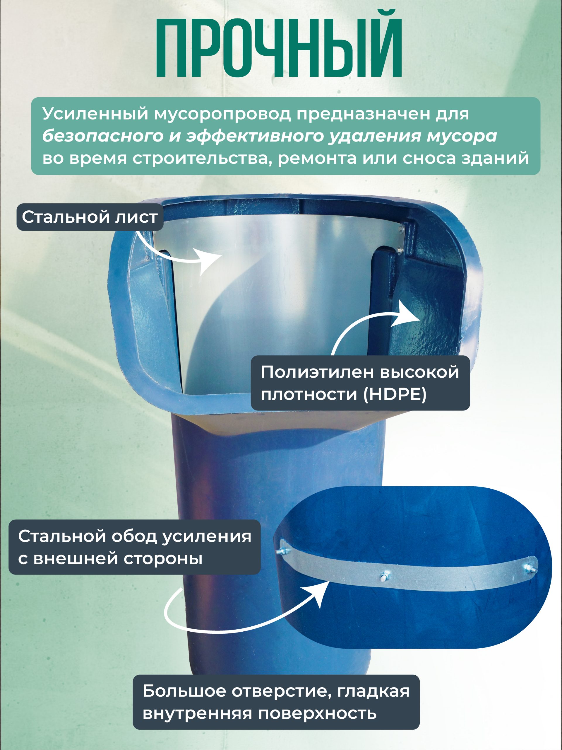 Усиленный мусоропровод ПРОФИ строительного класса для строительных площадок предназначен для облегчения безопасного и эффективного удаления мусора во время строительства, ремонта или сноса зданий. Секция приемная ПРОФИ изготовлена из прочных материалов, таких как сталь или полиэтилен высокой плотности (HDPE). Стальной лист расположен с внутренней стороны приемной секции мусоропровода для ее защиты от сверх тяжелого и острого мусора. Также у данной модели присутствует стальной обод усиления с внешней стороны. Проушины для цепей конструктивно напоминают карабин, что облегчает монтаж и демонтаж мусоросброса.