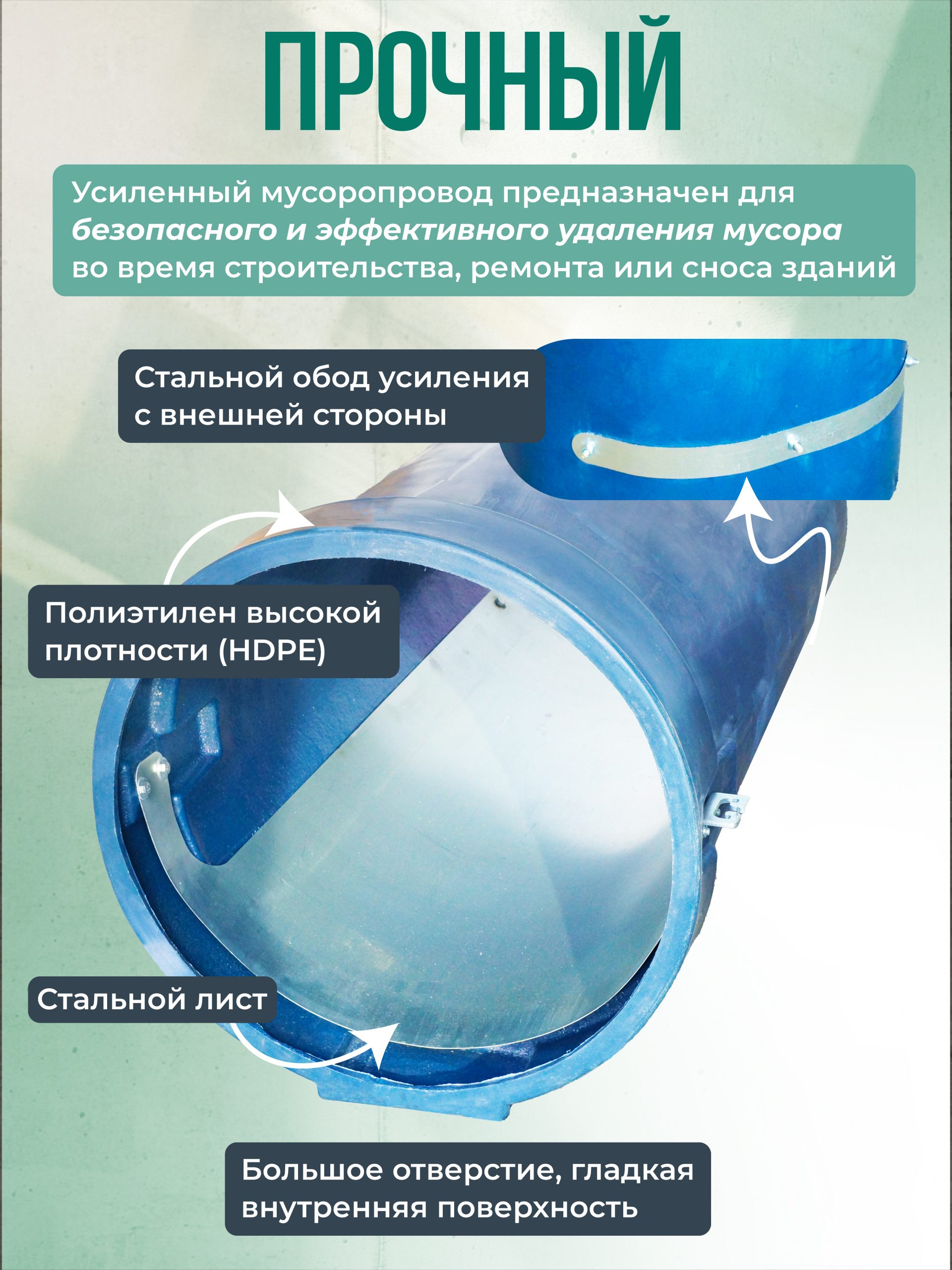 Усиленный мусоропровод ПРОФИ строительного класса для строительных площадок предназначен для облегчения безопасного и эффективного удаления мусора во время строительства, ремонта или сноса зданий. Секция ПРОФИ изготовлена из прочных материалов, таких как сталь или полиэтилен высокой плотности (HDPE). Стальной лист расположен с внутренней стороны приемной секции мусоропровода для ее защиты от сверх тяжелого и острого мусора. Также у данной модели присутствует стальной обод усиления с внешней стороны. Проушины для цепей конструктивно напоминают карабин, что облегчает монтаж и демонтаж мусоросброса.