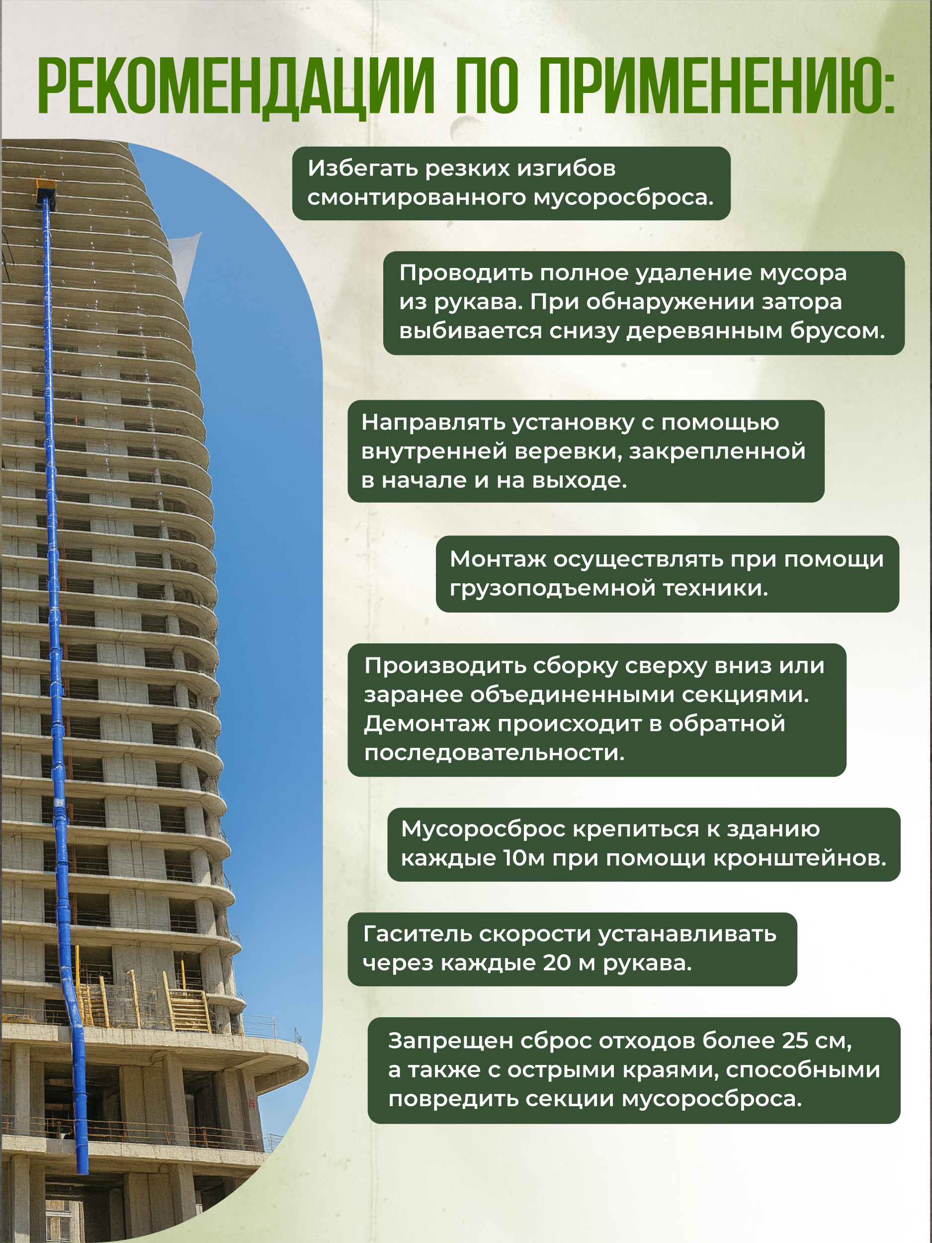 Мусоросброс строительный предназначен для оперативного удаления строительного мусора непосредственно в мусорные баки или автомобильные кузова. Располагается вертикально вдоль оконных проемов строящегося или ремонтируемого здания. Экономит человеческий и временной ресурс, повышает технику безопасности, обеспечивает чистоту и соблюдение экологических норм на строительной площадке.