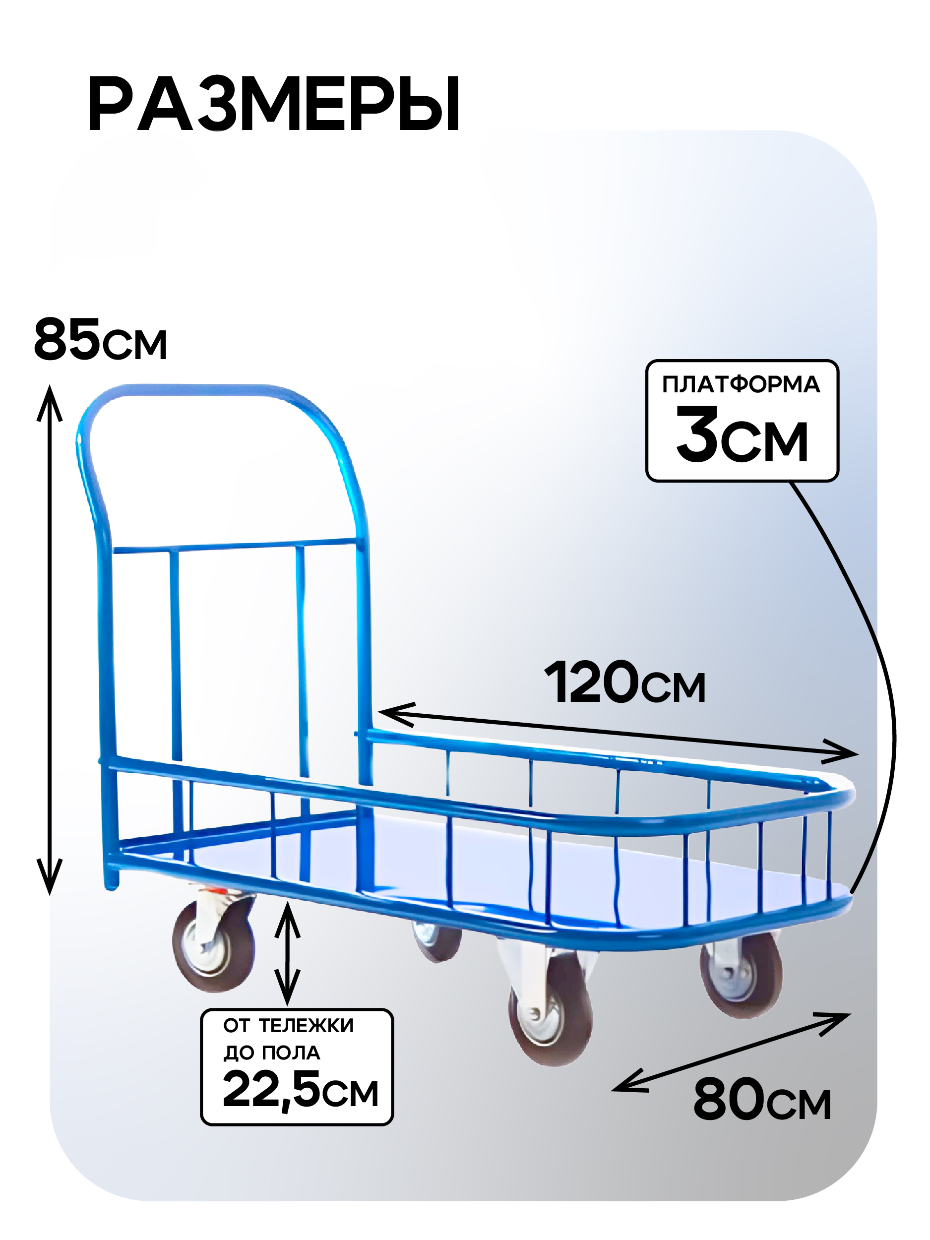 Платформенная тележка с четырьмя колесами 160 мм предназначена для работы по перевозке грузов на складах, логистических центрах, объектов торговли и прочих мест, где необходимо перевозить товары весом до 450 килограмм. Бортики из труб высотой 15 см препятствуют падению товара с платформы. Борт у данной модели не снимается. Наличие двух ручек помогает перемещать изделие в узких коридорах. Размер платформы — 1200х800 мм, высота платформы от земли — 30 мм. Тележка покрыта порошково-полимерной краской для защиты от коррозии и механических повреждений. В комплект входит полный набор метизов для сборки изделия.