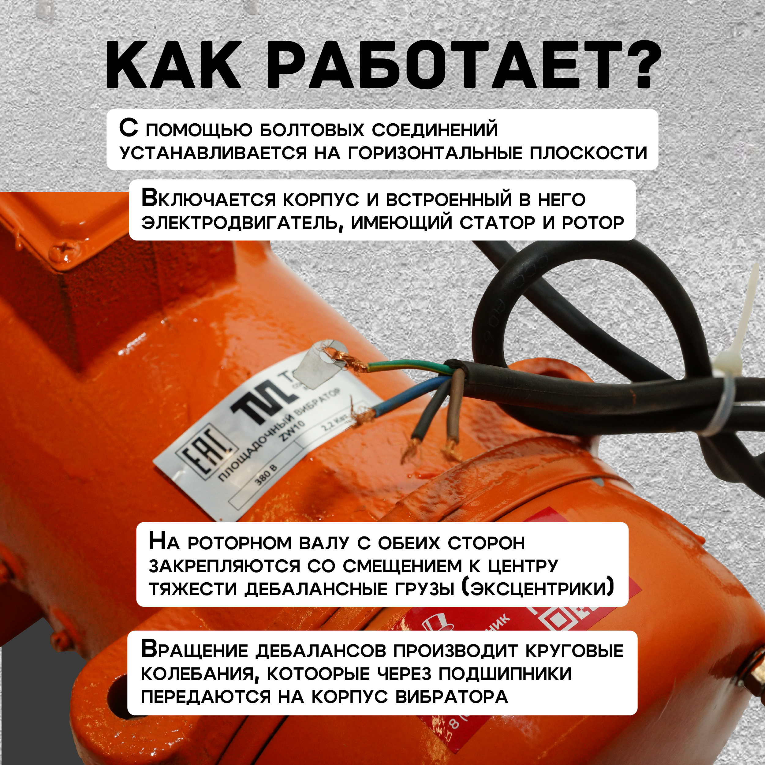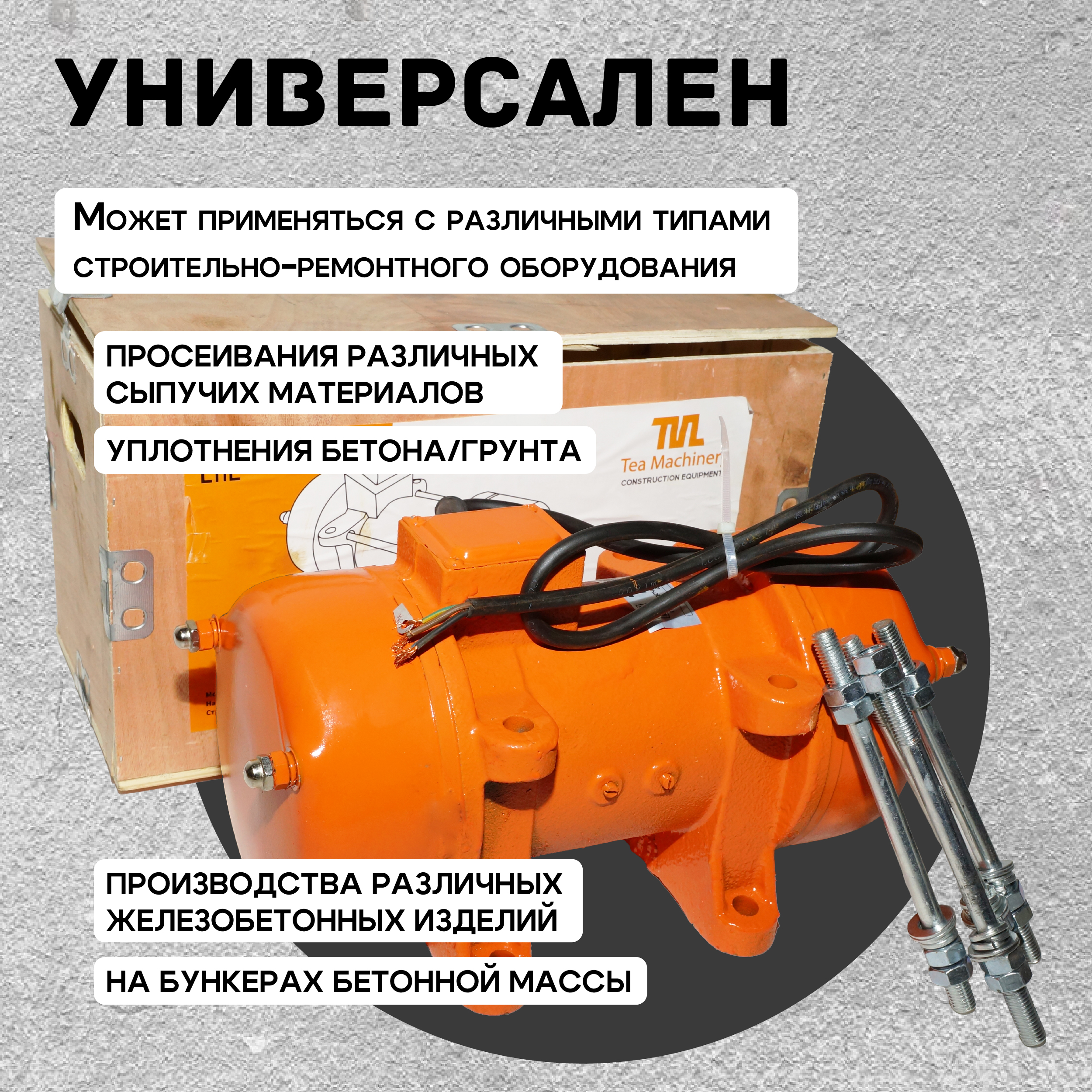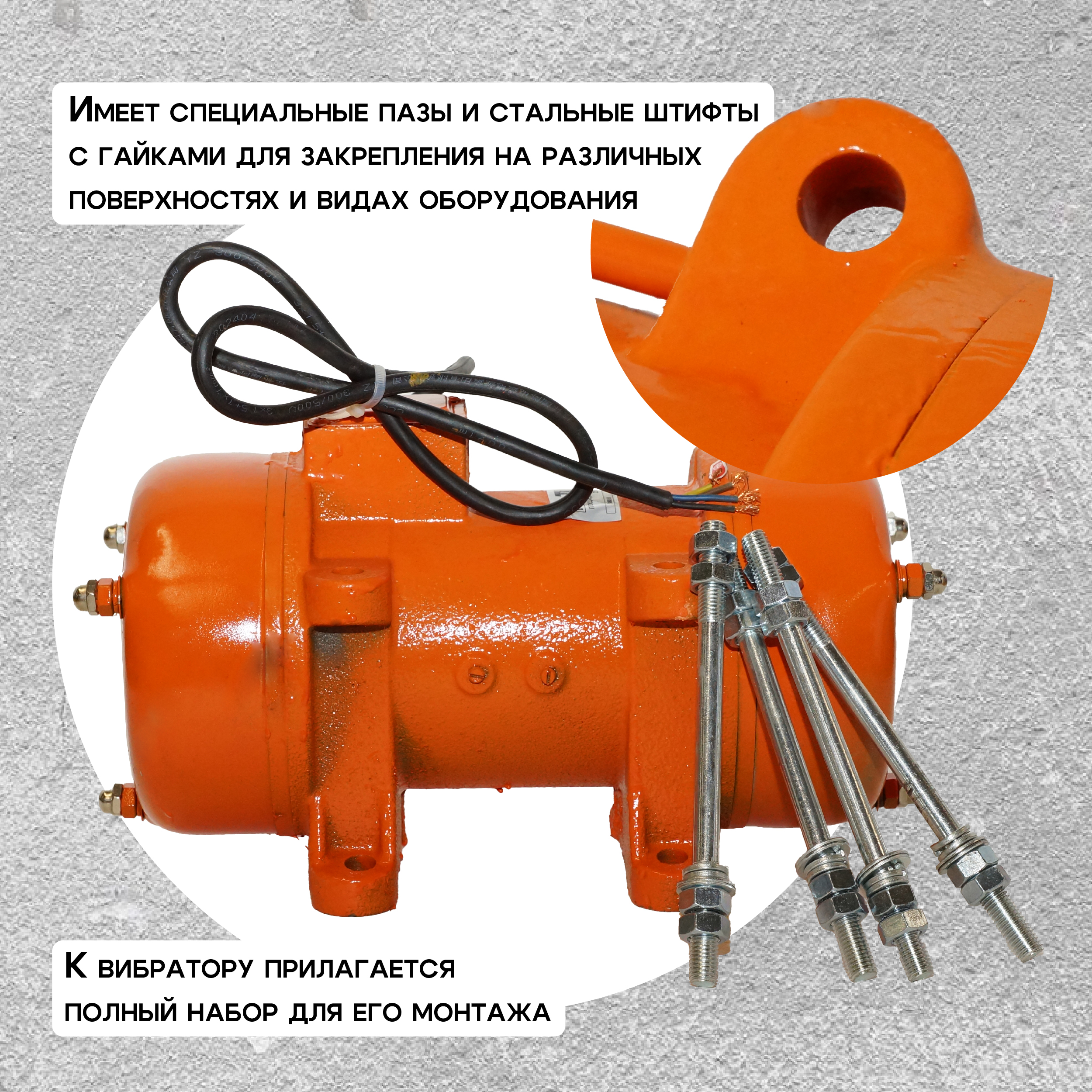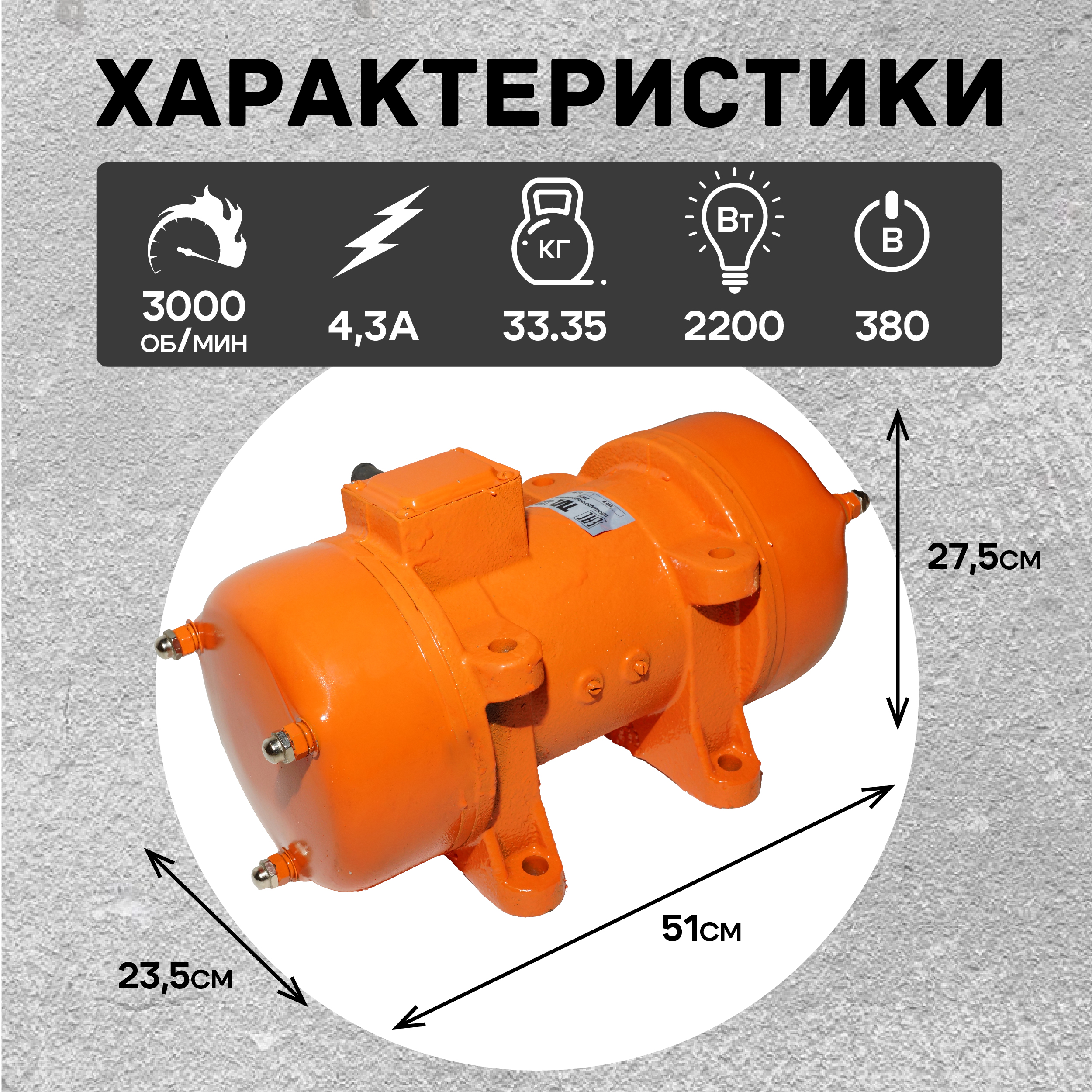 Прочный корпус изготовлен из высококачественной стали и износоустойчив. Снабжен двигателем 2200 Вт, работает от сети 380 В. Данная модель не имеет регулировки дебалансов. Для предотвращения перегрева нежелательна длительная работа вибратора в холостом режиме. После использования необходимо очистить все детали и обработать смазочным материалом, избегайте попадания внутрь корпуса воды, песка, строительных сыпучих смесей и грязи.