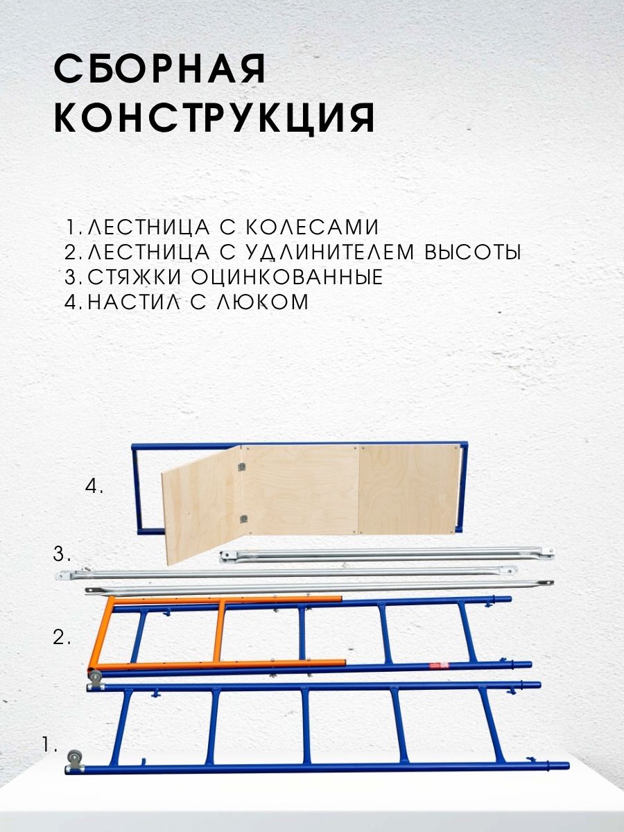 Помост оснащен парой колес на двух из четырех стоек, что обеспечивает удобное перемещение по объекту. Также есть дополнительная лестница, которая позволяет увеличить высоту одной из основных лестниц на 90 см (6 шагов по 15 см). За счет этого помост подходит для ремонта, отделочных и строительных работах в местах с неровным полом или не лестничных пролетах.