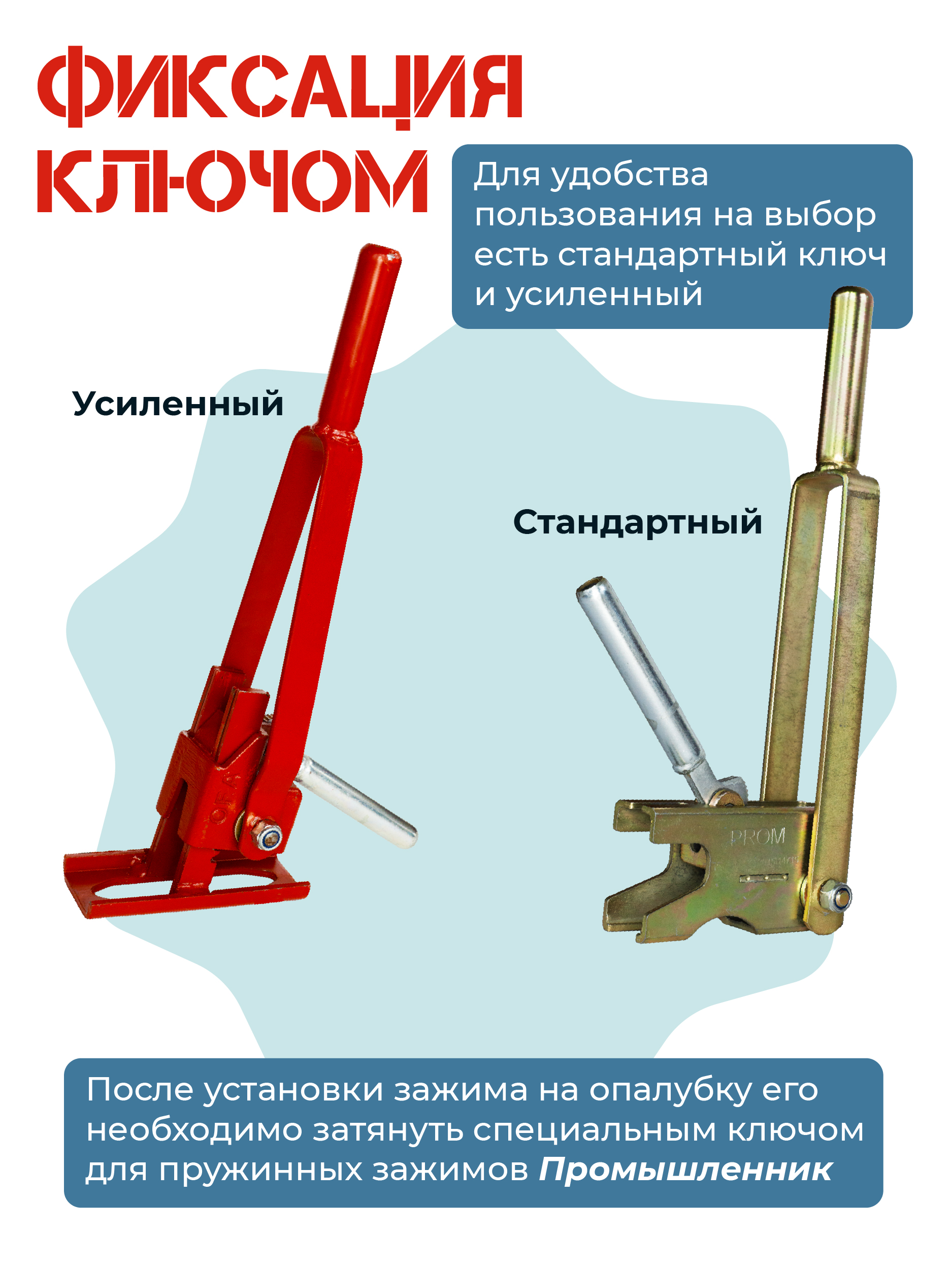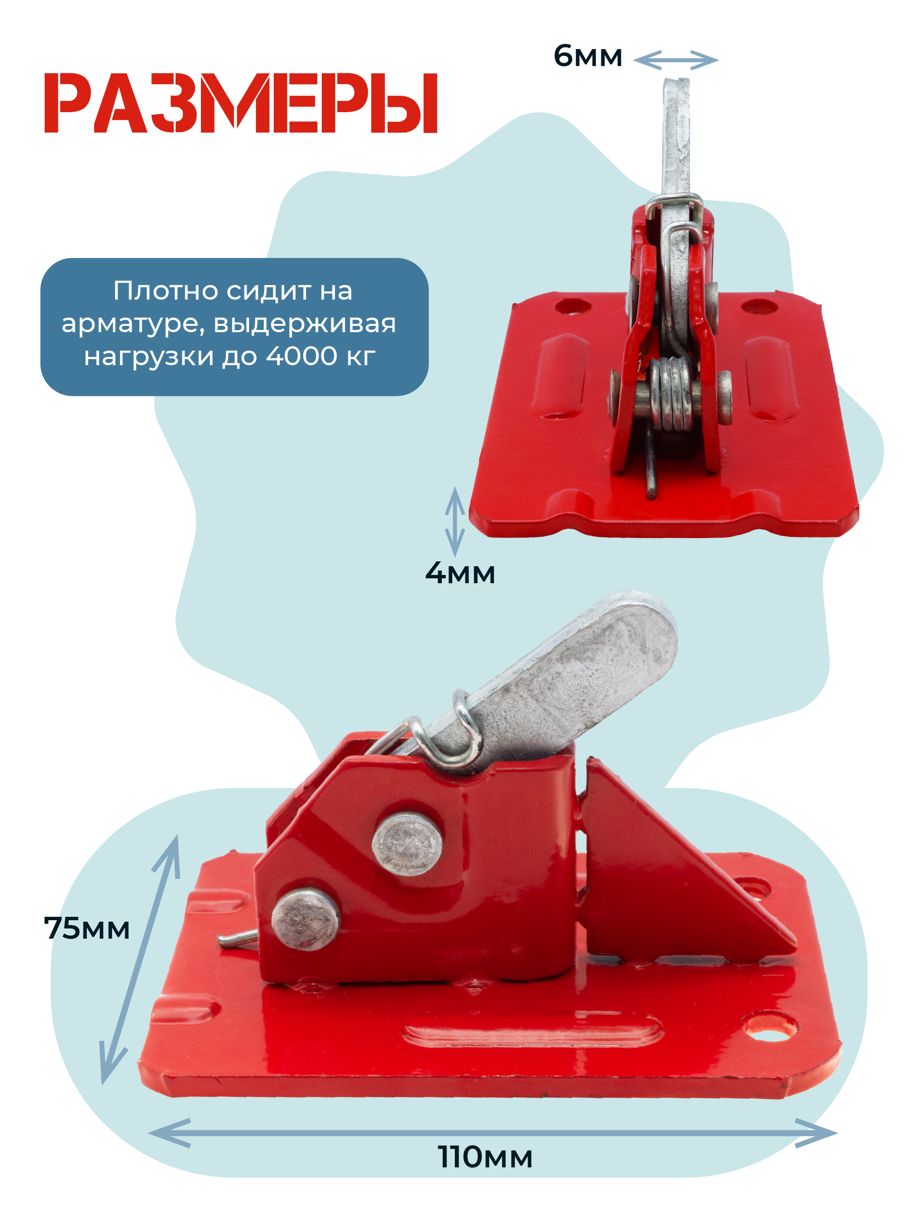 Зажим для стеновой опалубки, опалубки колонн, опалубки перекрытий PROM усиленный используется для надежной фиксации элементов опалубки. Многоразового использования, удаляется после затвердевания бетонного раствора перед разбором опалубочной конструкции. Устанавливается на арматуру (катанка, проволока) диаметром от 6 до 10 мм и затягивается специальным ключом (необходимо приобрести отдельно). Используется как с щитовой опалубкой, так и с ламинированной фанерой при монтаже опалубки фундаментов, тоннельных шахт, стен, колонн и других элементов монолитного строительства. Конструкция зажима включает: язычок толщиной 6.0 мм с острыми зубцами из закаленного металла, обработанного оцинкованным составом; крепежный механизм в направляющем корпусе со сверхпрочной пружиной; платформу из стали толщиной 4 мм и размером 75х108 мм. Данная модель имеет усиление в виде ребра жесткости, позволяющего предотвратить деформацию площадки зажима, если он был установлен неплотно или под углом. Один зажим выдерживает нагрузку до 4000 кг.
