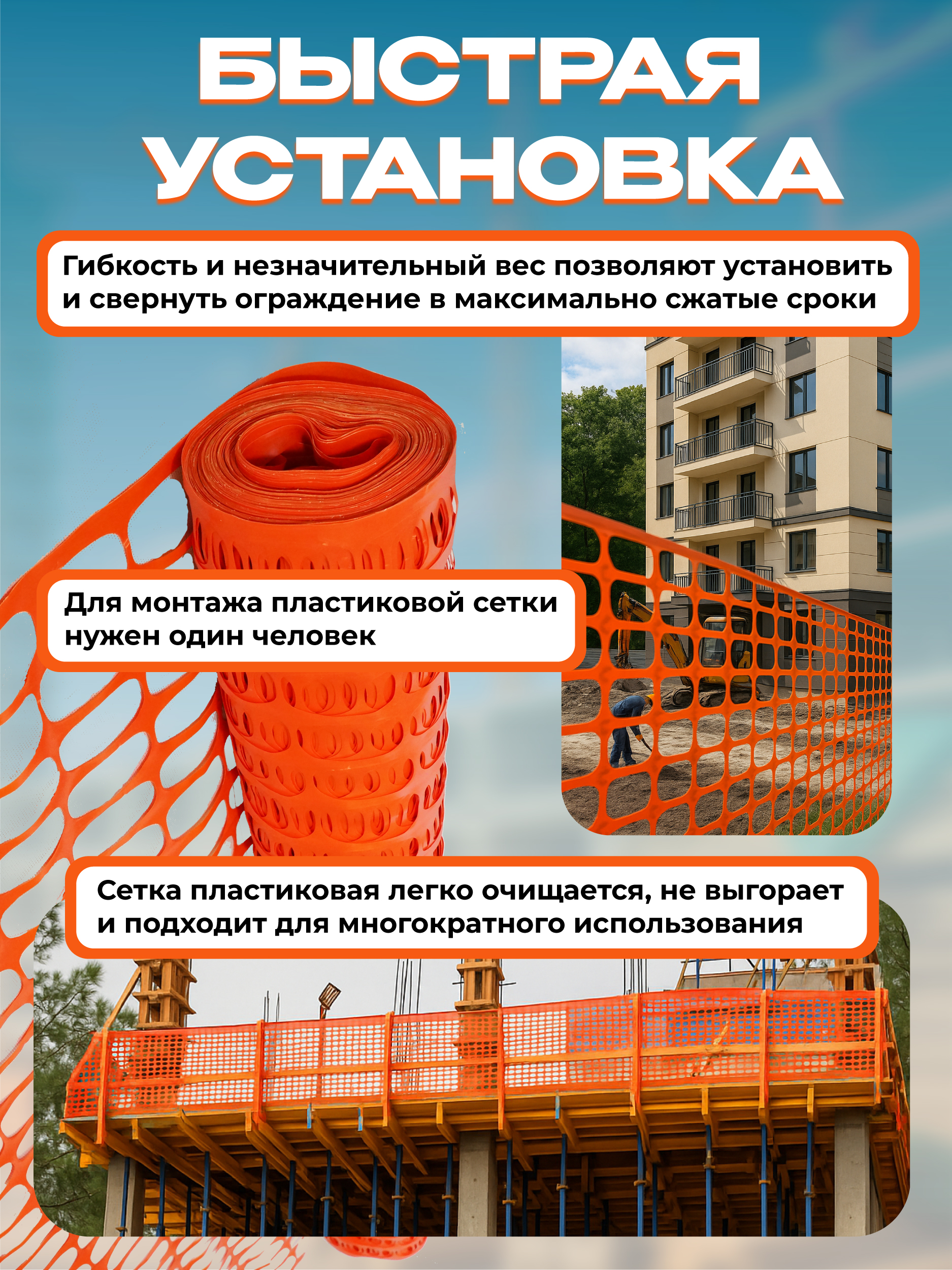 Аварийное ограждение 1,5х50 м используется для обозначения опасных участков при проведении ремонтно-строительных работ, а также для создания временных заборов вместо тяжелых деревянных или железобетонных конструкций. Сетка аварийная изготавливается из светостабилизированного пластика яркого оранжевого цвета, хорошо отражает свет и обращает на себя внимание в любое время суток при различной погоде. За счет больших ячеек размером 55х35 мм и малого веса без проблем устанавливается при помощи пластиковых хомутов, проволоки или шпагата на участках проведения работ. Для монтажа пластиковой сетки нужен один человек. Сетка пластиковая легко очищается, не выгорает и подходит для многократного использования.