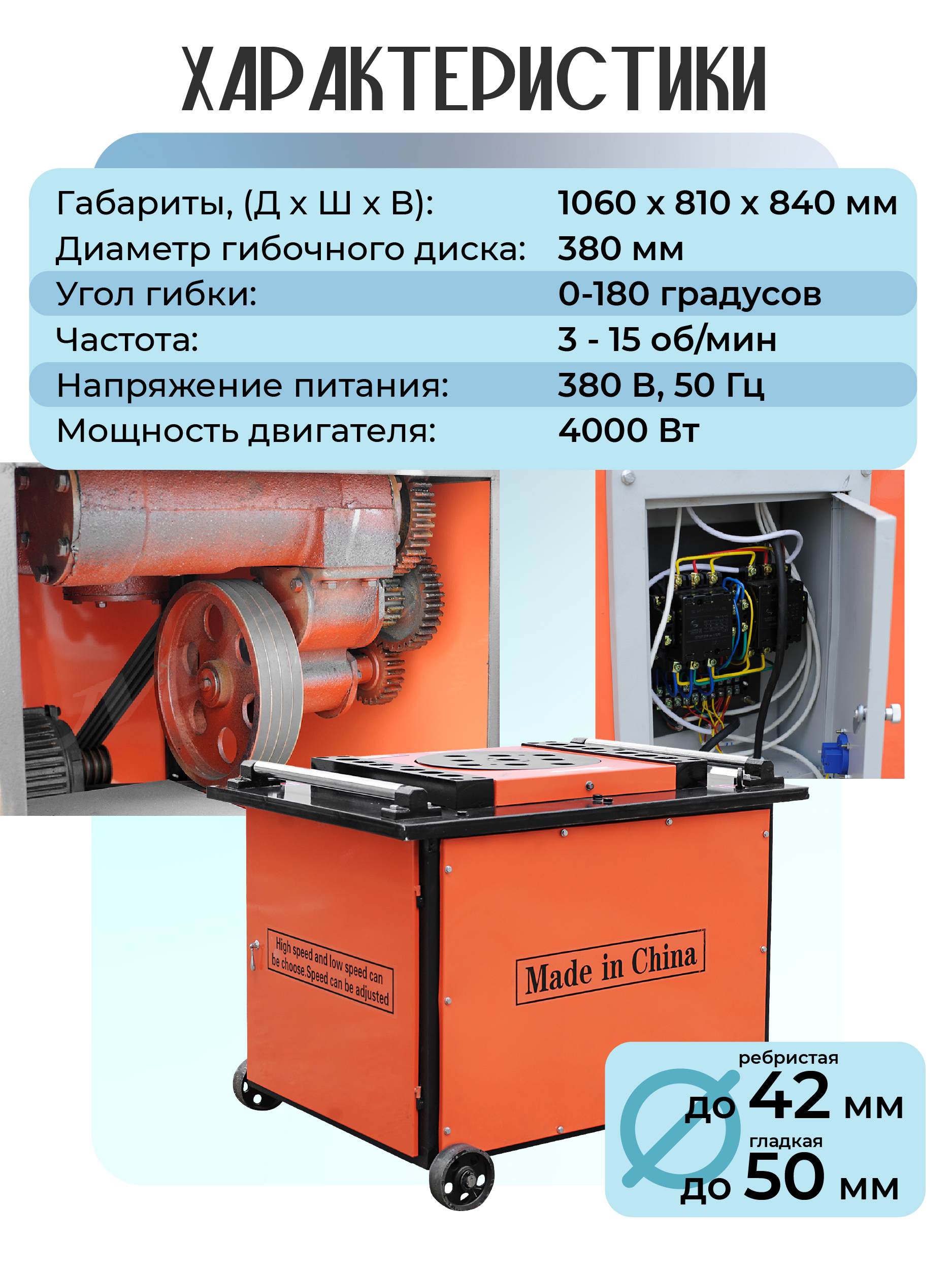 • Увеличенный диапазон диаметров: станок предназначен для гибки арматуры диаметром от 6 до 50 мм, включая рифлёную и гладкую сталь (гиб классов А500С и HRB400 до 38 мм);