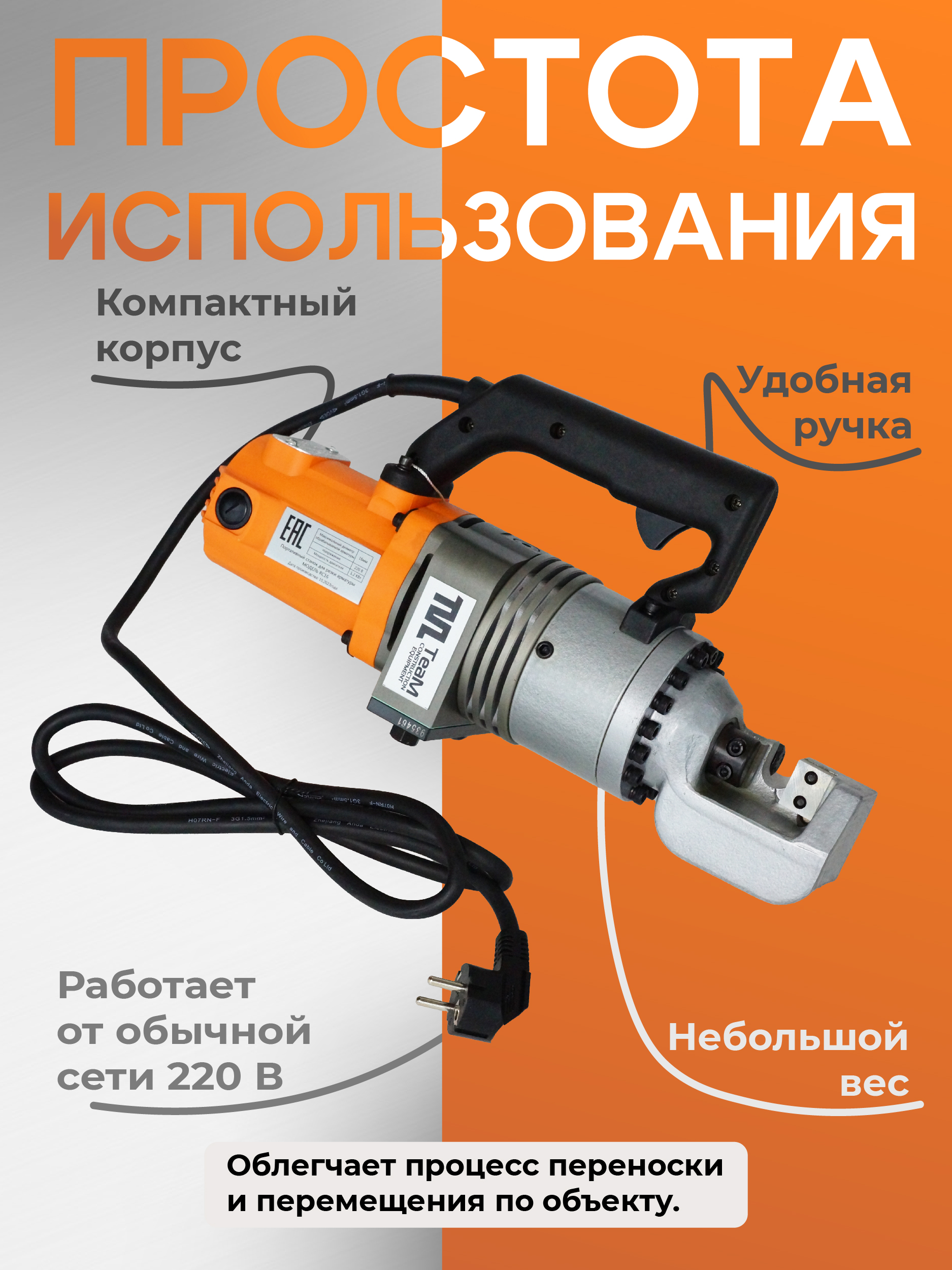 Электрический мобильный станок для резки арматуры TeaM RC-16 применяется в строительстве, когда возникает необходимость резки арматуры на месте в большом объеме: для создания армопояса и опалубки. Модель позволяет ровно и быстро разрезать арматуру от 4 до 16 мм или несколько стержней меньшего диаметра одновременно.