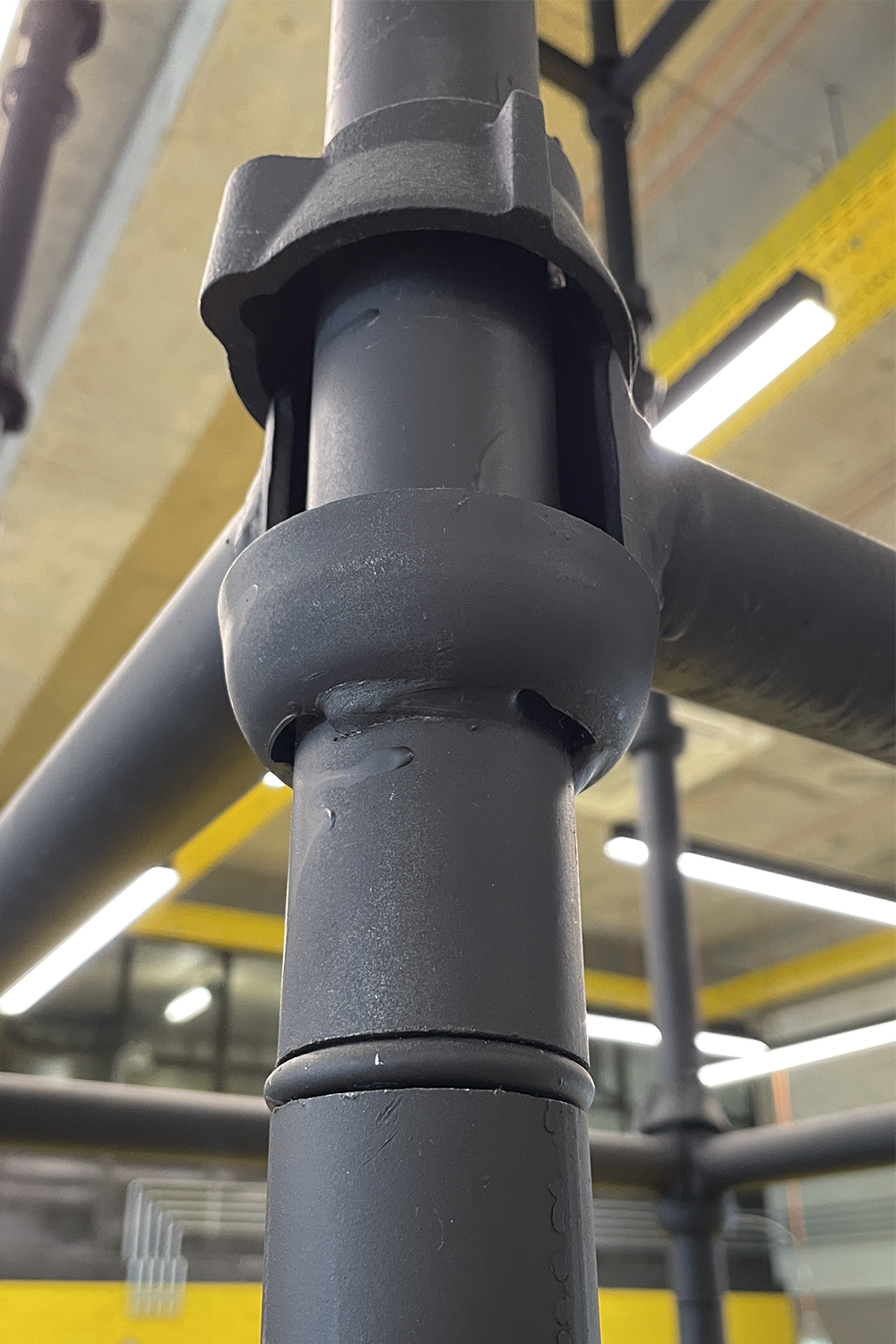 Один из основных несущих компонентов — стойка опалубки чашечная CUP LOCK 1,5 м с шагом чашки 0,5 м. Изготавливается из трубы ГОСТ 3262-75 диаметром 48 мм и толщиной стенки 3 мм. Сталь марки Ст3пс, что в совокупности прочностных характеристик позволяет довести максимальную нагрузку при сохранении шага установки ригелей 0,5 м до 82,3 кН.