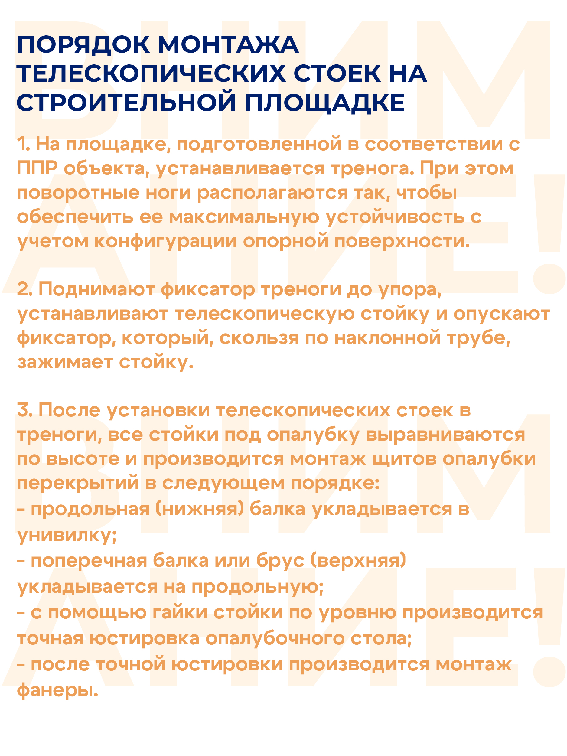 Монтаж телескопических стоек для опалубки производится специальным инструментом, не допускается применение кувалд, ломов. Монтаж стоек с отклонением от ППР или без ППР ЗАПРЕЩАЕТСЯ.