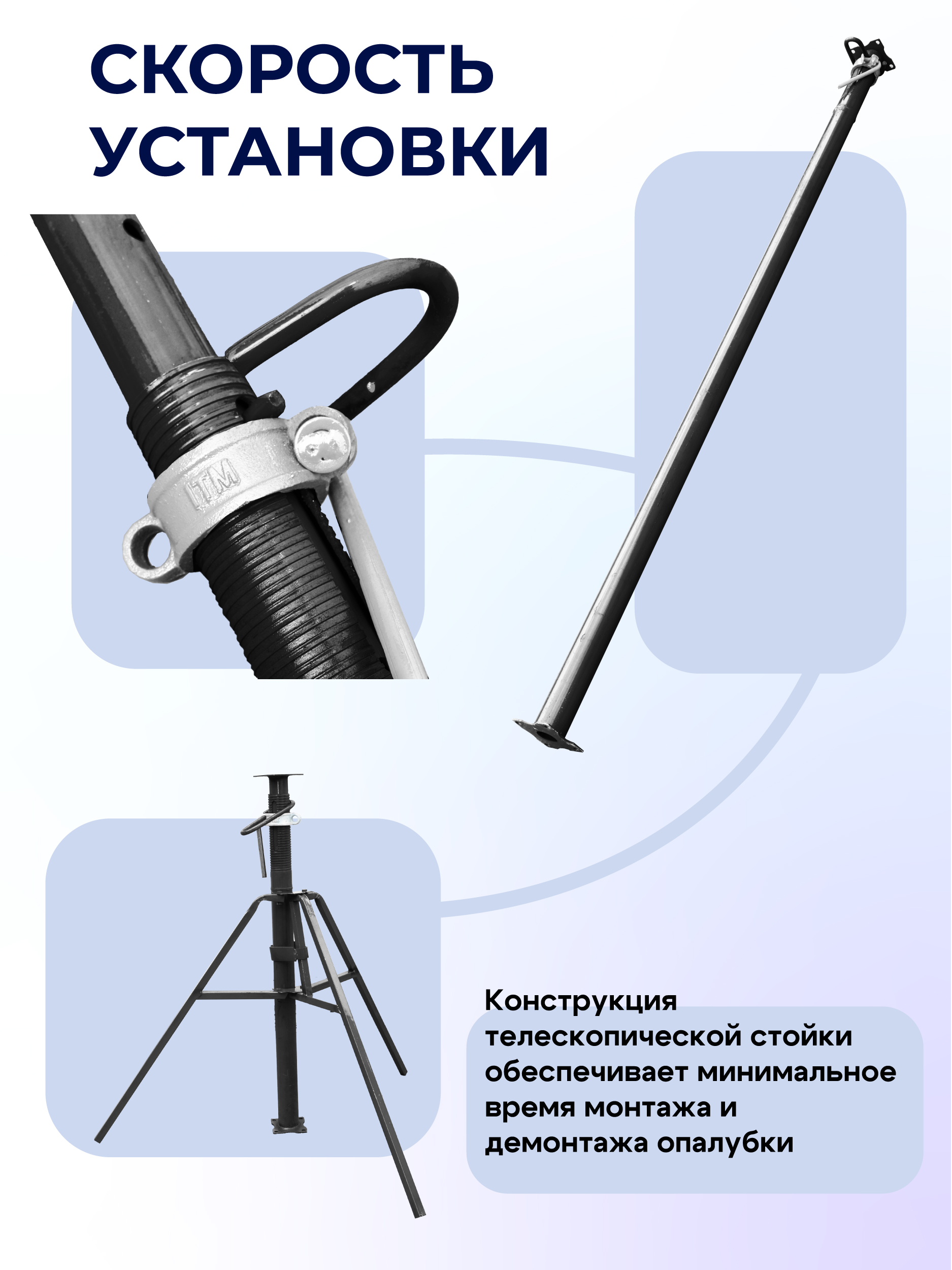 ВНИМАНИЕ! В комплектацию товара входит только стойка опалубки. Тренога и унивилка приобретаются отдельно. Изображения стойки опалубки в сборе представлены исключительно для ознакомления с правильной сборкой и установкой стойки-домкрата.