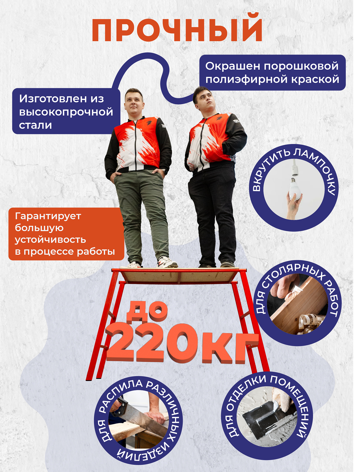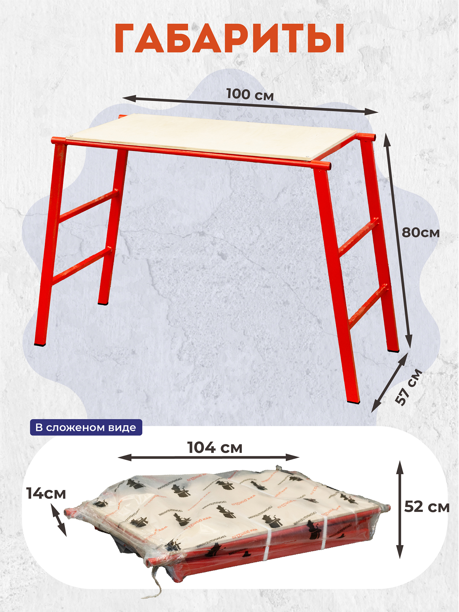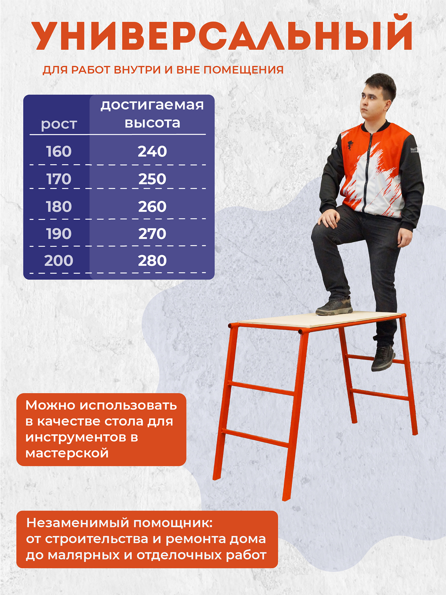 Столик имеет высоту 80 см, что обеспечивает комфортное рабочее положение и снижает усталость при длительной работе. Составная конструкция: Легко собирается и разбирается, что делает его идеальным для использования как на стройплощадке, так и в мастерской. Компактность конструкции облегчает транспортировку и хранение.