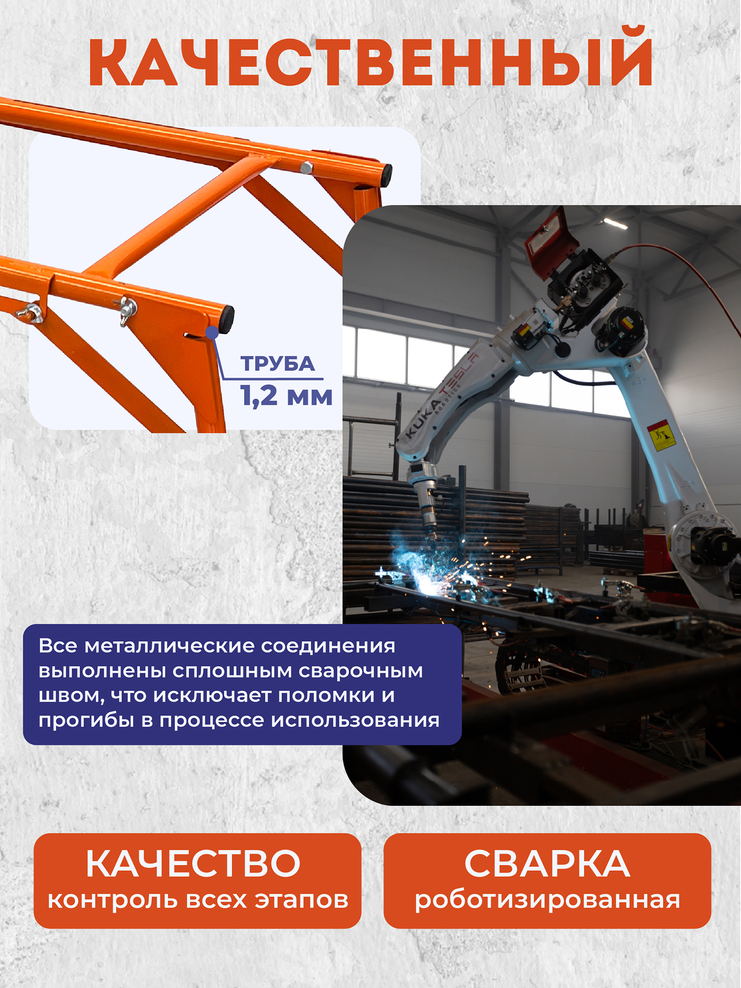 Изготовлен из высокопрочной стали, окрашенной порошковой полиэфирной краской. За счет этого при бережном хранении он не подвергнется коррозии, что значительно продлит срок эксплуатации. Все металлические соединения выполнены сплошным сварочным швом, что исключает поломки и прогибы в процессе использования.