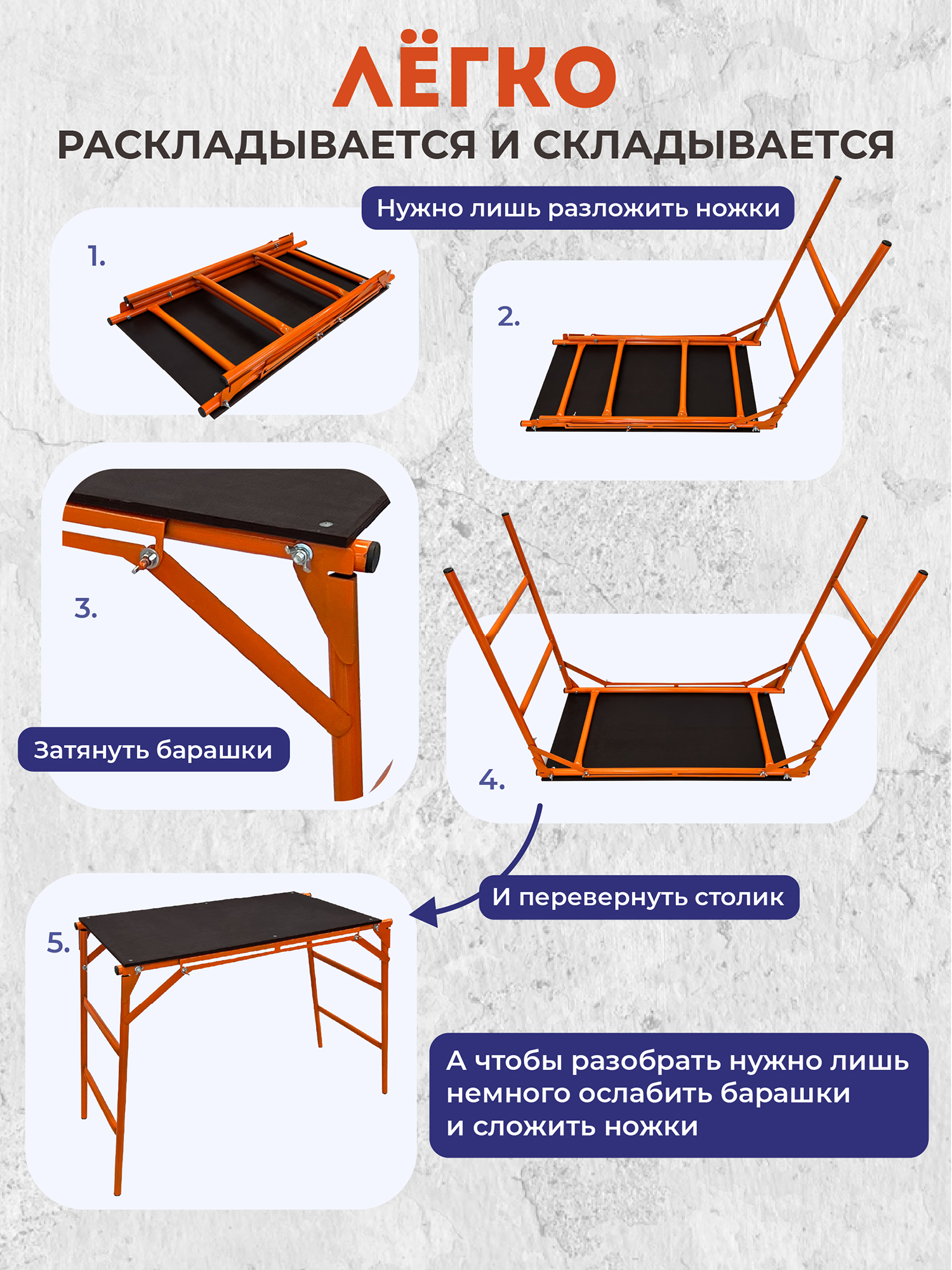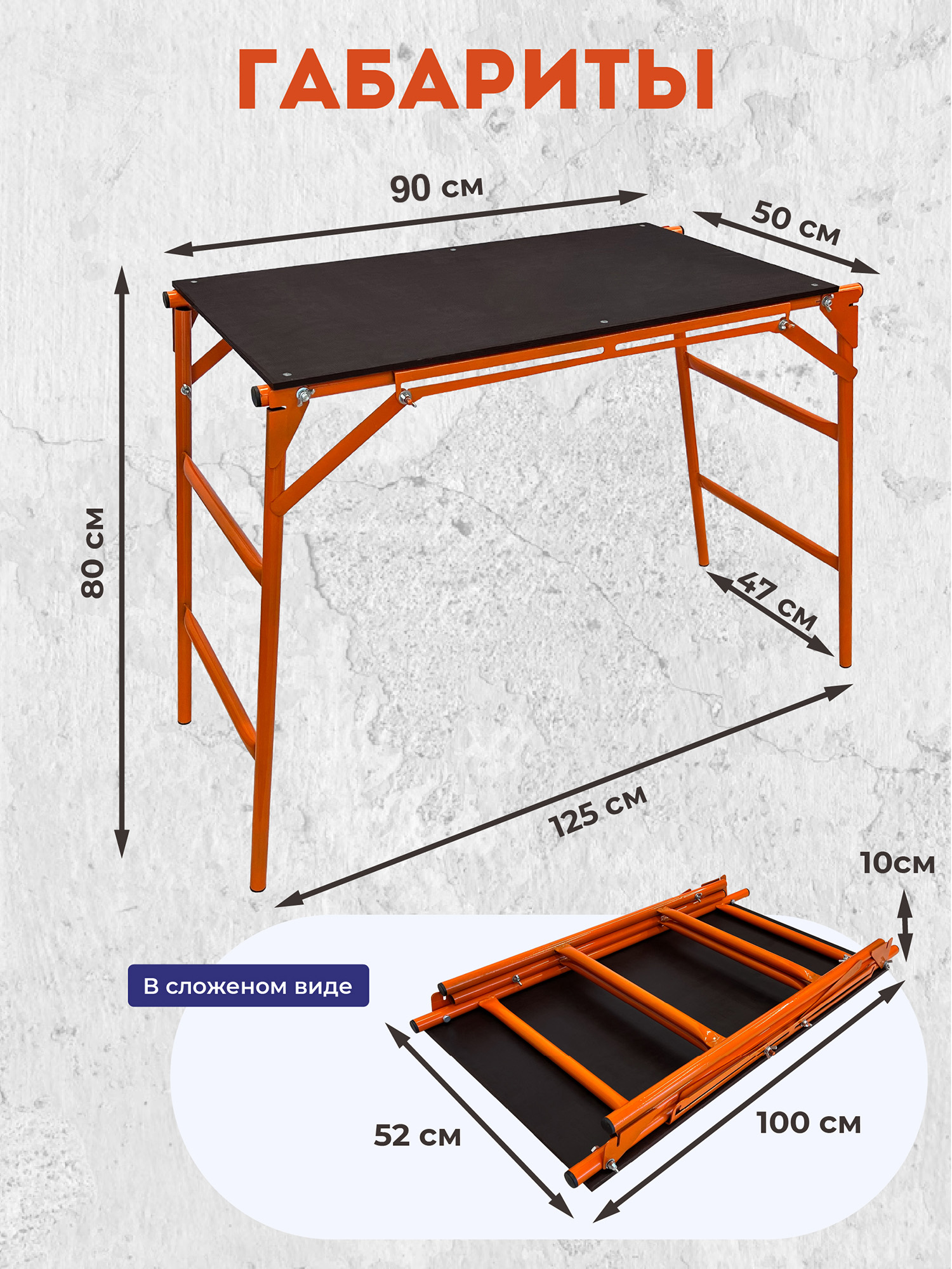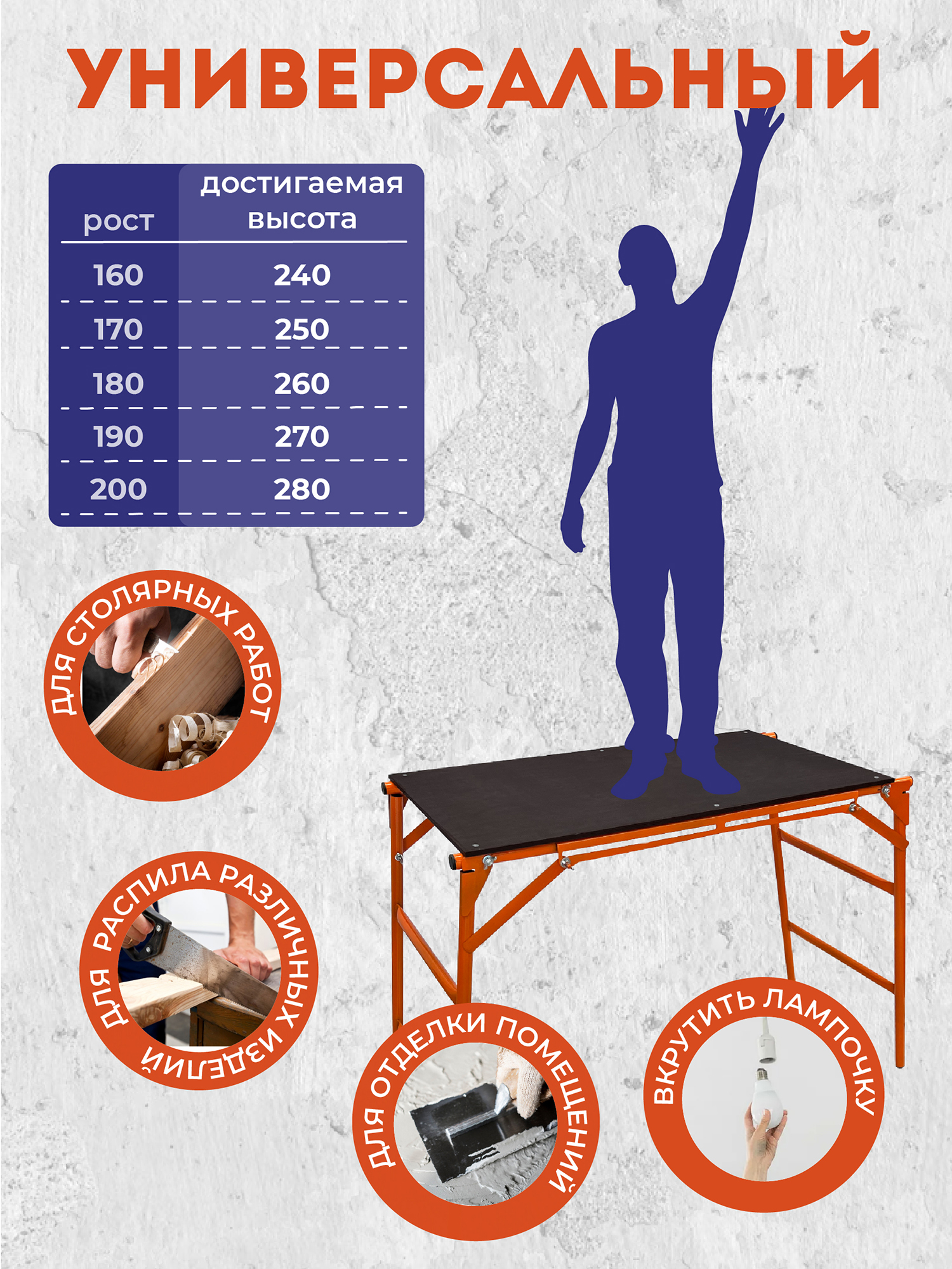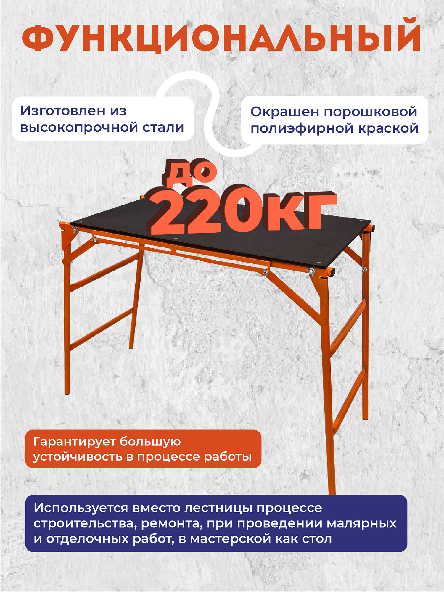 Ножки столика – лестница с двумя ступеньками шириной 42 см, по которой удобно подниматься рабочую площадку. Она находится на высоте 80 сантиметров от пола. Благодаря этому на нем можно проводить любые работы, к примеру, использовать как стол плиточника, клеить обои, штукатурить стены или потолки, вкручивать лампочку в плафон, на высоте до 2,8 метров.