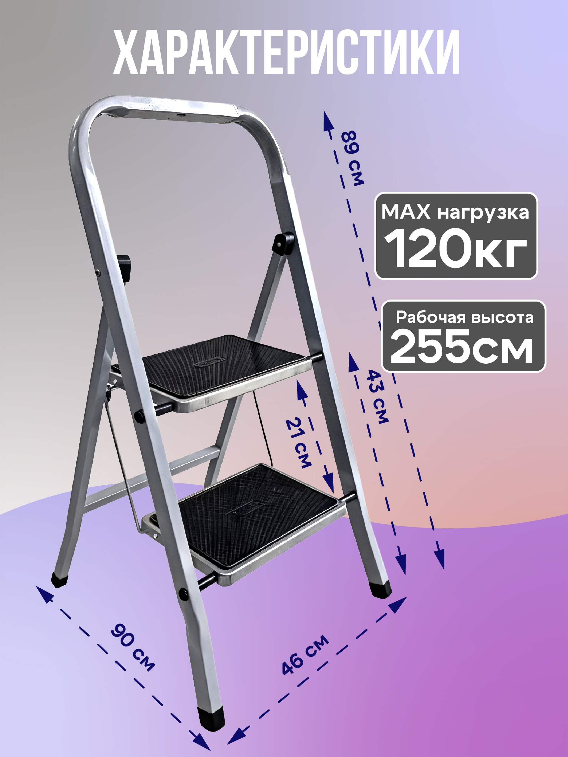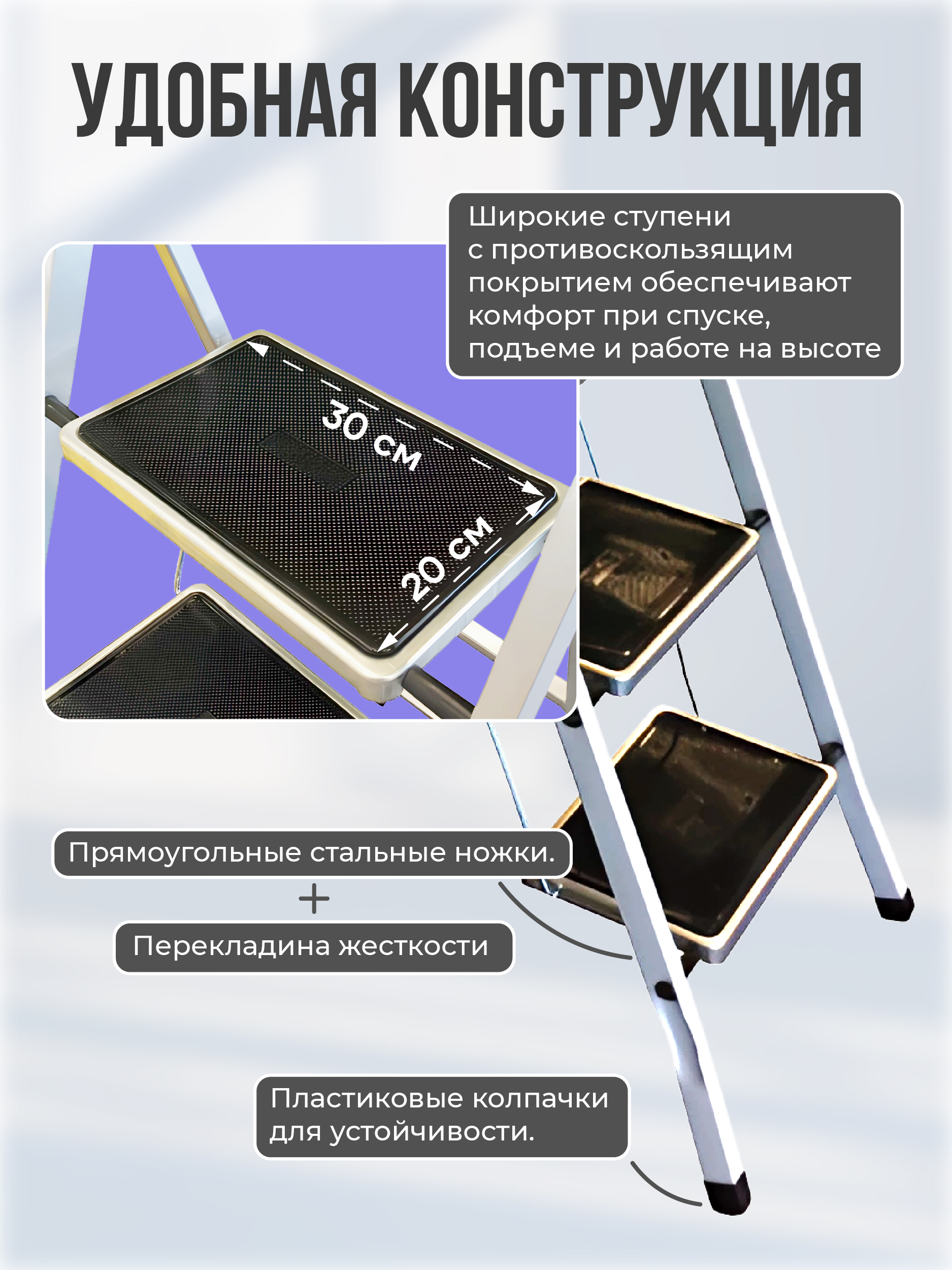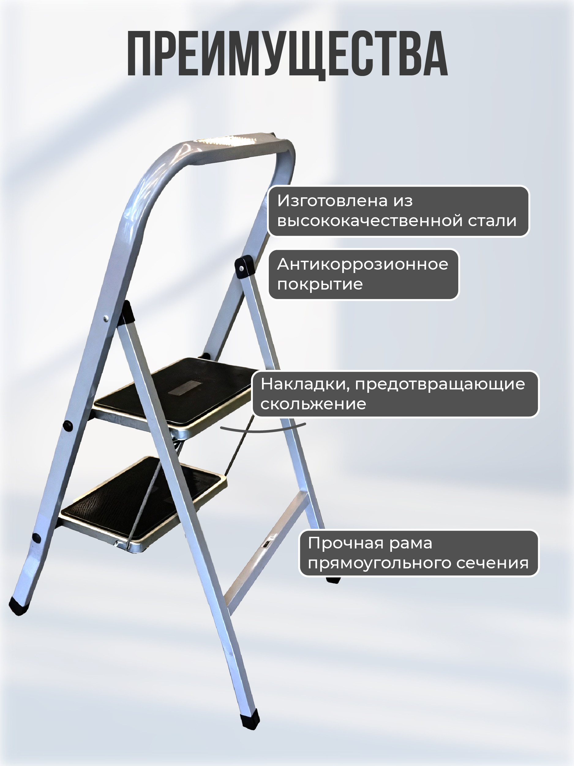 Изготовлена из высококачественной стали с антикоррозионным покрытием. Рабочая площадка и ступени выполнены с применением накладок, предотвращающего скольжение. Имеет пластиковые колпачки на ножках для устойчивости. Легко собирается.
