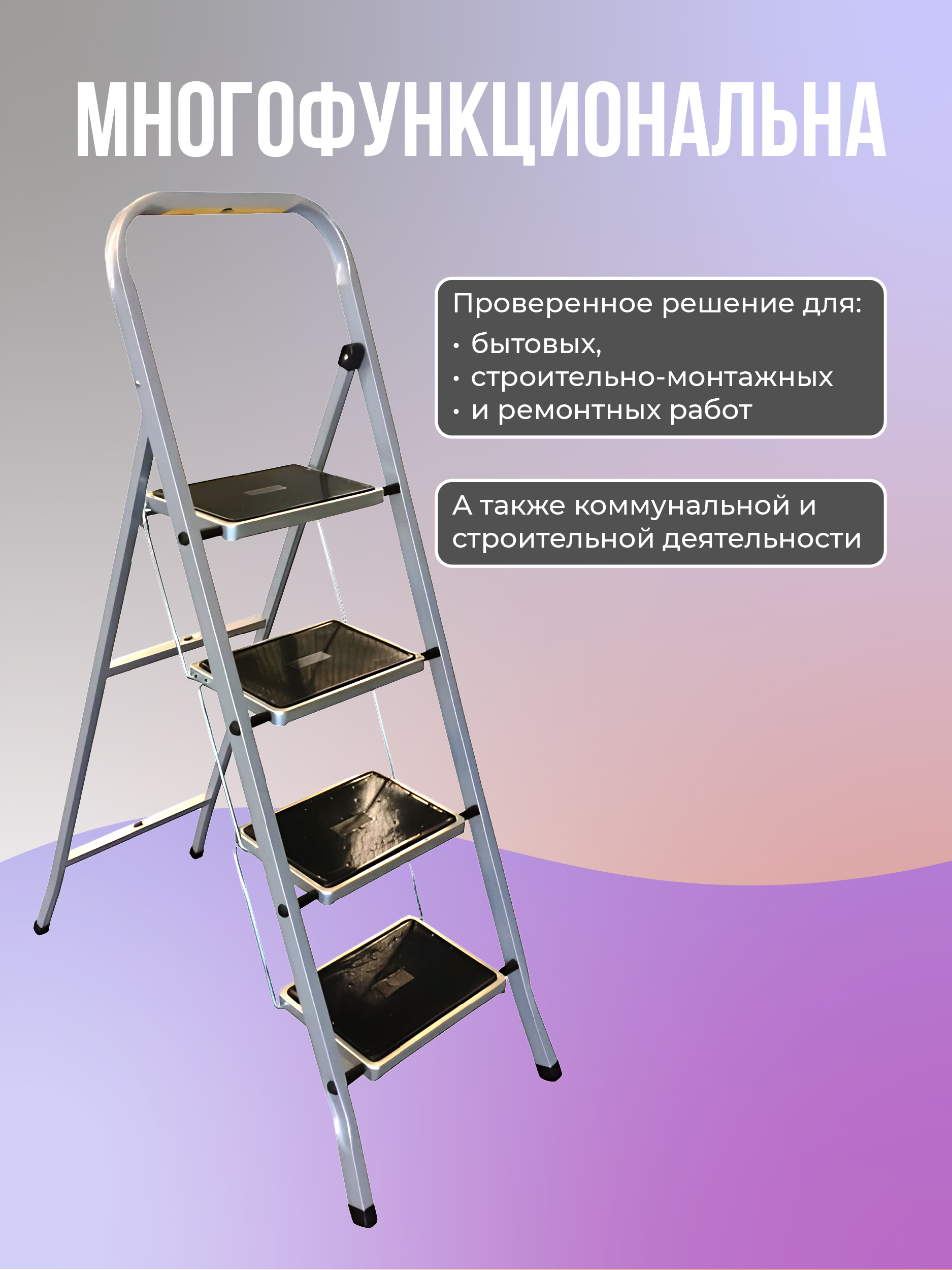 Изготовлена из высококачественной стали с антикоррозионным покрытием. Рабочая площадка и ступени выполнены с применением накладок, предотвращающего скольжение. Имеет пластиковые колпачки на ножках для устойчивости. Легко собирается.