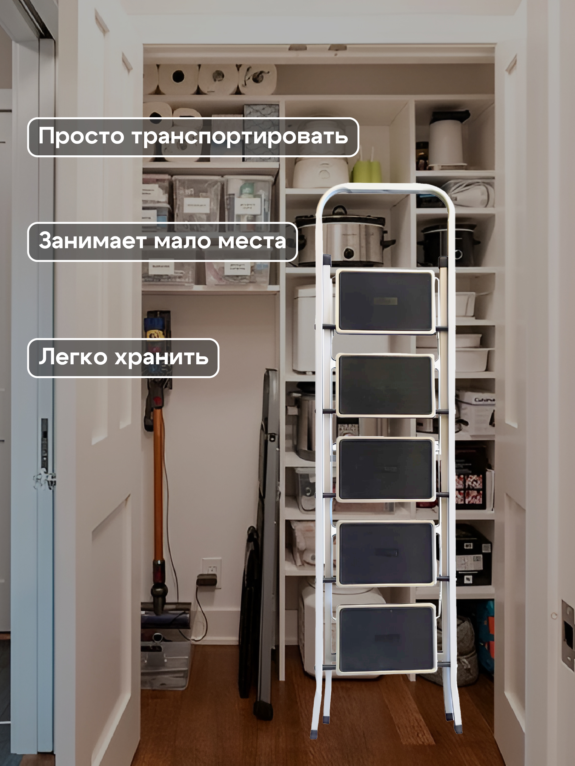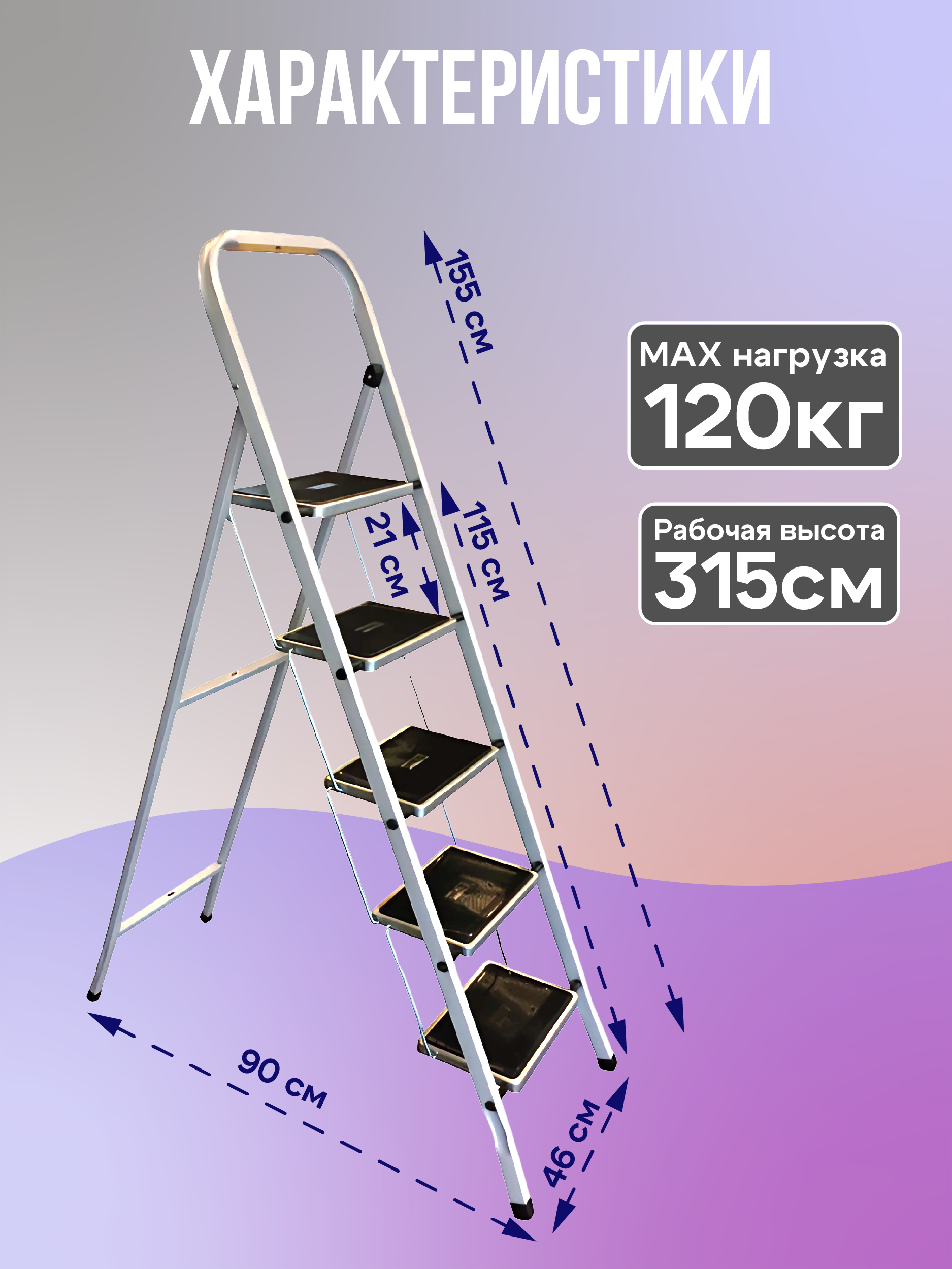 Изготовлена из высококачественной стали с антикоррозионным покрытием. Рабочая площадка и ступени выполнены с применением накладок, предотвращающего скольжение. Имеет пластиковые колпачки на ножках для устойчивости. Легко собирается.
