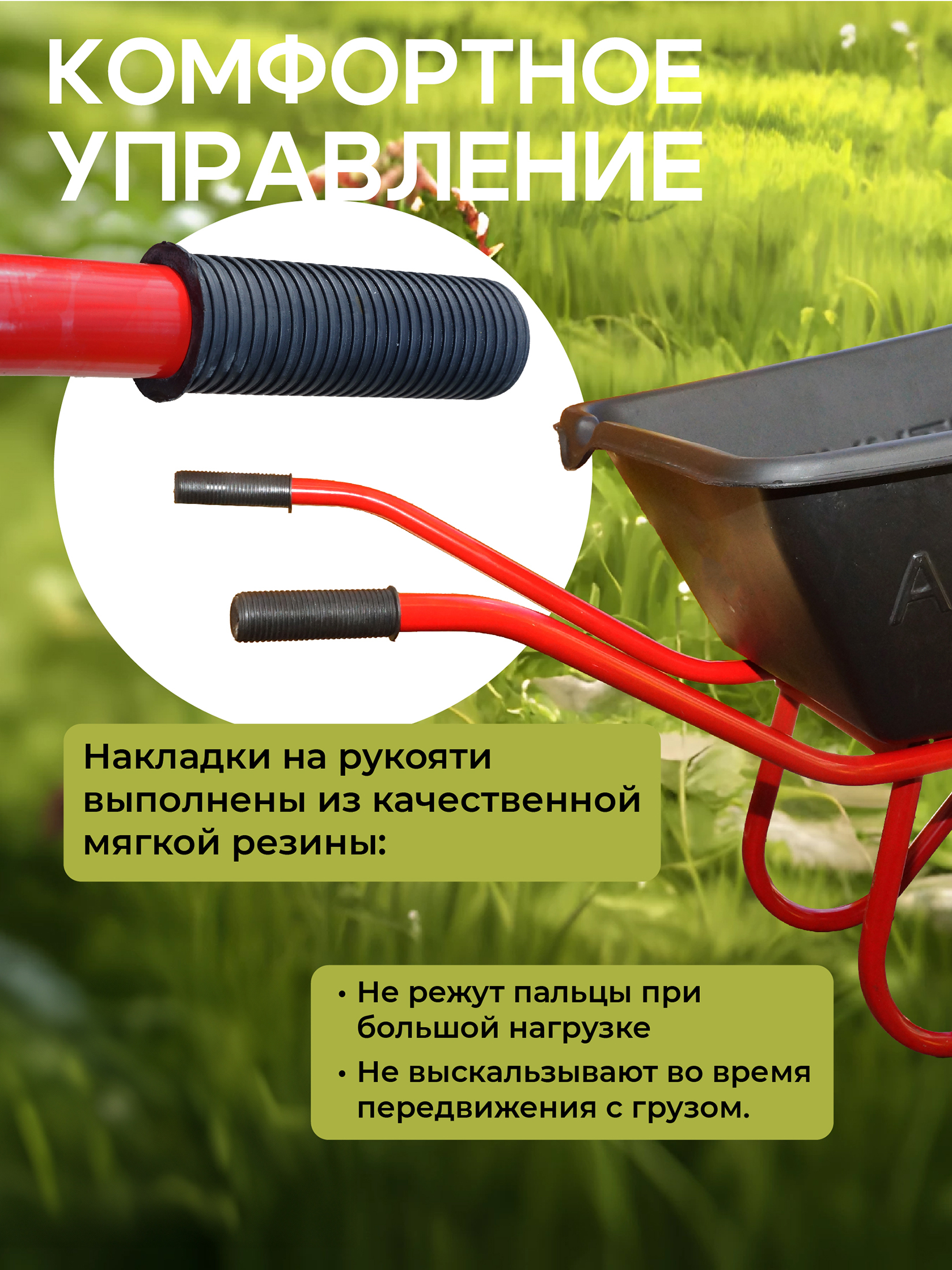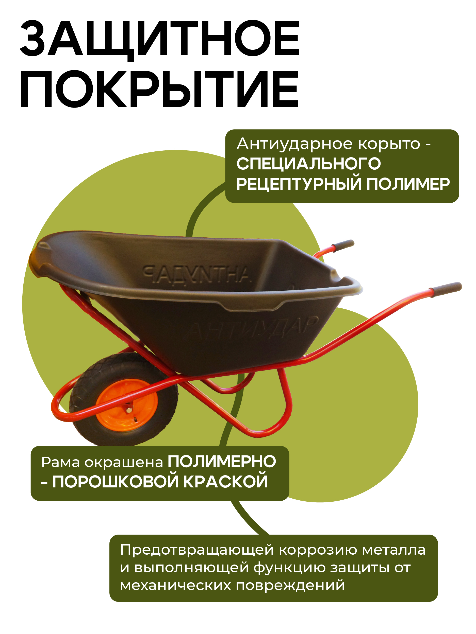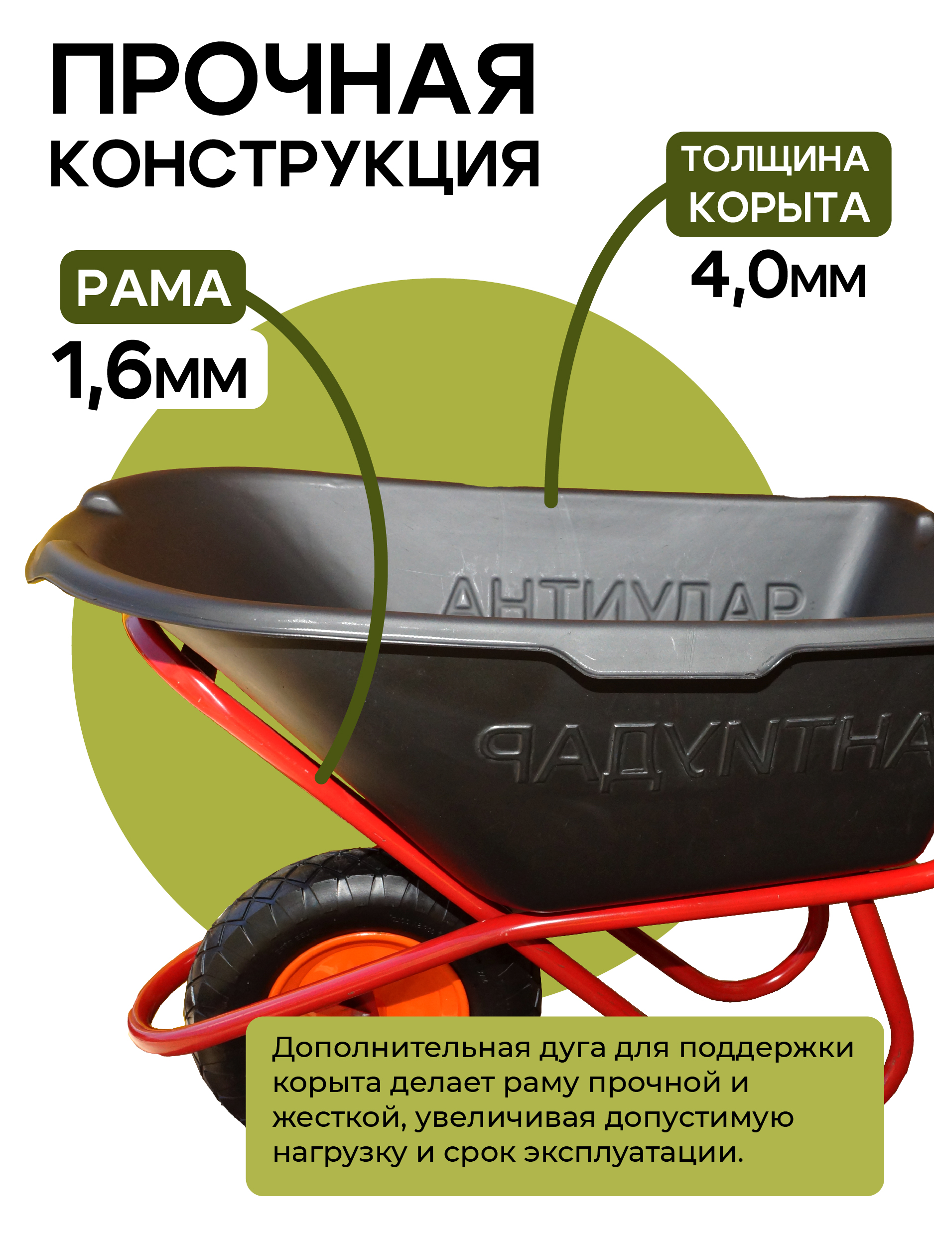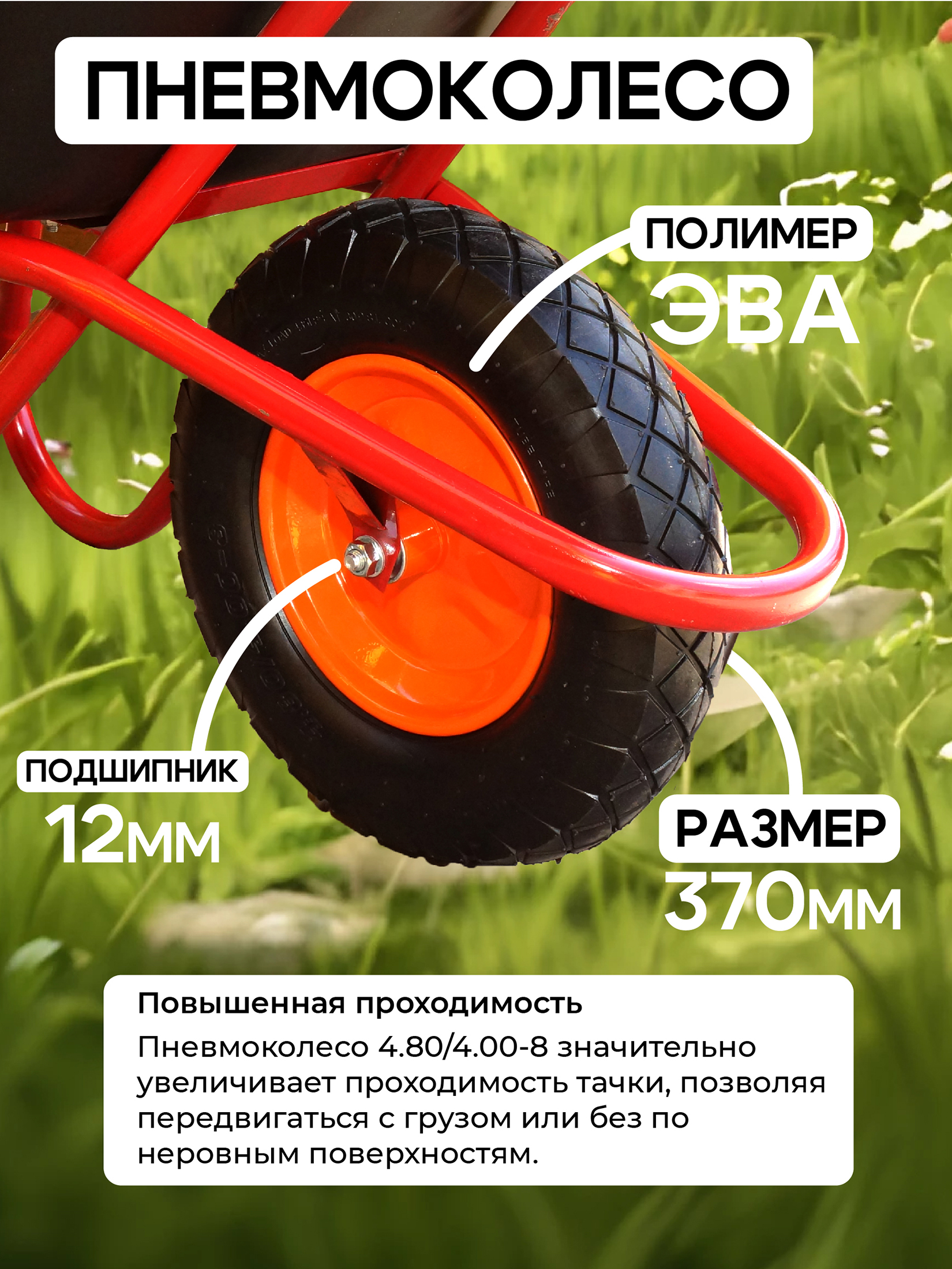 Тачка собирается на пневмоколесе из полимера ЭВА (этиленвинилацетат), что обеспечивает повышенную проходимость практически на любой неровной поверхности.