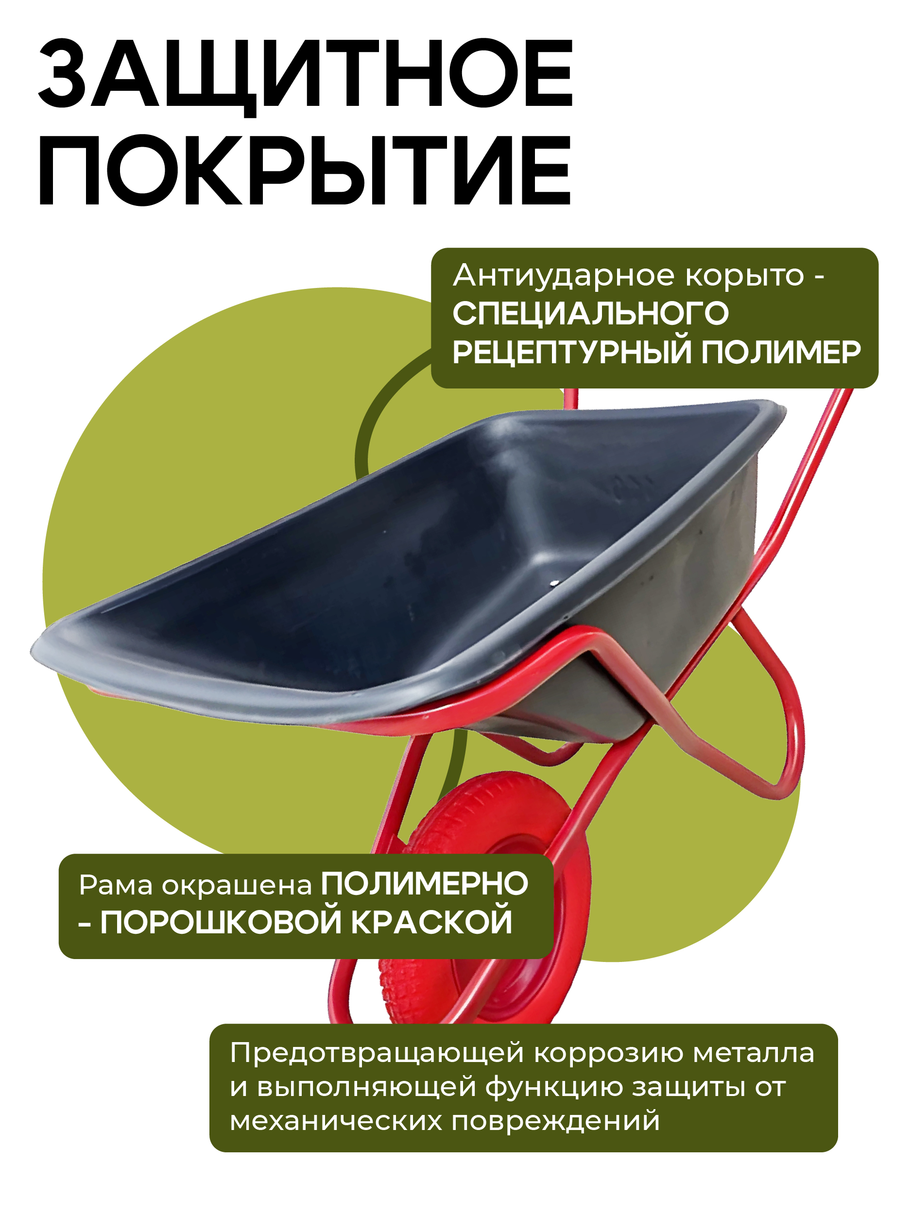 Тачка собирается на литом колесе из полимера ЭВА (этиленвинилацетат), что обеспечивает повышенную износостойкость и сопротивляемость к порезам и проколам.