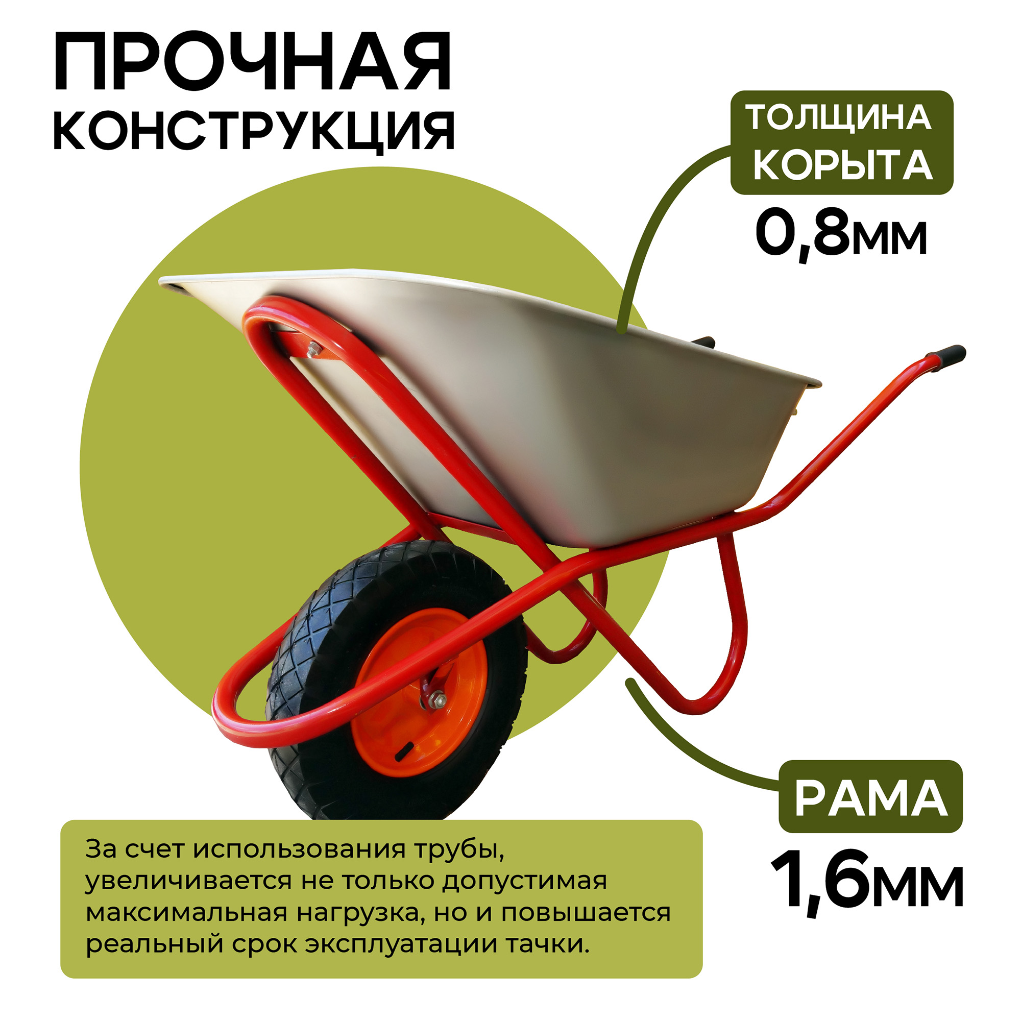 Тачка собирается на пневмоколесе из полимера ЭВА (этиленвинилацетат), что обеспечивает повышенную проходимость практически на любой неровной поверхности.