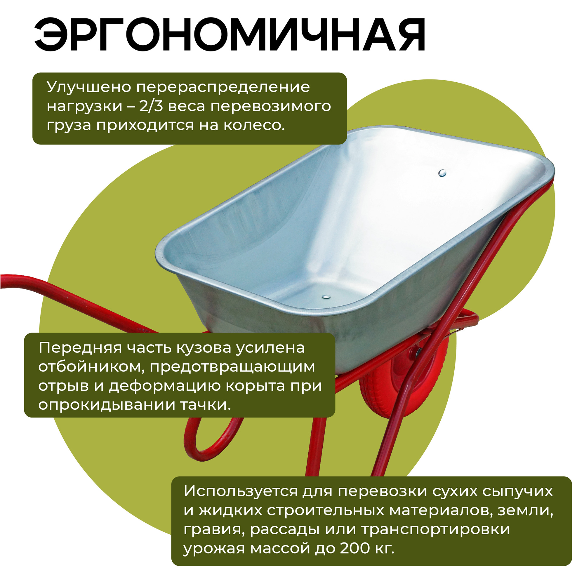 Тачка собирается на литом колесе из полимера ЭВА (этиленвинилацетат) с повышенной износостойкостью и сопротивлением повреждениям. Легко передвигается по уплотненному грунту или дороге.