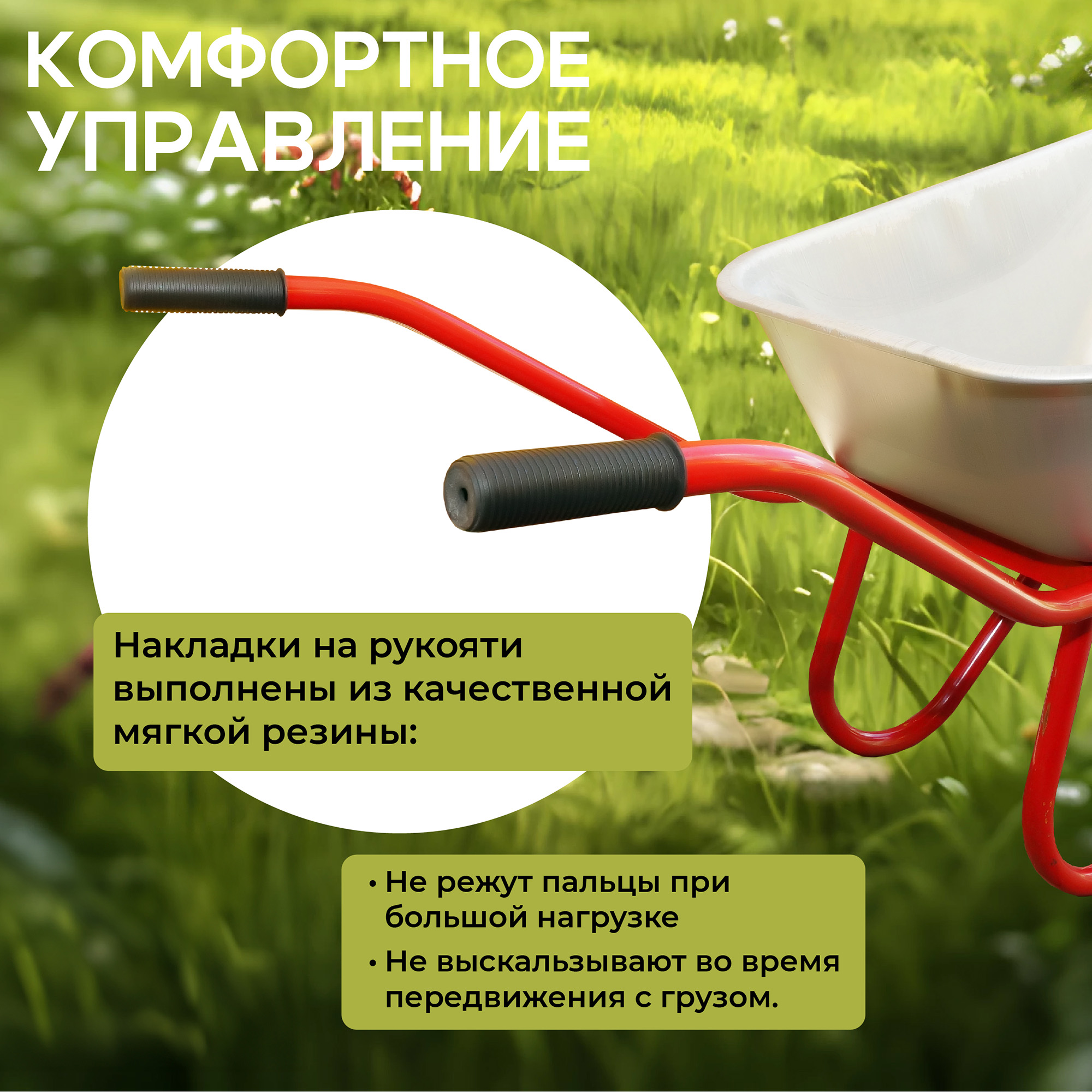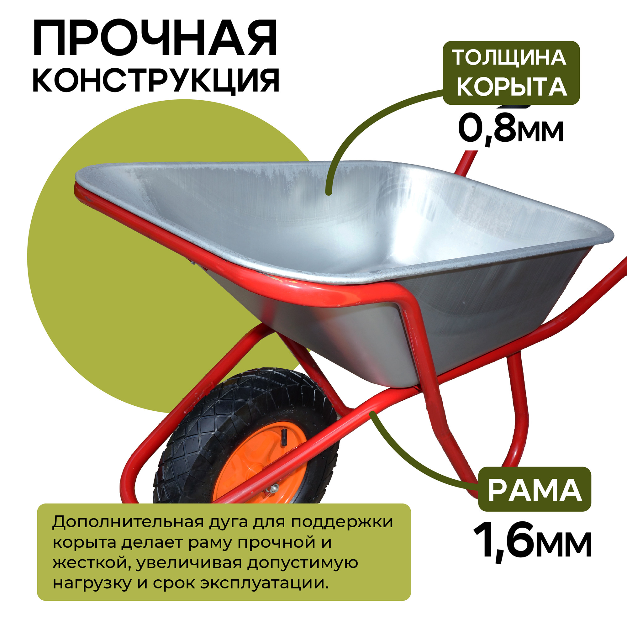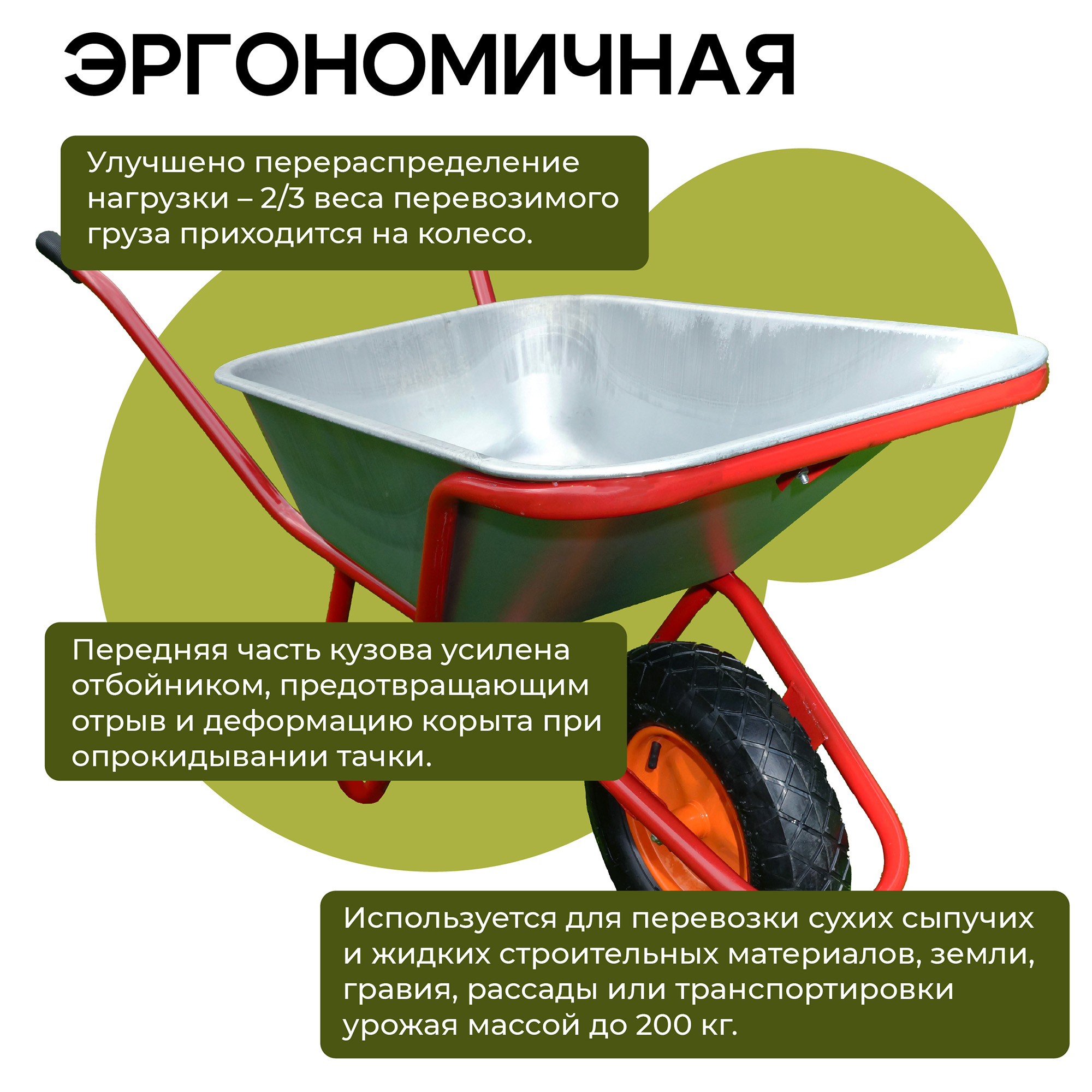 Тачка собирается на пневмоколесе из полимера ЭВА (этиленвинилацетат), что обеспечивает повышенную проходимость практически на любой неровной поверхности.