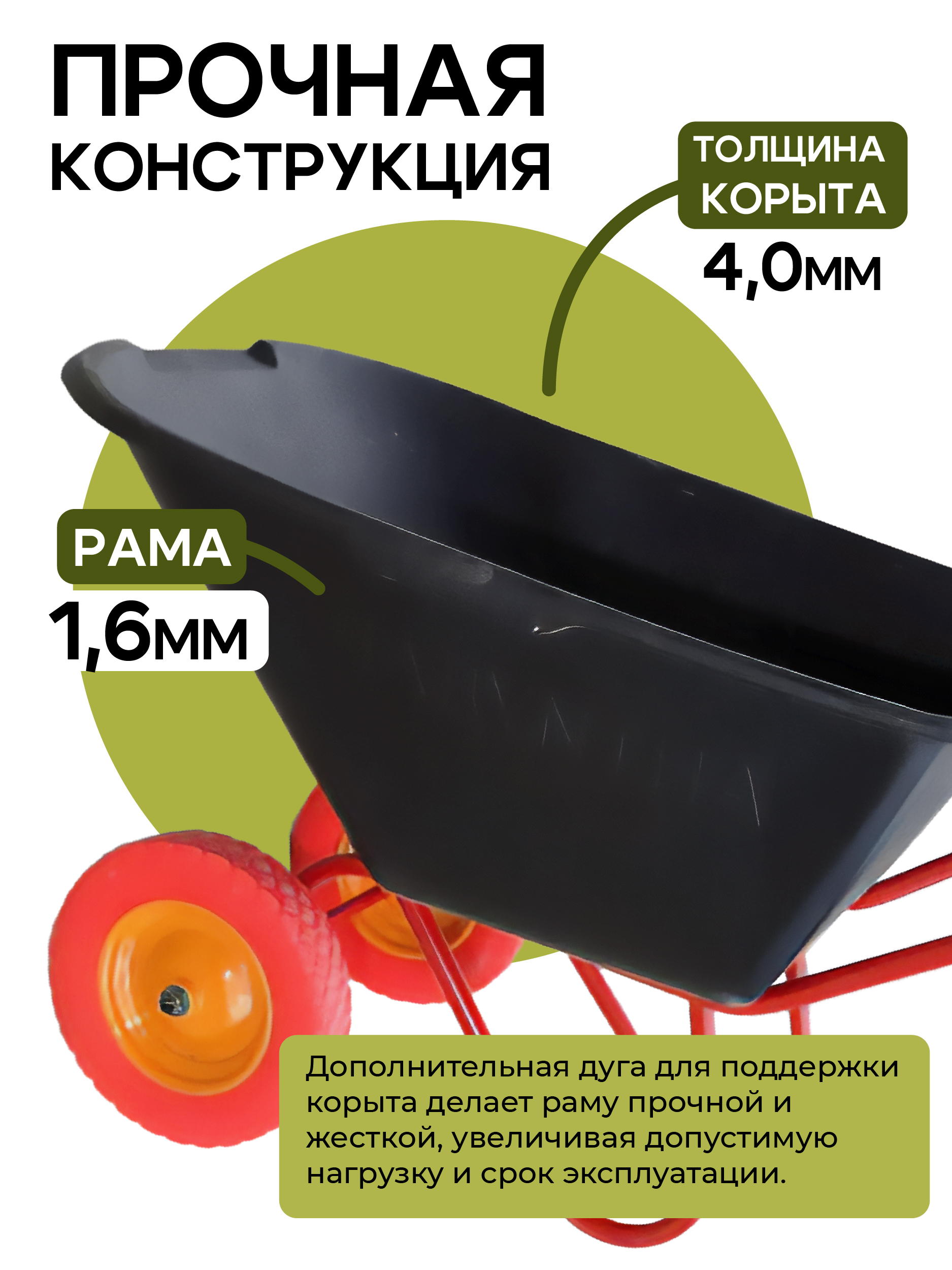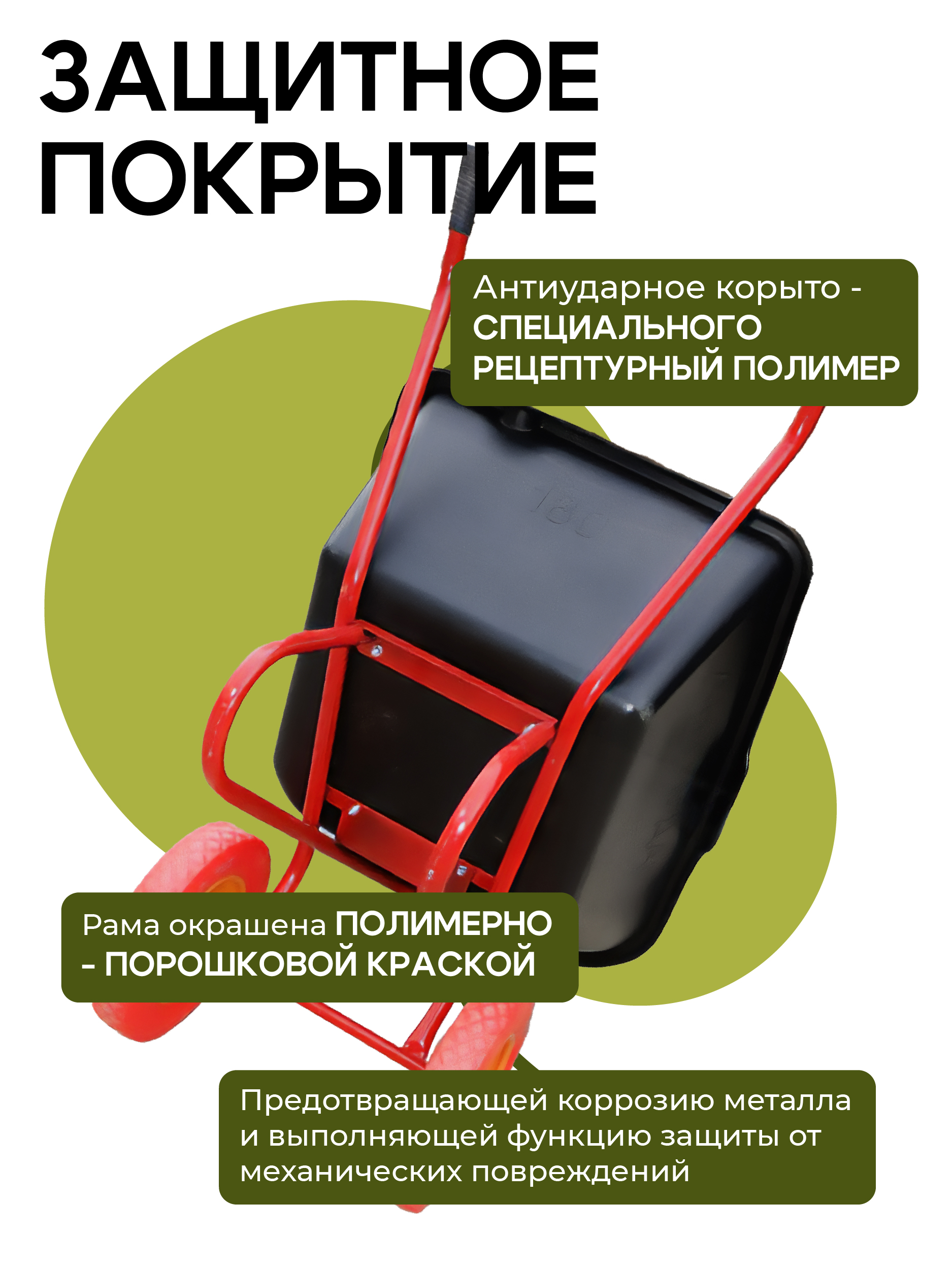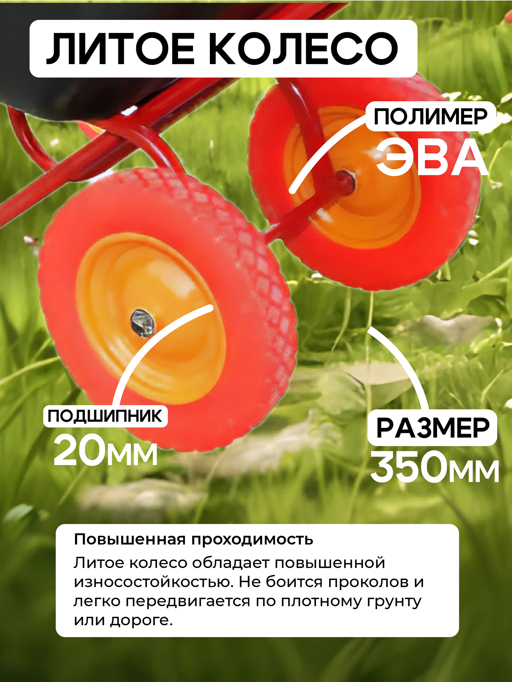 Тачка собирается на литых колесах из полимера ЭВА (этиленвинилацетат) с повышенной износостойкостью и сопротивлением повреждениям. Легко передвигается по уплотненному грунту или дороге.