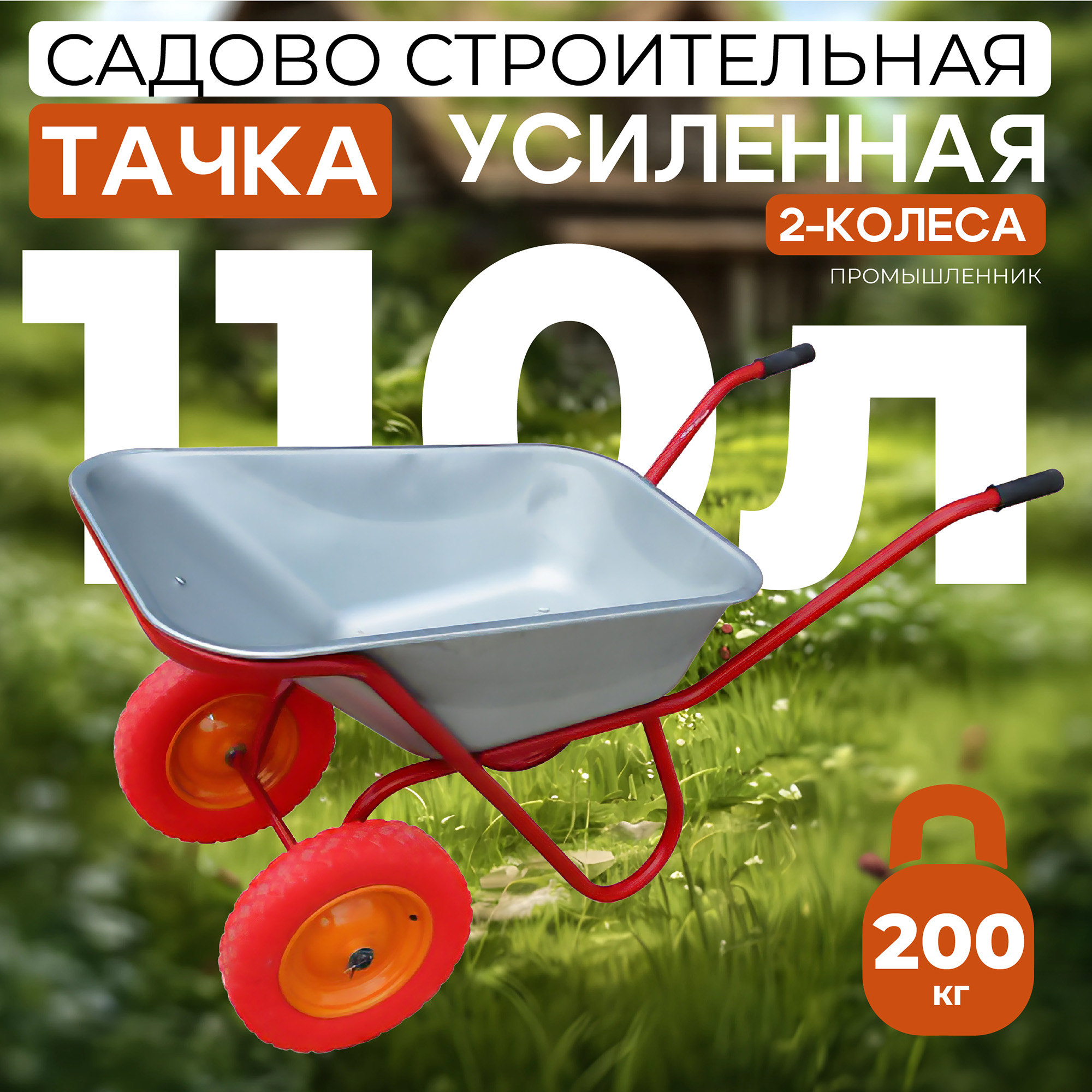 Тачка двухколесная усиленная 110 литров на литом колесе предназначена для садовых и строительных работ. Используется для перевозки сухих сыпучих и жидких строительных материалов, земли, гравия, рассады или транспортировки урожая массой до 200 кг.