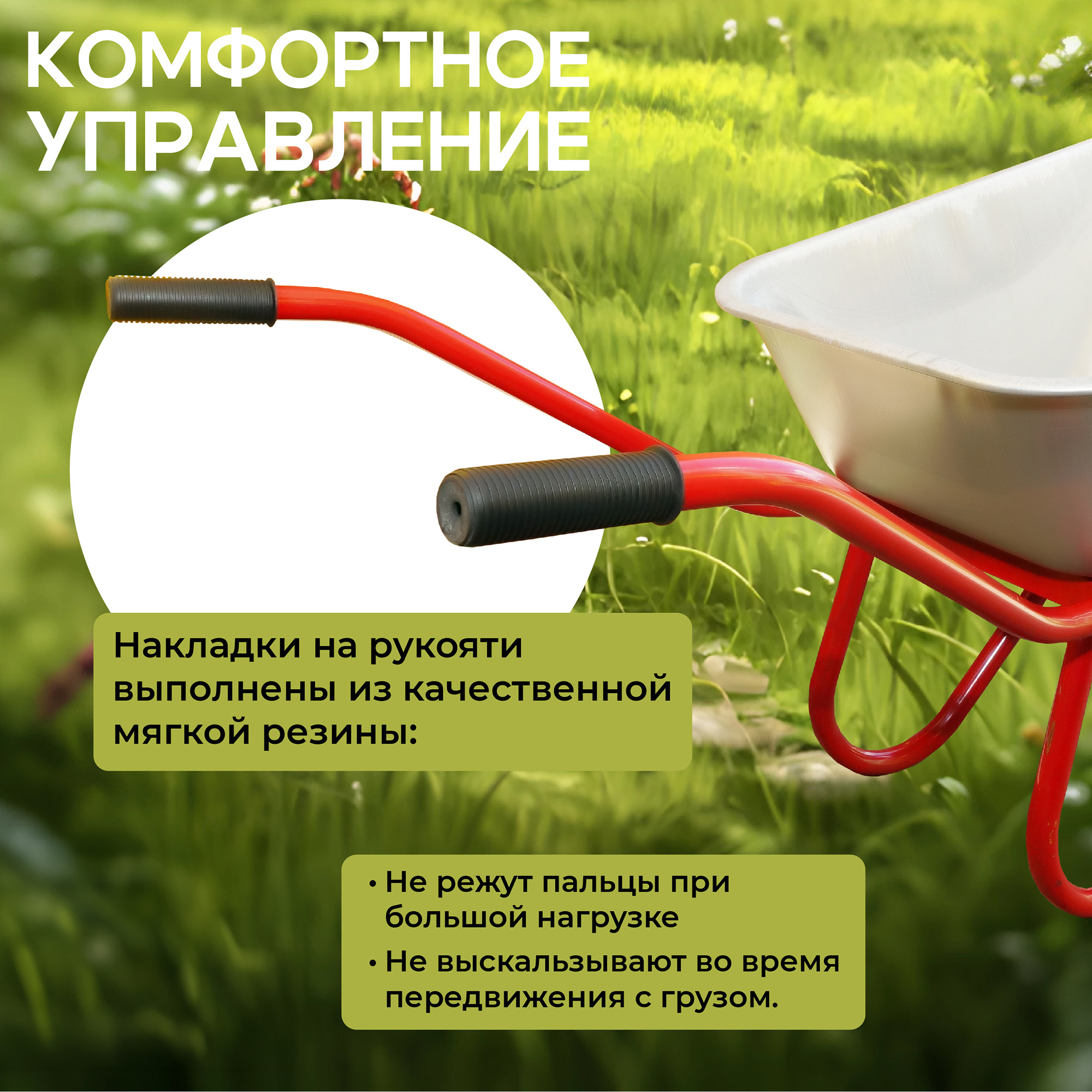 Тачка собирается на литых колесах из полимера ЭВА (этиленвинилацетат) с повышенной износостойкостью и сопротивлением повреждениям. Легко передвигается по уплотненному грунту или дороге.