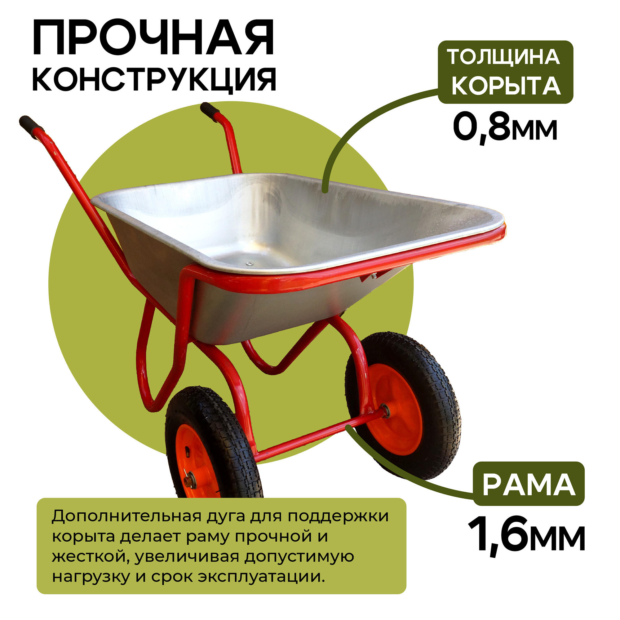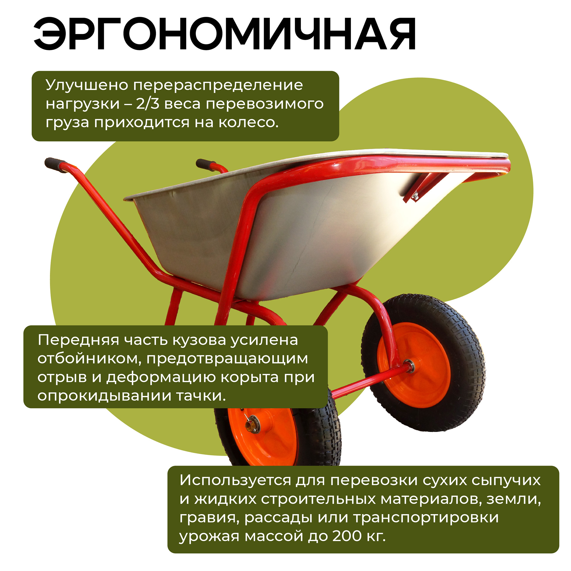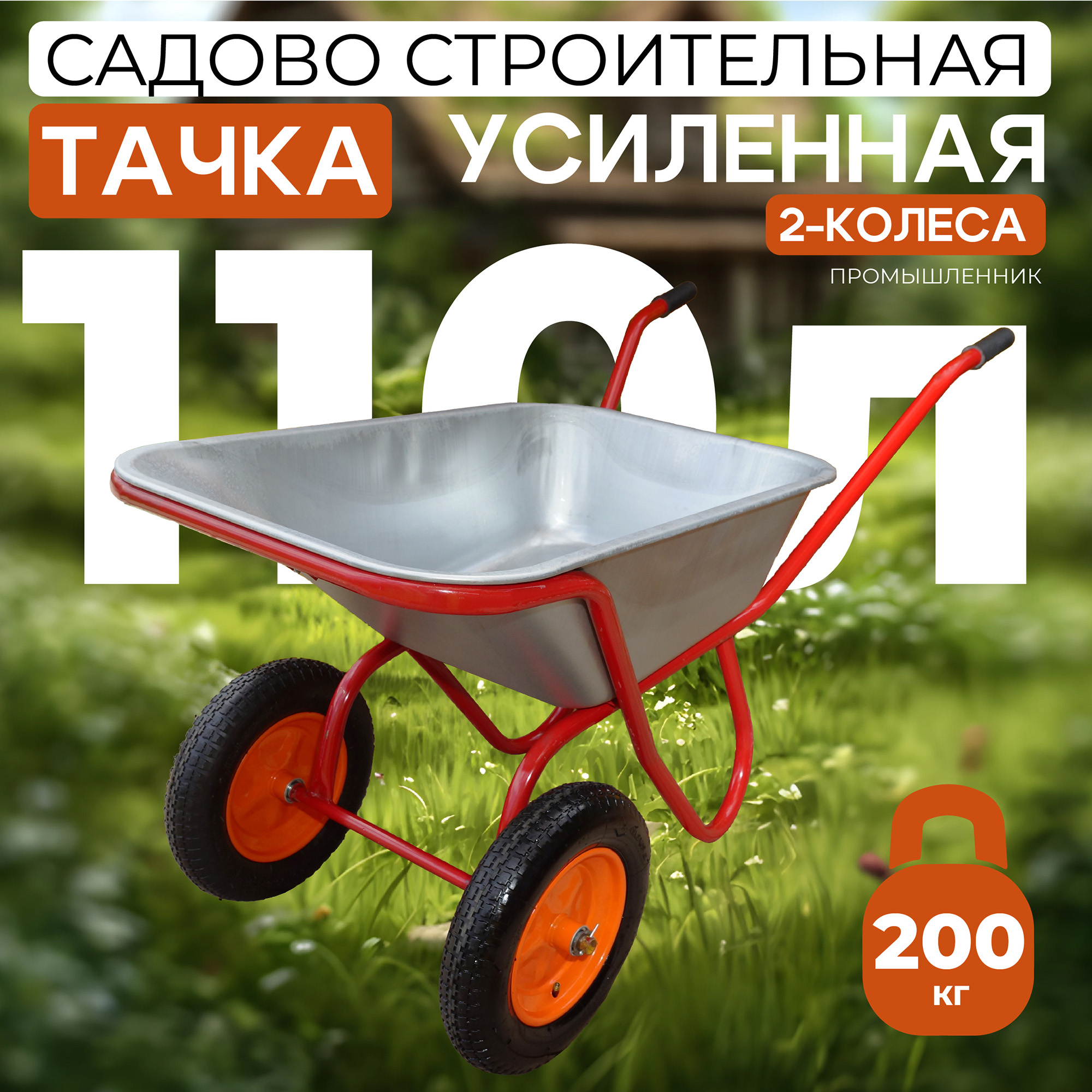 Тачка двухколесная усиленная 110 литров на пневмоколесе предназначена для садовых и строительных работ. Используется для перевозки сухих сыпучих и жидких строительных материалов, земли, гравия, рассады или транспортировки урожая массой до 200 кг.