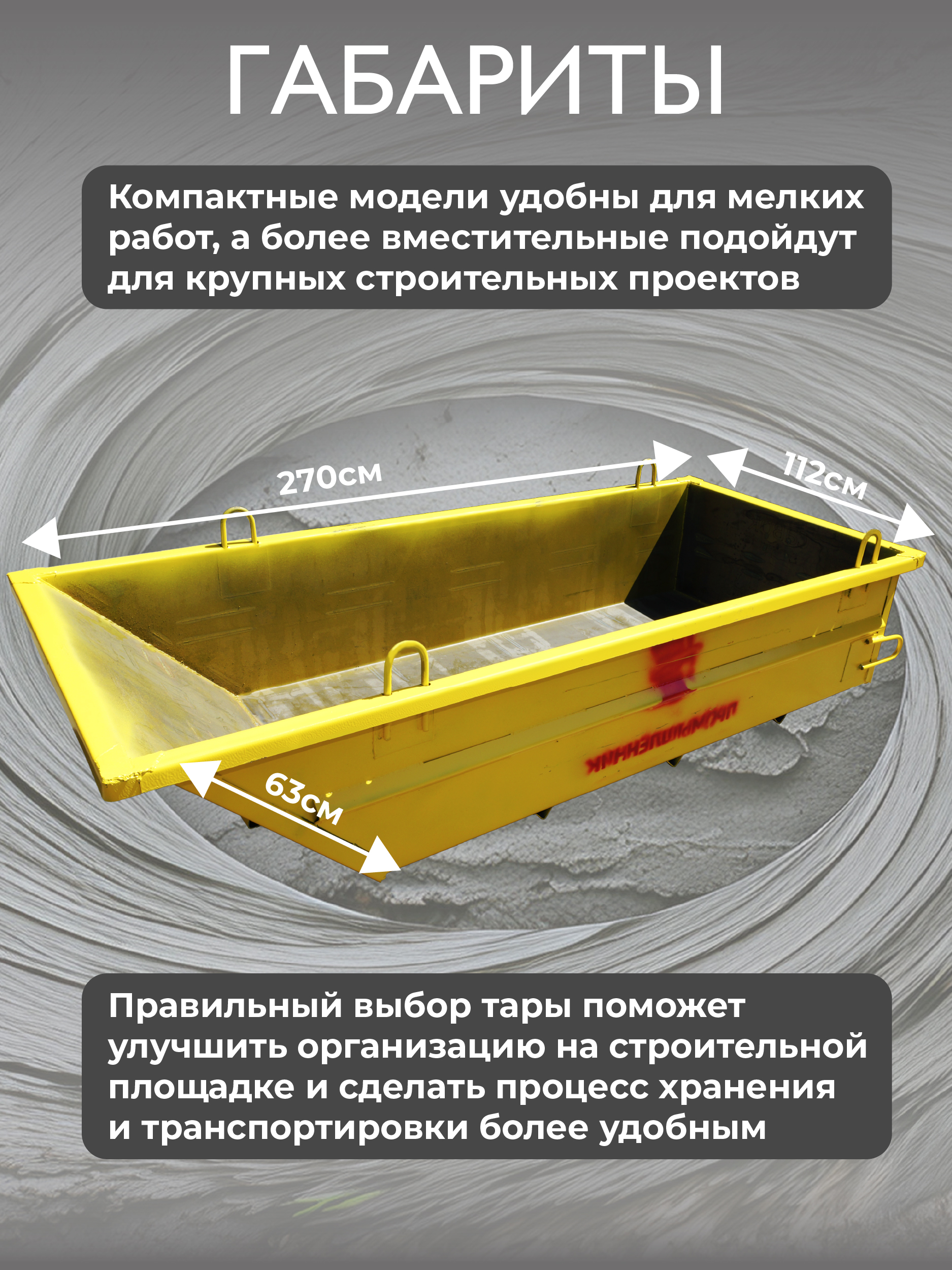 Тара для раствора ТР-1,0 м3 (г/п 2250 кг) используется преимущественно на крупных строительных объектах. Изготавливается из прочной углеродистой стали. Имеет петли-проушины для крепления строп и подъема краном. Нанесено защитное покрытие.