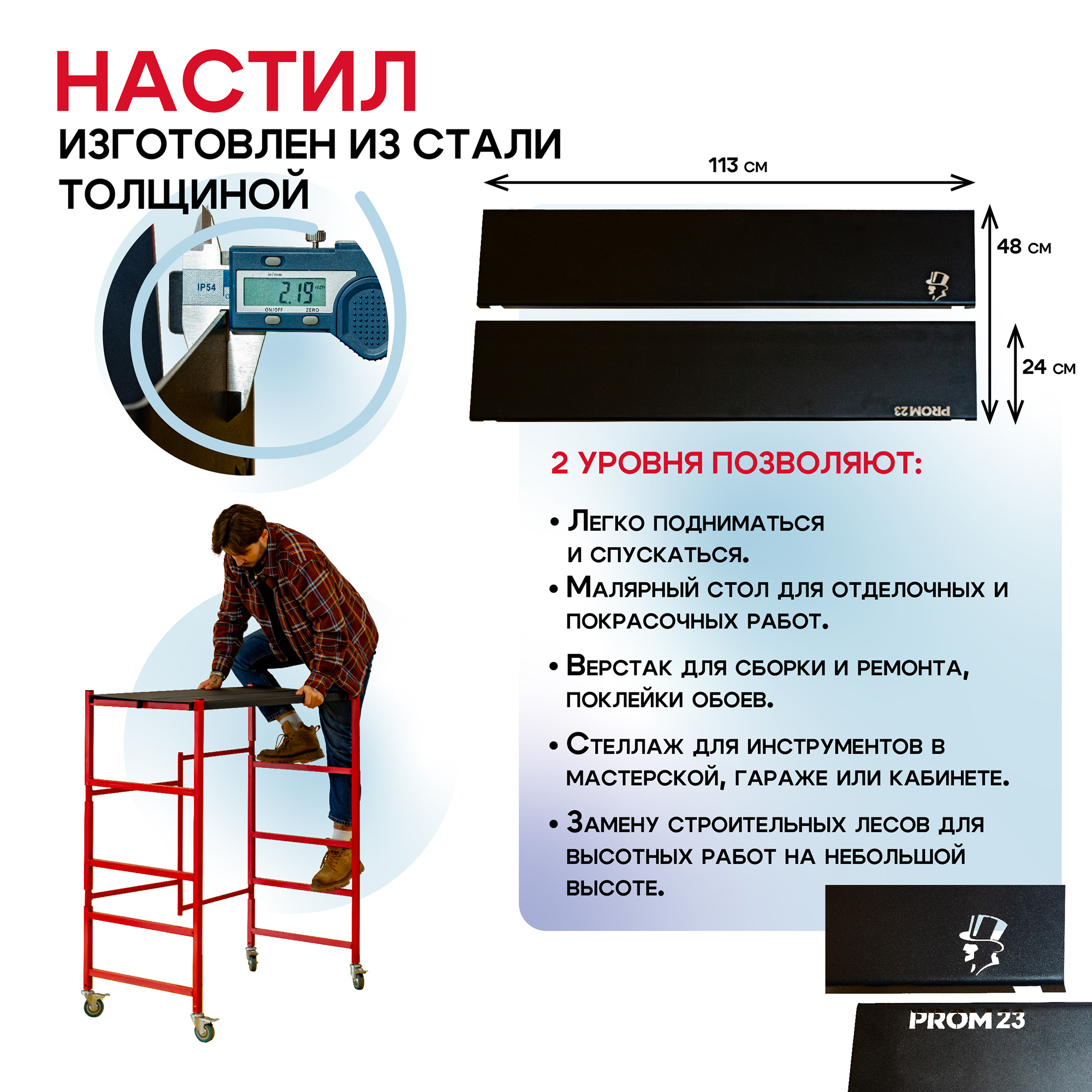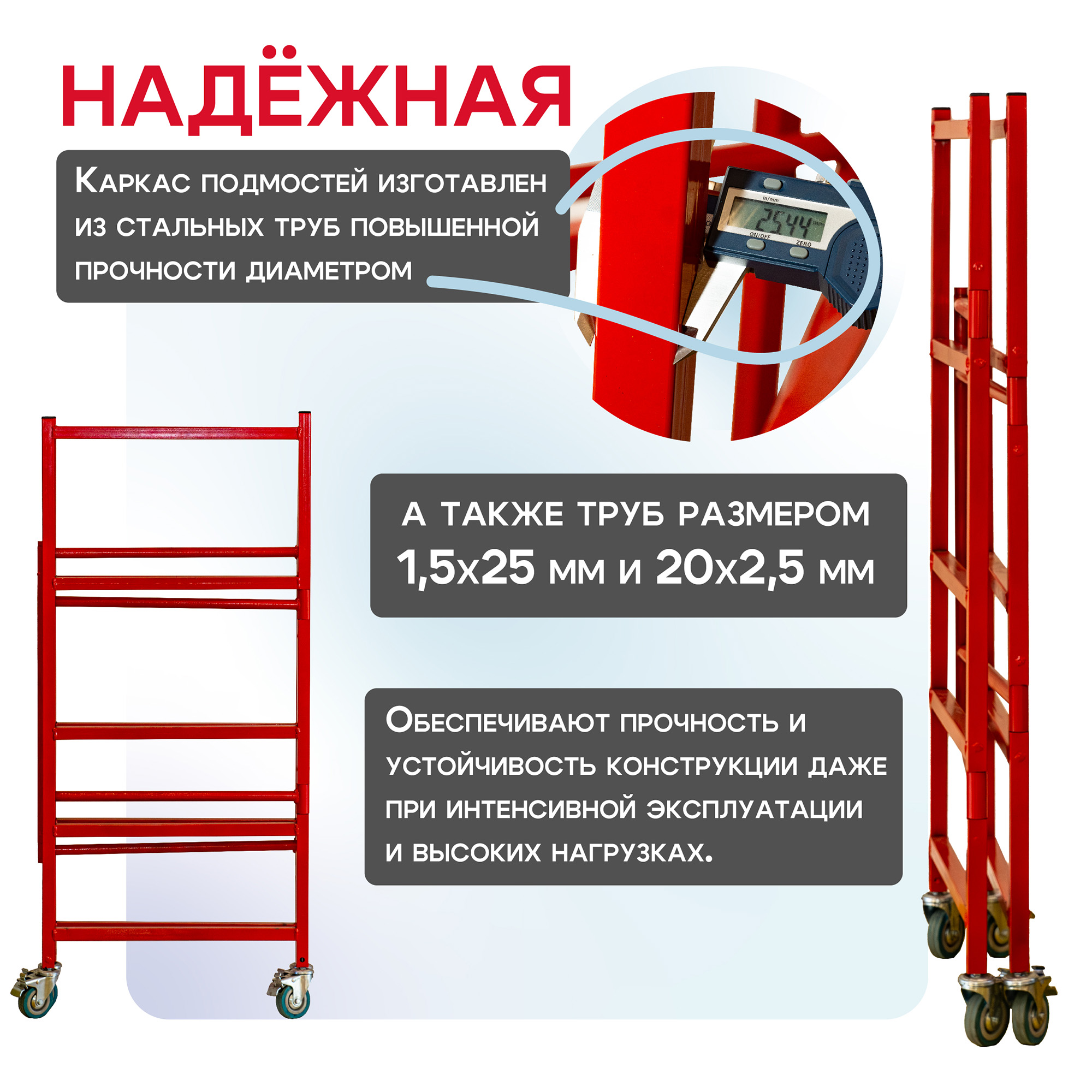 Каркас подмостей изготовлен из стальных труб повышенной прочности диаметром 25 мм , а также труб размером 1,5х25 мм и 20х2,5 мм. Это обеспечивает прочность и устойчивость конструкции даже при интенсивной эксплуатации и высоких нагрузках.