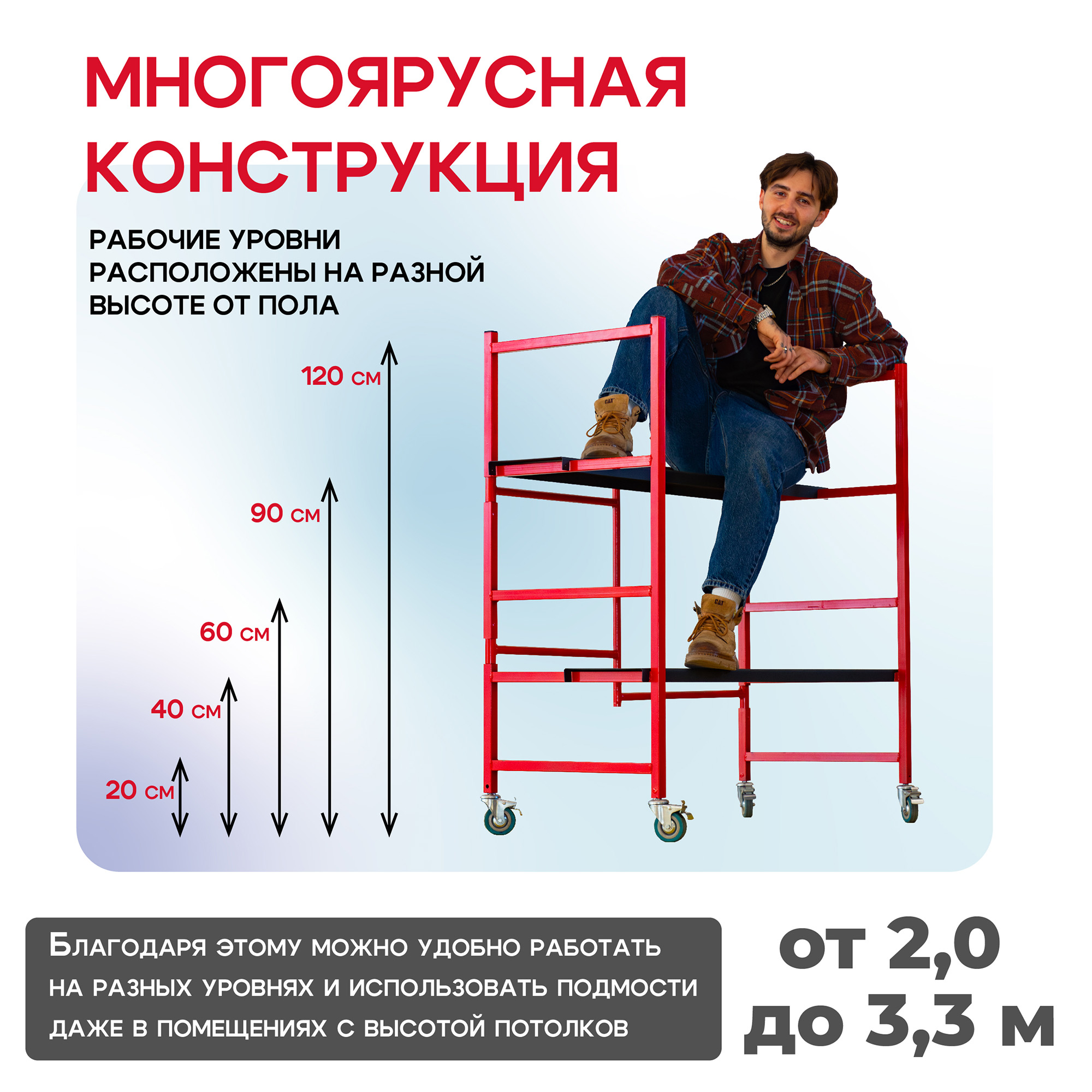 Рабочие уровни расположены на разной высоте от пола: 20 см, 40 см, 60 см, 90 см и 120 см. Благодаря этому можно удобно работать на разных уровнях и использовать подмости даже в помещениях с высотой потолков от 2 до 3,3 метров.