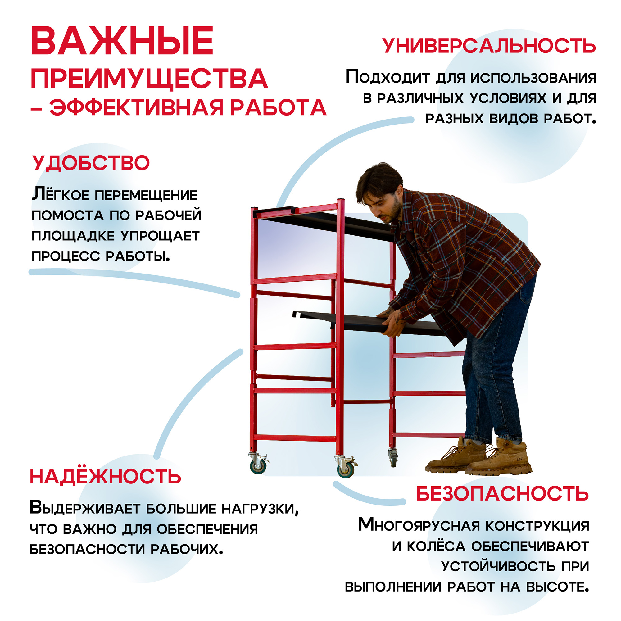 - Замену строительных лесов для высотных работ на небольшой высоте.