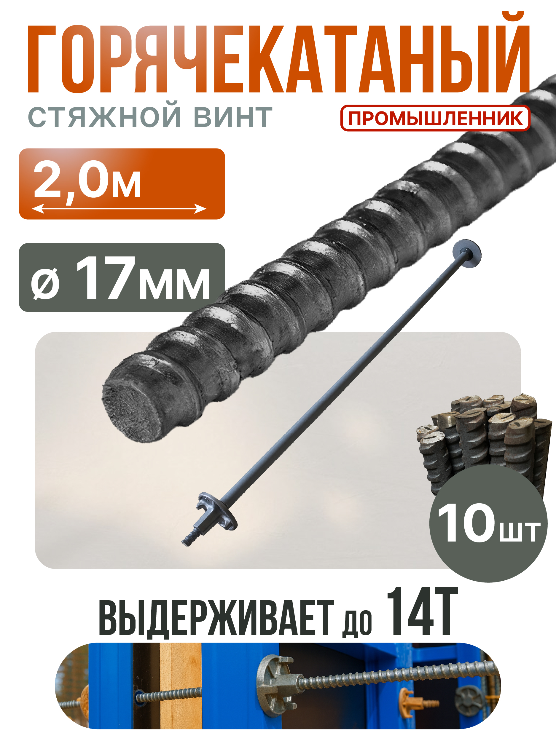 Винт стяжной горячекатаный 2,0 м. применяется в монолитном строительстве для стяжки щитов опалубки между собой. Используется в комплекте с двумя гайками, трубкой ПВХ и фиксатором арматуры «Конус». Изготовлен из горячекатаной стали. По центру имеет слегка приплюснутую форму, за счет чего фиксирующая гайка контрится на винте, держится плотнее и не соскальзывает при увеличении нагрузки. Накатная резьба выдерживает нагрузку до 14 т.