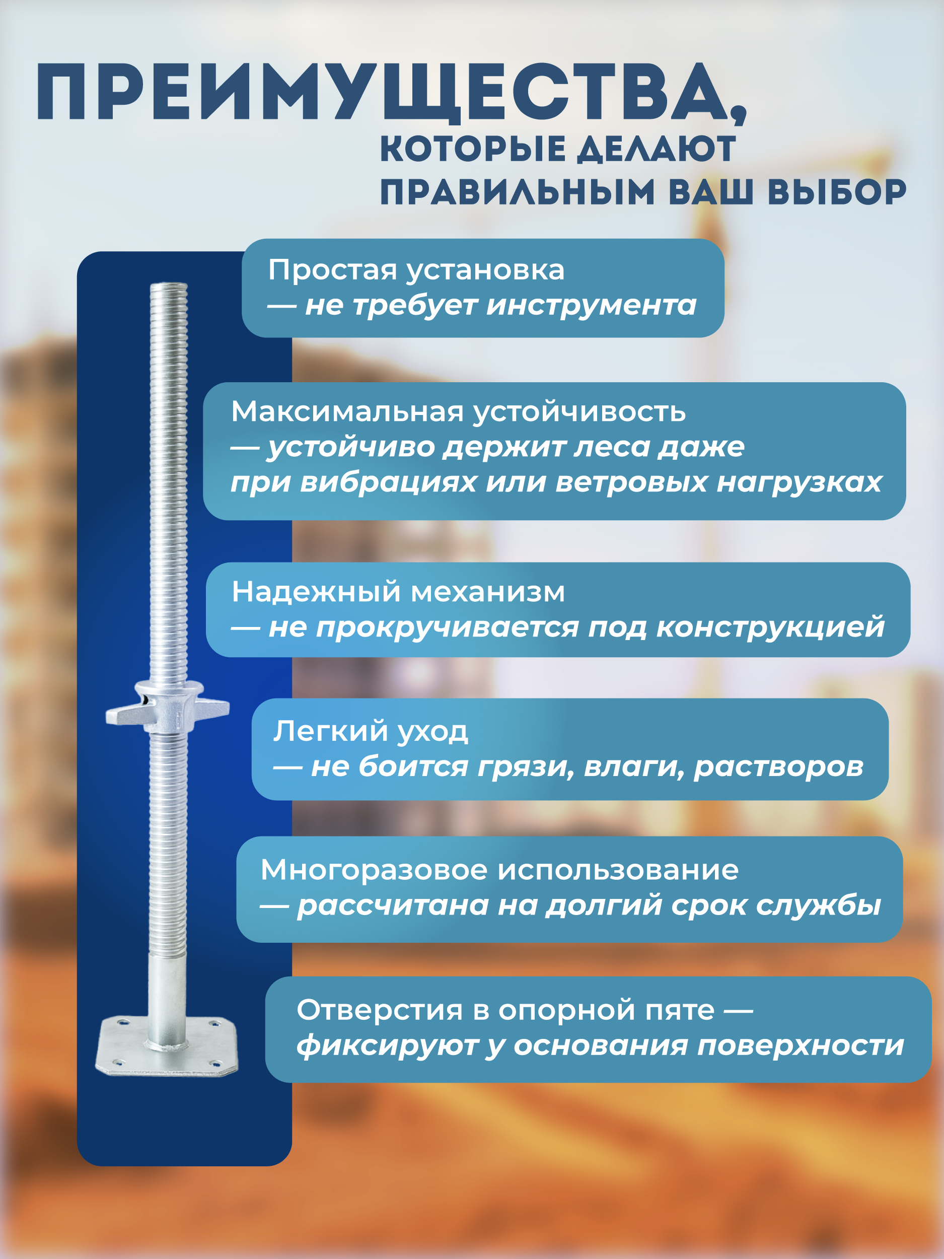 Главная » Каталог » Строительные леса » Связи, крепления, опоры строительных лесов » Винтовая опорная пята TeaM 0,35 м универсальная