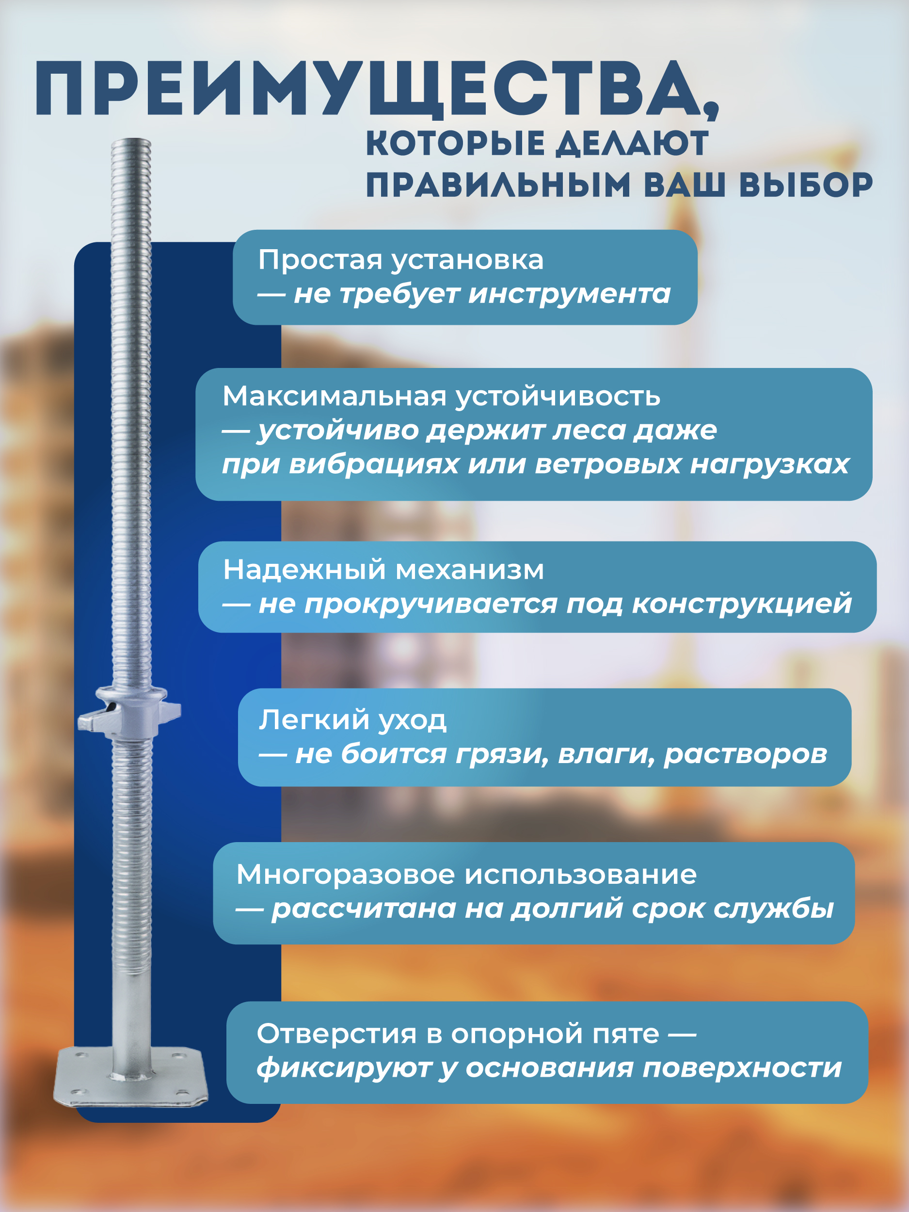 Главная » Каталог » Строительные леса » Связи, крепления, опоры строительных лесов » Винтовая опорная пята TeaM 0,8 м универсальная